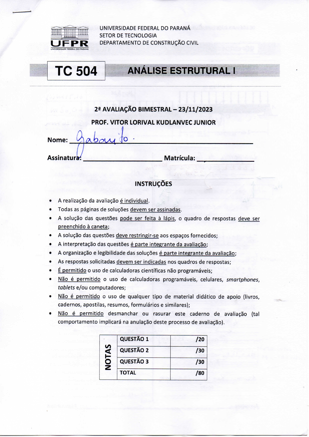 <p>UNIVERSIDADE FEDERAL DO PARANÁ SETOR DE TECNOLOGIA UFPR DEPARTAMENTO DE CONSTRUÇÃO CIVIL FEDERAL DO PARANA TC 504 ANÁLISE ESTRUTURAL I AVALIAÇÃO BIMESTRAL - 23/11/2023 PROF. VITOR LORIVAL KUDLANVEC JUNIOR Nome: Assinatura: Matrícula: INSTRUÇÕES A realização da avaliação é individual. Todas as páginas de soluções devem ser assinadas. A solução das questões pode ser feita à lápis, o quadro de respostas deve ser preenchido à caneta: A solução das questões deve restringir-se aos espaços fornecidos; A interpretação das questões é parte integrante da avaliação; A organização e legibilidade das soluções é parte integrante da avaliação; As respostas solicitadas devem ser indicadas nos quadros de respostas; É permitido o uso de calculadoras científicas não programáveis; Não é permitido o uso de calculadoras programáveis, celulares, smartphones, tablets e/ou computadores; Não é permitido o uso de qualquer tipo de material didático de apoio (livros, cadernos, apostilas, resumos, formulários e similares); Não é permitido desmanchar ou rasurar este caderno de avaliação (tal comportamento implicará na anulação deste processo de avaliação). QUESTÃO 1 /20 QUESTÃO 2 /30 QUESTÃO 3 /30 TOTAL /80</p><p>TC 504 - ANÁLISE ESTRUTURAL I AVALIAÇÃO BIMESTRAL 20 PONTOS QUESTÃO 01 Determine as forças normal e cortante e o momento fletor no ponto C da viga simplesmente apoiada. o ponto C está localizado à direita do momento de binário de 2,5 kN.m: - 5 pt 11,91KN(c) A B 30° -0,63KN C 2,5 kN m 21,26 KNm 2 m Diagroma de Corpo Analisc do C a direite eu HA A do moment. a VA 30 VB RB Mc Nc 11,91 Vc C 20,63 2m + + 1 + 30 RB VB Mc= HB & Assinatura Página 2 de 6</p><p>TC 504 - ANÁLISE ESTRUTURAL I AVALIAÇÃO BIMESTRAL 30 PONTOS QUESTÃO 02 Determine os diagramas de corpo livre e de força cortante e de momento fletor para a viga abaixo. 40 kN 50 kN/m B C 6 m 2 m 100 kN.m de d dx max 144 Ana lise pana BC Analisc pana trecho AB 100 x Mx n Vx + x=6 - - 2 120x - M=-180 KNm Assinatura Página 3 de 6</p><p>TC 504 - ANÁLISE ESTRUTURAL I AVALIAÇÃO BIMESTRAL 40 kN 50 kN/m A B Q 6 m 2 m 100 kN.m 40KN D.C.L. (5 pt.) 6m 220KN 120 + 40 + V [kN] (10 pt.) 180 180 100 M [kN.m] (15 pt.) + 144 Assinatura Página 4 de 6</p><p>TC 504 - ANÁLISE ESTRUTURAL I AVALIAÇÃO BIMESTRAL 30 PONTOS QUESTÃO 03 Considere a viga tipo Gerber abaixo. Esta viga precisa ser dimensionada de modo que os momentos fletores positivo e negativo tenham o menor valor possível. Determine o valor de "x" que torne esta premissa verdadeira. q X - 30 pt 0,172 2a I Para que or momentos mome at menous 2 x + 2 2 M+ MO= + - Viga 2 2 12 (l-x) 2 2 Momento maximo = = 8 = 4 a grou) Assinatura Página 5 de 6</p><p>TC 504 - ANÁLISE ESTRUTURAL I AVALIAÇÃO BIMESTRAL - 4l2 2 x 2 J I 2 n 2 pode l gubu estar a 17,2% do do do do Assinatura Página 6 de 6</p>
