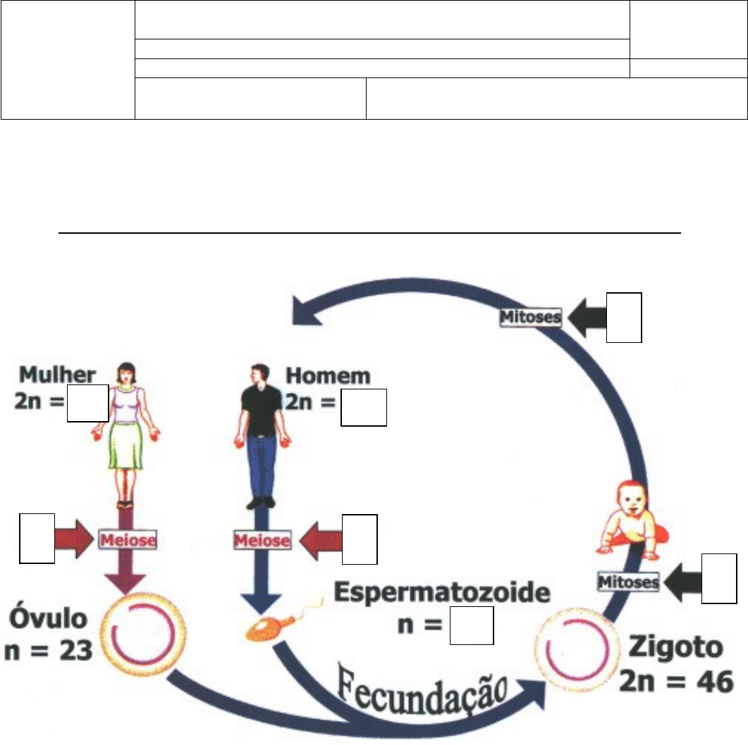 <p>Escola</p><p>NOTA</p><p>Professor (a):</p><p>Aluno (a):</p><p>Série:</p><p>Data:___/___/_______</p><p>Disciplina: Ciências</p><p>Instruções: 1) Leia atentamente as questões; 2) Utilize o verso, se necessário; 3) Esta prova tem peso 10,0 (Dez) pontos; 4) Serão observados aspectos explicativos e estéticos na resolução das questões; 5) Duração para resolução de 1 (uma) aula; 6) Os telefones celulares deverão permanecer desligados durante a realização da prova; 7) Não será permitido ir ao banheiro durante a realização da prova; 8) O aluno que for encontrado “colando” terá sua prova anulada sem direito a qualquer recurso; 9) Utilizar caneta azul ou preta para a resolução das questões.</p><p>AVALIAÇÃO DE BIOLOGIA – NÚCLEO E DIVISÃO CELULAR (PARTE 1)</p><p>1. Analise a imagem abaixo e responda:</p><p>?B</p><p>?A A</p><p>?C</p><p>B</p><p>A</p><p>A</p><p>B</p><p>A) O que as setas com a letra “A” representam? Justifique.</p><p>B) O que as setas com a letra “B” representam? Justifique.</p><p>C) O que significa a letra “n” na imagem? Justifique.</p><p>D) Quais valores seriam mais corretos para seres completados nos seguintes códigos:</p><p>(A) ?A:</p><p>(B) ?B:</p><p>(C) ?C:</p><p>2. Analise a imagem abaixo e descreva detalhadamente todos os processos que estão acontecendo em cada quadrado. B)</p><p>A)</p><p>3. Analise a imagem abaixo e descreva a explicação para o uso dos caracteres “o,0,8,oo” como representação da divisão celular. Cite qual o tipo de divisão celular que está sendo observado.</p><p>4. Analise a frase a seguir e responda o que se pede:</p><p>“Uma célula com 14 cromossomos</p><p>sofre meiose.”</p><p>a) Quantas células-filhas ela produz?</p><p>b) Quantos cromossomos cada célula-filha possui?</p><p>c) A célula-mãe é haploide ou diploide?</p><p>d) A célula-filha é haploide ou diploide?</p><p>5. Analise a frase a seguir e responda o que se pede:</p><p>“Uma célula com 48 cromossomos</p><p>sofre mitose.”</p><p>a) Quantas células-filhas ela produz?</p><p>b) Quantos cromossomos cada célula-filha possui?</p><p>c) A célula-mãe é haploide ou diploide?</p><p>d) A célula-filha é haploide ou diploide?</p><p>6. Analise as células abaixo e descreva quais são células haploides e/ou diploides. Justifique.</p><p>7. Identifique a meiose e a mitose.</p><p>A)___________ B)______________</p><p>8. Uma célula com 16 cromossomos, ao sofrer meiose, produz:</p><p>a) 4 células com 16 cromossomos.</p><p>b) 2 células com 8 cromossomos.</p><p>c) 2 células com 16 cromossomos.</p><p>d) 4 células com 8 cromossomos.</p><p>e) 8 células com 16 cromossomos.</p><p>9. Uma célula com 16 cromossomos, ao sofrer mitose, produz:</p><p>a) 4 células com 16 cromossomos.</p><p>b) 2 células com 8 cromossomos.</p><p>c) 2 células com 16 cromossomos.</p><p>d) 4 células com 8 cromossomos.</p><p>e) 8 células com 16 cromossomos.</p><p>10. Mitose é o processo de divisão celular através do qual, via de regra, uma célula …I… origina células …II… com um número …III… de cromossomos.</p><p>Para completar corretamente a frase, os espaços I, II e III devem ser substituídos, respectivamente, por:</p><p>a) diplóide – haplóides – n.</p><p>b) diplóide – haplóides – 2n.</p><p>c) diplóide – diplóides – 2n.</p><p>d) haplóide – diplóides – 2n.</p><p>e) haplóide – diplóides – n.</p><p>11. Em relação ao processo de divisão celular, podemos afirmar que:</p><p>a) a mitose consiste em duas divisões celulares sucessivas.</p><p>b) os óvulos e os espermatozóides são produzidos por divisões mitóticas.</p><p>c) durante a meiose não ocorre a permutação ou "crossing-over".</p><p>d) a meiose é um processo que dá origem a quatro células haplóides.</p><p>e) durante a mitose as cromátides irmãs não se separam.</p><p>12. Analise a imagem abaixo de diferentes células e responda:</p><p>1</p><p>2</p><p>3</p><p>4</p><p>a) Quais células são haploides e quais são diploides?</p><p>b) Quantos “n” a célula 1 e a 3 possuem no total?</p><p>c) Quantos “n” a célula 1 e a 2 possuem no total?</p><p>d) Quantos “n” a célula 3 e a 4 possuem no total?</p><p>13. Em relação à mitose, responda ao que se pede.</p><p>a) Em que tipos celulares ocorrem esse fenômeno de divisão?</p><p>b) Qual a importância desse processo para esses organismos?</p><p>14. Em relação à meiose, responda ao que se pede.</p><p>a) Em que tipos celulares ocorrem esse fenômeno de divisão?</p><p>b) Qual a importância desse processo para esses organismos?</p><p>image1.jpeg</p><p>image2.png</p><p>image3.jpeg</p><p>image4.jpeg</p><p>image5.png</p>