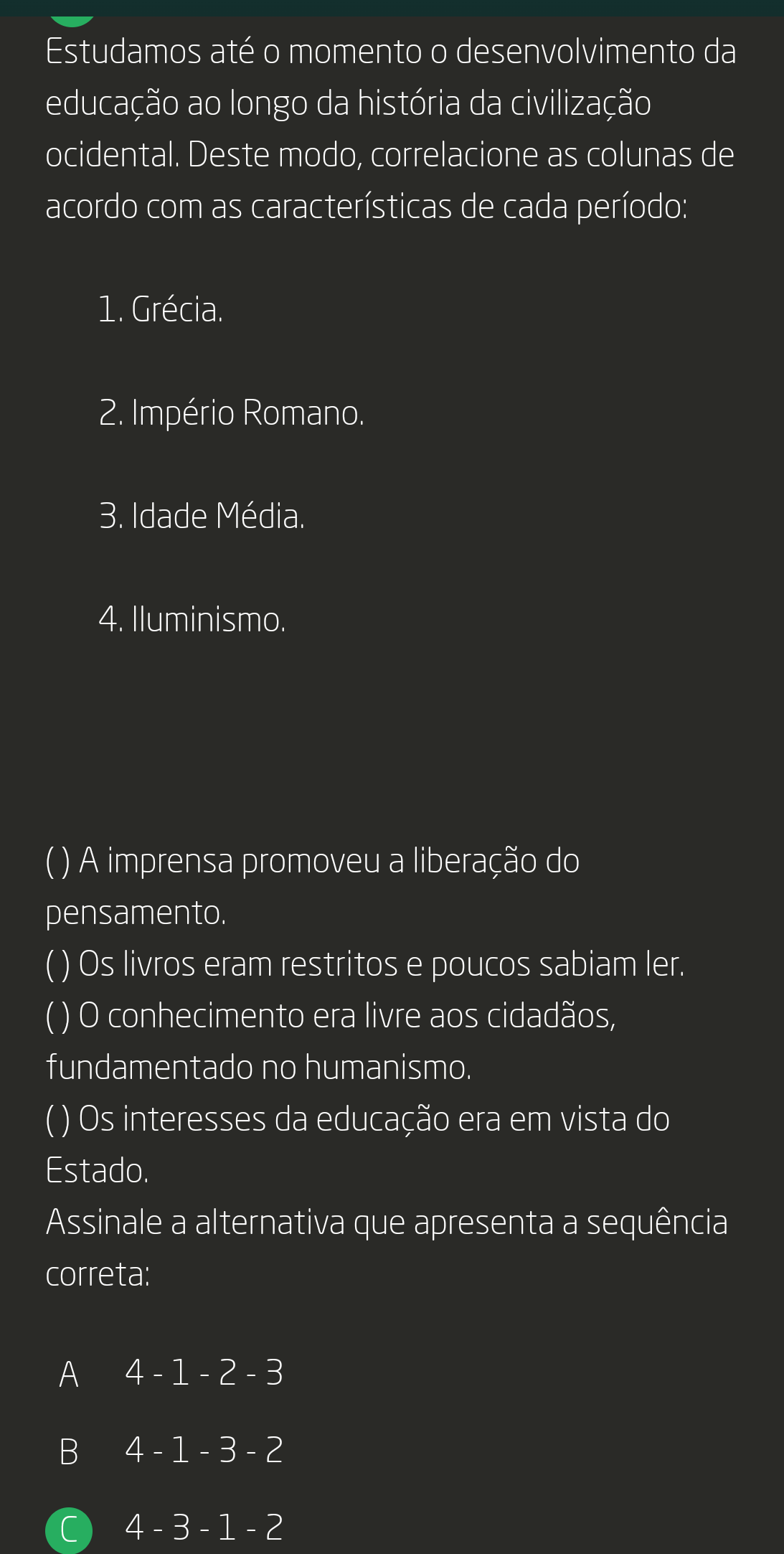<p>Estudamos até O momento O desenvolvimento da educação ao longo da história da civilização ocidental. Deste modo, correlacione as colunas de acordo com as características de cada período: 1. Grécia. 2. Império Romano. 3. Idade Média. 4. () A imprensa promoveu a liberação do pensamento. () Os livros eram restritos e poucos sabiam ler. () O conhecimento era livre aos cidadãos, fundamentado no humanismo. () Os interesses da educação era em vista do Estado. Assinale a alternativa que apresenta a correta: A 4-1-2-3 4-1-3-2 C 4-3-1-2</p>