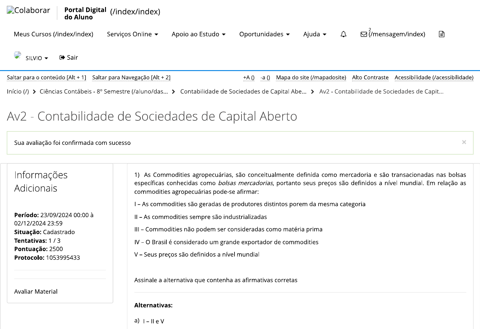 <p>Colaborar Portal Digital (/index/index) do Aluno 2 Meus Cursos (/index/index) Serviços Online Apoio ao Estudo Oportunidades Ajuda (/mensagem/index) SILVIO Sair Saltar para o conteúdo [Alt + 1] Saltar para Navegação -a () Mapa do site (/mapadosite) Alto Contraste Acessibilidade (/acessibilidade) Início (/) > Ciências Contábeis 8° Semestre (/aluno/das... Contabilidade de Sociedades de Capital Abe... > Av2 Contabilidade de Sociedades de Capit... Av2 Contabilidade de Sociedades de Capital Aberto Sua avaliação foi confirmada com sucesso Informações 1) As Commodities agropecuárias, são conceitualmente definida como mercadoria e são transacionadas nas bolsas específicas conhecidas como bolsas mercadorias, portanto seus preços são definidos a nível mundial. Em relação as Adicionais commodities agropecuárias pode-se afirmar: - As commodities são geradas de produtores distintos porem da mesma categoria Período: 23/09/2024 00:00 à II - As commodities sempre são industrializadas 02/12/2024 23:59 Situação: Cadastrado III - Commodities não podem ser consideradas como matéria prima Tentativas: IV - - Brasil é considerado um grande exportador de commodities Pontuação: 2500 Protocolo: 1053995433 V - Seus preços são definidos a nível mundial Assinale a alternativa que contenha as afirmativas corretas Avaliar Material Alternativas: a) - e V</p><p>b) III e IV 4) Em relação aos modelos de Governança no Brasil pode-se perceber que o modelo que se predomina é o Insider System, isto devido a inúmera quantidade de empresas familiares, dos e) IV e V Alternativa assinalada quais nesta categoria se predomina a posse. Este modelo de gestão conhecido como Insider System vem no Brasil nos 2) Adquirir ações de companhias nos dias de hoje vem se tornando algo muito praticável no mercado financeiro, visto últimos anos sendo substituídos por que para as organizações refletem uma busca na alavancagem de lucratividade e para as pessoas refletem um outro modelo, o outsider System investimento uma possível garantia de uma aposentadoria. PORQUE - O que se comenta muito nos dias de hoje é a tão discutida e falada governança corporativa, denotando ao público Vem crescendo a cada dia que passa os processos, costumes, politicas, leis, enfim a transparência para a sociedade. Pode-se dizer que a governança o número de acionistas no mercado corporativa está intimamente ligada à valorização das ações de uma determinada empresa. acionário. PORQUE Quanto mais a empresa se demonstrar transparente, mais correta e responsável maior será a aceitação desta Agora, assinale a alternativa que empresa no mercado refletindo ai um aumento significativo no valor de suas ações contenha a resposta correta Agora, assinale a alternativa que contenha a resposta correta Alternativas: a) Alternativas: As duas asserções são proposições verdadeiras e a segunda é uma a) As duas asserções são proposições verdadeiras e a segunda é uma justificativa correta da justificativa correta da primeira Alternativa assinalada primeira Alternativa assinalada b) A primeira asserção é uma proposição verdadeira e a segunda, uma proposição falsa c) A primeira asserção é uma proposição falsa, porém a segunda é uma proposição verdadeira d) Tanto a primeira quanto a segunda proposição são asserções falsas e) As duas asserções são proposições verdadeiras, mas a segunda, não é uma justificativa correta da primeira</p><p>3) Quando compramos ações de empresas passamos a ser acionistas da empresa que se refere as ações. A partir daí passamos a compartilhar os lucros e infelizmente também os prejuízos. Os acionistas são classificados distintamente conforme a quantidade de ações e os poderes que de acordo com as ações lhes são conferidos. acionista pode ser este pode ser representado por um grupo, uma empresa ou mesmo por uma pessoa física que tem o controle da companhia, pois adquiriu esse poder à partir de uma eleição, o acionista também pode ser este detém boa parte de ações ordinárias, as quais devem corresponder a mais da metade do total de ações emitidas e também pode ser , este vem a ser o que detém uma pequena parcela na participação da companhia. Assinale a alternativa que preencha corretamente as lacunas Alternativas: a) controlador - majoritário - minoritário Alternativa assinalada b) minoritário - acionador - majoritário c) acionador - majoritário - minoritário d) controlador - acionador - majoritário e) controlador - acionador - minoritário b) A primeira asserção é uma proposição verdadeira e a segunda, uma proposição falsa c) A primeira asserção é uma proposição falsa, porém a segunda é uma proposição verdadeira d) Tanto a primeira quanto a segunda proposição são asserções falsas</p><p>e) As duas asserções são proposições verdadeiras, mas a segunda, não é uma justificativa correta da primeira 5) A Governança Corporativa é um modelo de gestão muito utilizado e interessante para as empresas provadas de capital aberto, em relação ao mundo dos negócios. Para isso a BOVESPA cria níveis diferenciados com a finalidade de mensurar a governança corporativa de empresas brasileiras listadas na Bolsa. Podemos considerar a classificação destes níveis como: Assinale a alternativa que contenha a resposta correta Alternativas: a) Nível - Nível e Novo Mercado Alternativa assinalada b) Nível Básico - Nível intermediário e Nível Avançado c) Nível Comercial - Nível Industrial - Nível Público d) Nível - Nível Novo Mundo e) Nível Básico - Nível intermediário e Novo mercado</p>