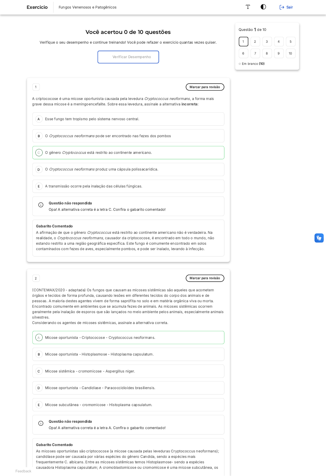 <p>Você acertou 0 de 10 questões</p><p>Verifique o seu desempenho e continue treinando! Você pode refazer o exercício quantas vezes quiser.</p><p>Verificar Desempenho</p><p>A</p><p>B</p><p>C</p><p>D</p><p>E</p><p>A</p><p>B</p><p>C</p><p>D</p><p>E</p><p>1 Marcar para revisão</p><p>A criptococose é uma micose oportunista causada pela levedura Cryptococcus neoformans, a forma mais</p><p>grave dessa micose é a meningoencefalite. Sobre essa levedura, assinale a alternativa incorreta:</p><p>Esse fungo tem tropismo pelo sistema nervoso central.</p><p>O Cryptococcus neoformans pode ser encontrado nas fezes dos pombos</p><p>O gênero Cryptococcus está restrito ao continente americano.</p><p>O Cryptococcus neoformans produz uma cápsula polissacarídica.</p><p>A transmissão ocorre pela inalação das células fúngicas.</p><p>Questão não respondida</p><p>Opa! A alternativa correta é a letra C. Confira o gabarito comentado!</p><p>Gabarito Comentado</p><p>A afirmação de que o gênero Cryptococcus está restrito ao continente americano não é verdadeira. Na</p><p>realidade, o Cryptococcus neoformans, causador da criptococose, é encontrado em todo o mundo, não</p><p>estando restrito a uma região geográfica específica. Este fungo é comumente encontrado em solos</p><p>contaminados com fezes de aves, especialmente pombos, e pode ser inalado, levando à infecção.</p><p>2 Marcar para revisão</p><p>�CONTEMAX/2020 - adaptada) Os fungos que causam as micoses sistêmicas são aqueles que acometem</p><p>órgãos e tecidos de forma profunda, causando lesões em diferentes tecidos do corpo dos animais e de</p><p>pessoas. A maioria destes agentes vivem de forma saprófita no solo e em matéria orgânica viva ou morta.</p><p>Encontrado comumente em ambientes que se acumula fezes de animais. As micoses sistêmicas ocorrem</p><p>geralmente pela inalação de esporos que são lançados no meio ambiente pelos animais, especialmente animais</p><p>silvestres.</p><p>Considerando os agentes de micoses sistêmicas, assinale a alternativa correta.</p><p>Micose oportunista - Criptococose - Cryptococcus neoformans.</p><p>Micose oportunista - Histoplasmose - Histoplasma capsulatum.</p><p>Micose sistêmica - cromomicose - Aspergillus niger.</p><p>Micose oportunista - Candidíase - Paracoccidioides brasiliensis.</p><p>Micose subcutânea - cromomicose - Histoplasma capsulatum.</p><p>Questão não respondida</p><p>Opa! A alternativa correta é a letra A. Confira o gabarito comentado!</p><p>Gabarito Comentado</p><p>As micoses oportunistas são criptococose (a micose causada pelas leveduras Cryptococcus neoformans);</p><p>candidíase pode ser causada por várias espécies do gênero Candida, sendo a espécies mais</p><p>frequentemente C. albicans. Entre as micoses sistêmicas temos Histoplasmose- sendo a espécies</p><p>causadora Histoplasma capsulatum; A cromoblastomicose ou cromomicose é uma micose subcutânea, os</p><p>Questão 1 de 10</p><p>Em branco �10�</p><p>1 2 3 4 5</p><p>6 7 8 9 10</p><p>Feedback</p><p>Exercicio Fungos Venenosos e Patogênicos Sair</p><p>A</p><p>B</p><p>C</p><p>D</p><p>E</p><p>A</p><p>B</p><p>C</p><p>D</p><p>E</p><p>agentes causadores dessa micose são fungos pertencentes aos gêneros Fonsecaea, Rhinocladiella,</p><p>Cladophialophora e Phialophora.</p><p>3 Marcar para revisão</p><p>�AMEOSC/2021 - adaptada) As micoses subcutâneas são infecções que acomentem camadas da pele mais</p><p>profundas do que aquelas acometidas nas micoses superficiais. Uma doença dessa categoria é a</p><p>esporotricose cujos esporos podem entrar por meio de cortes e abrasões na pele e infectar tecidos</p><p>subcutâneos.</p><p>Com relação à esporotricose, marque a alternativa correta.</p><p>É uma doença fúngica, e o organismo causador, Sporothrix schenckii uma levedura e tem alto risco de</p><p>transmissão pela mordedura e/ou arranhadura de animais infectados, como os morcegos.</p><p>É uma doença fúngica, e o organismo causador, Sporothrix schenckii é um fungo dimórfico. É</p><p>considerada uma zoonose emergente, de impactos à saúde pública, sendo os gatos os principais</p><p>animais afetados e associados à transmissão aos humanos.</p><p>É causada pelo fungo Histoplasma capsulatum, um protozoário esporulado que nos eqüinos apresenta</p><p>distribuição mundial.</p><p>É uma doença causada pelo protozoário Trichophyton e infecções nos pés e em outras superfícies</p><p>úmidas da pele são bastante comuns, que, em geral, não invadem o tecido subcutâneo, ficando suas</p><p>infecções restritas aos extratos queratinizados da pele e anexos.</p><p>É uma doença fúngica, e o organismo causador, Sporothrix schenckii , cujo o exame micológico direto</p><p>da lesão revela hifas septadas hialinas.</p><p>Questão não respondida</p><p>Opa! A alternativa correta é a letra B. Confira o gabarito comentado!</p><p>Gabarito Comentado</p><p>A esporotricose é a micose subcutânea mais prevalente da América Latina e é classicamente causada por</p><p>fungos dimórficos do gênero Sporothrix. Podem ser encontrados principalmente em zonas tropicais e</p><p>subtropicais associados à matéria orgânica em decomposição. O S. schenckii pode ser achado no mundo</p><p>todo, já o S. globosa é mais encontrado na Ásia, enquanto o S. brasiliensis ainda é restrito à América do</p><p>Sul. Como em todas as micoses subcutâneas, para a transmissão da esporotricose, é necessário um</p><p>trauma cutâneo, geralmente causado por alguma matéria orgânica vegetal contaminada com o fungo, que</p><p>pode ser um espinho, um tronco de árvore ou um galho. Apesar dessa via clássica de transmissão, no</p><p>Brasil, principalmente no Rio de Janeiro, a esporotricose assumiu caráter zoonótico, o que significa que</p><p>existe um animal, o gato doméstico com esporotricose, envolvido na transmissão dessa doença. O gato</p><p>com esporotricose, ao mesmo tempo em que é um hospedeiro víti