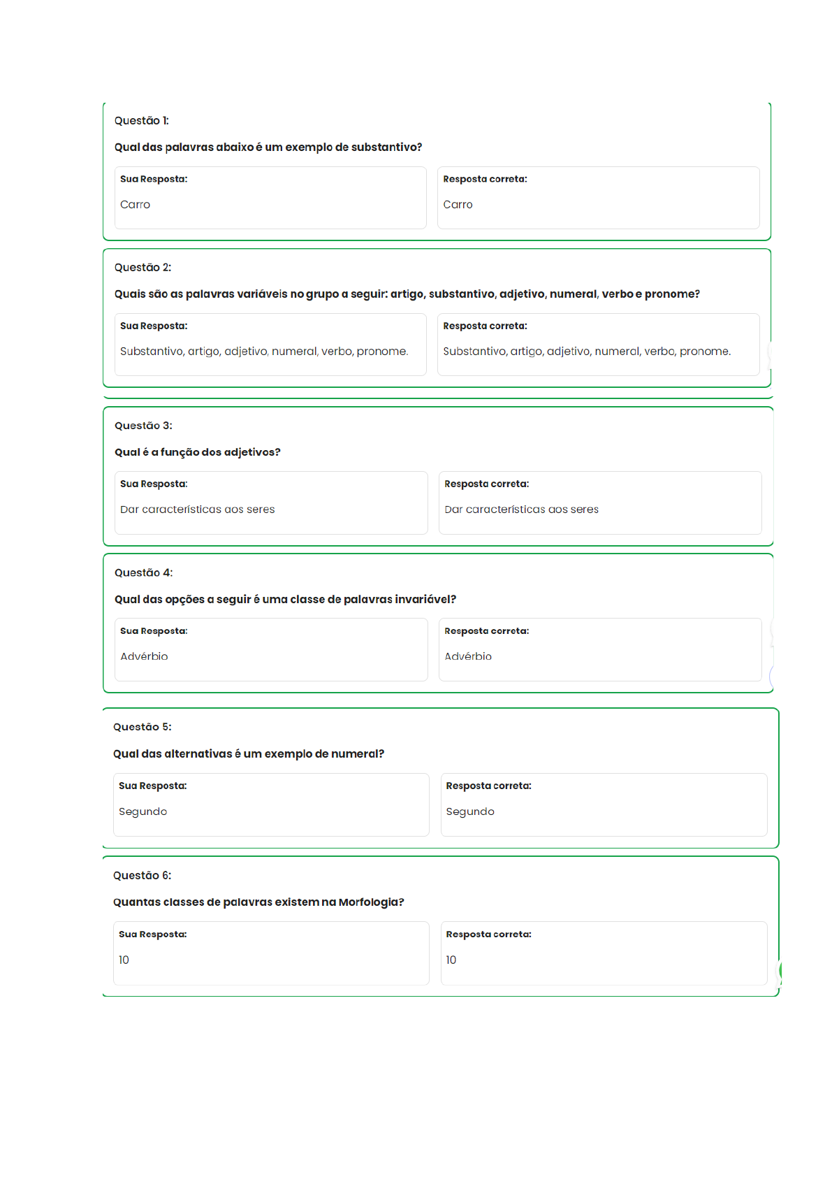 <p>Questão 1: Qual das palavras abaixo é um exemplo de substantivo? Sug Resposta: Resposta correta: Carro Carro Questão 2: Quais são as palavras variáveis no grupo a seguir: artigo, substantivo, adjetivo, numeral, verbo e pronome? Resposta: Resposta correta: Substantivo, artigo, adjetivo, numeral, verbo, pronome. Substantivo, artigo, adjetivo, numeral, verbo, pronome. Questão 3: Qual é a função dos adjetivos? Sug Resposta: Resposta correta: Dar características aos seres Dar características aos seres Questão 4: Qual das opções a seguir é uma classe de palavras invariável? Sug Resposta: Resposta correta: Advérbio Advérbio Questão 5: Qual das alternativas é um exemplo de numeral? Resposta: Resposta correta: Segundo Segundo Questão 6: Quantas classes de palavras existem na Morfologia? Sua Resposta: Resposta correta: 10 10</p><p>Questão 7: A palavra "mas" na frase "Queria ir, mas não pude" é um exemplo de qual classe? Resposta: Resposta correta: Conjunção Conjunção Questão 8: Quais são as classes de palavras variáveis? Resposta: Resposta correta: Substantivo, adjetivo, artigo, numeral, verbo, pronome. Substantivo, adjetivo, artigo, numeral, verbo, pronome. Questão 9: ? Contestar questão que é Morfologia? Resposta: Resposta correta: A parte da gramática que estuda a formação das A parte da gramática que estuda as palavras fora de orações. contexto. Questão 10: As palavras da classe invariável variam conforme o contexto? Resposta: Resposta correta: Não Não</p>