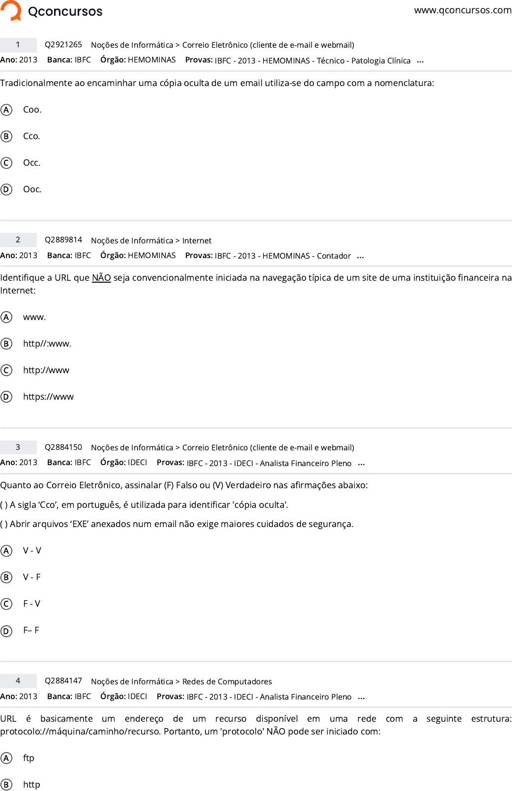 <p>www.qconcursos.com</p><p>Ano: 2013 Banca: IBFC Órgão: HEMOMINAS</p><p>Tradicionalmente ao encaminhar uma cópia oculta de um email utiliza-se do campo com a nomenclatura:</p><p>A Coo.</p><p>B Cco.</p><p>C Occ.</p><p>D Ooc.</p><p>Ano: 2013 Banca: IBFC Órgão: HEMOMINAS</p><p>Identi�que a URL que NÃO seja convencionalmente iniciada na navegação típica de um site de uma instituição �nanceira na</p><p>Internet:</p><p>A www.</p><p>B http//:www.</p><p>C http://www</p><p>D https://www</p><p>Ano: 2013 Banca: IBFC Órgão: IDECI</p><p>Quanto ao Correio Eletrônico, assinalar (F) Falso ou (V) Verdadeiro nas a�rmações abaixo:</p><p>( ) A sigla ‘Cco’, em português, é utilizada para identi�car 'cópia oculta'.</p><p>( ) Abrir arquivos ‘EXE’ anexados num email não exige maiores cuidados de segurança.</p><p>A V - V</p><p>B V - F</p><p>C F - V</p><p>D F– F</p><p>Ano: 2013 Banca: IBFC Órgão: IDECI</p><p>URL é basicamente um endereço de um recurso disponível em uma rede com a seguinte estrutura:</p><p>protocolo://máquina/caminho/recurso. Portanto, um 'protocolo' NÃO pode ser iniciado com:</p><p>A ftp</p><p>B http</p><p>1 Q2921265 >Noções de Informática Correio Eletrônico (cliente de e-mail e webmail)</p><p>Provas: IBFC - 2013 - HEMOMINAS - Técnico - Patologia Clínica ...</p><p>2 Q2889814 >Noções de Informática Internet</p><p>Provas: IBFC - 2013 - HEMOMINAS - Contador ...</p><p>3 Q2884150 >Noções de Informática Correio Eletrônico (cliente de e-mail e webmail)</p><p>Provas: IBFC - 2013 - IDECI - Analista Financeiro Pleno ...</p><p>4 Q2884147 >Noções de Informática Redes de Computadores</p><p>Provas: IBFC - 2013 - IDECI - Analista Financeiro Pleno ...</p><p>https://www.qconcursos.com/</p><p>https://www.qconcursos.com/questoes-de-concursos/bancas/ibfc</p><p>https://www.qconcursos.com/questoes-de-concursos/institutos/hemominas</p><p>https://www.qconcursos.com/questoes-de-concursos/bancas/ibfc</p><p>https://www.qconcursos.com/questoes-de-concursos/institutos/hemominas</p><p>https://www.qconcursos.com/questoes-de-concursos/bancas/ibfc</p><p>https://www.qconcursos.com/questoes-de-concursos/institutos/ideci</p><p>https://www.qconcursos.com/questoes-de-concursos/bancas/ibfc</p><p>https://www.qconcursos.com/questoes-de-concursos/institutos/ideci</p><p>https://www.qconcursos.com/questoes-de-concursos/questoes/756b78bddb4</p><p>https://www.qconcursos.com/questoes-de-concursos/disciplinas/tecnologia-da-informacao-nocoes-de-informatica</p><p>https://www.qconcursos.com/questoes-de-concursos/disciplinas/tecnologia-da-informacao-nocoes-de-informatica/correio-eletronico-cliente-de-e-mail-e-webmail</p><p>https://www.qconcursos.com/questoes-de-concursos/provas/ibfc-2013-hemominas-tecnico</p><p>https://www.qconcursos.com/questoes-de-concursos/questoes/fb53474dad6</p><p>https://www.qconcursos.com/questoes-de-concursos/disciplinas/tecnologia-da-informacao-nocoes-de-informatica</p><p>https://www.qconcursos.com/questoes-de-concursos/disciplinas/tecnologia-da-informacao-nocoes-de-informatica/internet</p><p>https://www.qconcursos.com/questoes-de-concursos/provas/ibfc-2013-hemominas-contador</p><p>https://www.qconcursos.com/questoes-de-concursos/questoes/752ac63d40d</p><p>https://www.qconcursos.com/questoes-de-concursos/disciplinas/tecnologia-da-informacao-nocoes-de-informatica</p><p>https://www.qconcursos.com/questoes-de-concursos/disciplinas/tecnologia-da-informacao-nocoes-de-informatica/correio-eletronico-cliente-de-e-mail-e-webmail</p><p>https://www.qconcursos.com/questoes-de-concursos/provas/ibfc-2013-ideci-analista-financeiro-pleno</p><p>https://www.qconcursos.com/questoes-de-concursos/questoes/3e24cd4a646</p><p>https://www.qconcursos.com/questoes-de-concursos/disciplinas/tecnologia-da-informacao-nocoes-de-informatica</p><p>https://www.qconcursos.com/questoes-de-concursos/disciplinas/tecnologia-da-informacao-nocoes-de-informatica/redes-de-computadores</p><p>https://www.qconcursos.com/questoes-de-concursos/provas/ibfc-2013-ideci-analista-financeiro-pleno</p><p>C usb</p><p>D HTTPS</p><p>Ano: 2016 Banca: IBFC Órgão: Câmara de Franca - SP</p><p>O malware denominado Trojan Horse (Cavalo de Troia) NÃO é considerado com sendo um vírus de computador pois eles:</p><p>A não dependem da execução desse arquivo.</p><p>B não têm como objetivo prejudicar o usuário.</p><p>C somente apresentam propagandas.</p><p>D não criam réplicas.</p><p>Ano: 2016 Banca: IBFC Órgão: Câmara de Franca - SP</p><p>Quanto aos browsers de internet, analise as a�rmativas abaixo, dê valores Verdadeiro (V) ou Falso (F) e assinale a alternativa</p><p>que apresenta a sequência correta (de cima para baixo):</p><p>( ) tanto o Firefox como o Internet Explorer permitem o uso do protocolo HTTPS.</p><p>( ) o Chrome é o único browser que não permite que seja utilizado numa Intranet.</p><p>A V-V</p><p>B V-F</p><p>C F-V</p><p>D F-F</p><p>Ano: 2016 Banca: IBFC Órgão: Câmara de Franca - SP</p><p>Assinale o tipo de cabo mais utilizado como mídia padrão em um sistema de cabeamento estruturado:</p><p>A cabo paralelo.</p><p>B cabo de �bra ótica.</p><p>C cabo coaxial.</p><p>D cabo de par trançado.</p><p>Ano: 2016 Banca: IBFC Órgão: Câmara de Franca - SP</p><p>5 Q2792585</p><p>>Noções de Informática Internet , Segurança da Informação , Malware (vírus, worms e pragas virtuais)</p><p>Princípios de Segurança, Con�dencialidade e Assinatura Digital</p><p>Prova: IBFC - 2016 - Câmara de Franca - SP - Técnico - Manutenção em</p><p>Hardware</p><p>6 Q2792580 >Noções de Informática Internet</p><p>Prova: IBFC - 2016 - Câmara de Franca - SP - Técnico - Manutenção em</p><p>Hardware</p><p>7 Q2792573 >Noções de Informática Redes de Computadores</p><p>Prova: IBFC - 2016 - Câmara de Franca - SP - Técnico - Manutenção em</p><p>Hardware</p><p>8 Q2792530 >Noções de Informática Redes de Computadores</p><p>Prova: IBFC - 2016 - Câmara de Franca - SP - Técnico - Manutenção em</p><p>