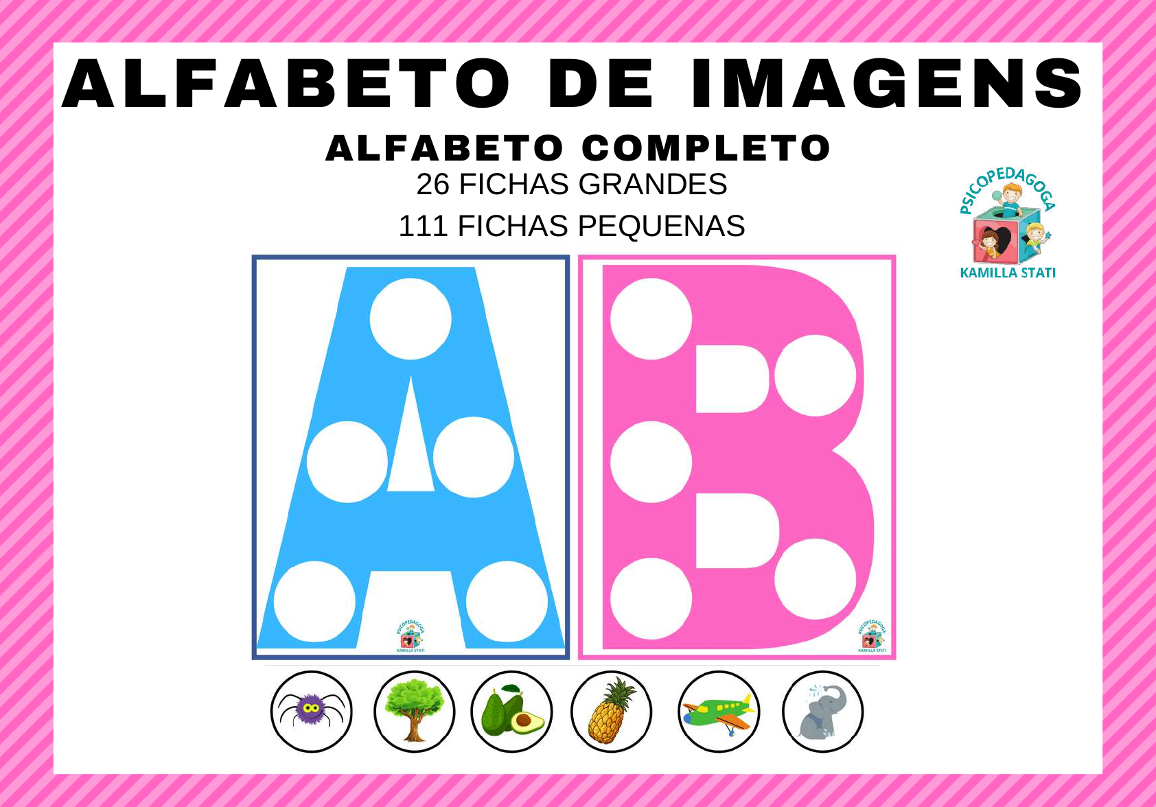 <p>ALFABETO DE IMAGENS</p><p>26 FICHAS GRANDES</p><p>111 FICHAS PEQUENAS</p><p>ALFABETO COMPLETO</p><p>Direitos autorais reservados, vedado a comercialização. uilnasenna@hotmail.com</p><p>AB</p><p>Direitos autorais reservados, vedado a comercialização. uilnasenna@hotmail.com</p><p>CD</p><p>Direitos autorais reservados, vedado a comercialização. uilnasenna@hotmail.com</p><p>EF</p><p>Direitos autorais reservados, vedado a comercialização. uilnasenna@hotmail.com</p><p>HG</p><p>Direitos autorais reservados, vedado a comercialização. uilnasenna@hotmail.com</p><p>I J</p><p>Direitos autorais reservados, vedado a comercialização. uilnasenna@hotmail.com</p><p>KL</p><p>Direitos autorais reservados, vedado a comercialização. uilnasenna@hotmail.com</p><p>NM</p><p>Direitos autorais reservados, vedado a comercialização. uilnasenna@hotmail.com</p><p>OP</p><p>Direitos autorais reservados, vedado a comercialização. uilnasenna@hotmail.com</p><p>QR</p><p>Direitos autorais reservados, vedado a comercialização. uilnasenna@hotmail.com</p><p>ST</p><p>Direitos autorais reservados, vedado a comercialização. uilnasenna@hotmail.com</p><p>UV</p><p>Direitos autorais reservados, vedado a comercialização. uilnasenna@hotmail.com</p><p>WX</p><p>Direitos autorais reservados, vedado a comercialização. uilnasenna@hotmail.com</p><p>YZ</p><p>Direitos autorais reservados, vedado a comercialização. uilnasenna@hotmail.com</p><p>Direitos autorais reservados, vedado a comercialização. uilnasenna@hotmail.com</p><p>Direitos autorais reservados, vedado a comercialização. uilnasenna@hotmail.com</p><p>Direitos autorais reservados, vedado a comercialização. uilnasenna@hotmail.com</p><p>Direitos autorais reservados, vedado a comercialização. uilnasenna@hotmail.com</p><p>Xerox</p><p>Após adquirir o PDF você precisa imprimir todas as folhas, recortar e</p><p>plastificar para uma maior durabilidade do material. O objetivo do jogo</p><p>é associar as imagens com a letra inicial correspondente.</p><p>Direitos autorais reservados, vedado a comercialização. uilnasenna@hotmail.com</p><p>REDES SOCIAIS</p><p>TERMOS DE USO</p><p>•ESTE MATERIAL FOI PRODUZIDO PELA</p><p>PSICOPEDAGOGA KAMILLA STATI.</p><p>•PROIBIDA A DISTRIBUIÇÃO E VENDA DESTE MATERIAL.</p><p>•LEI N° 9.610, 19 DE FEVEREIRO DE 1988/CRIME DE</p><p>VIOLAÇÃO AOS DIREITOS AUTORAIS NO ART. 184</p><p>•RESPEITE OS TERMOS DE USO PARA EVITAR</p><p>ABORRECIMENTOS.</p><p>Instagram: @psicopedagogia.kamillastati</p><p>Página: www.facebook.com/psicopedagogia.kamillastati</p><p>Grupo: www.facebook.com/psicopedagogia.educacional</p><p>WhatsApp: (43) 998659903</p><p>Direitos autorais reservados, vedado a comercialização. uilnasenna@hotmail.com</p>