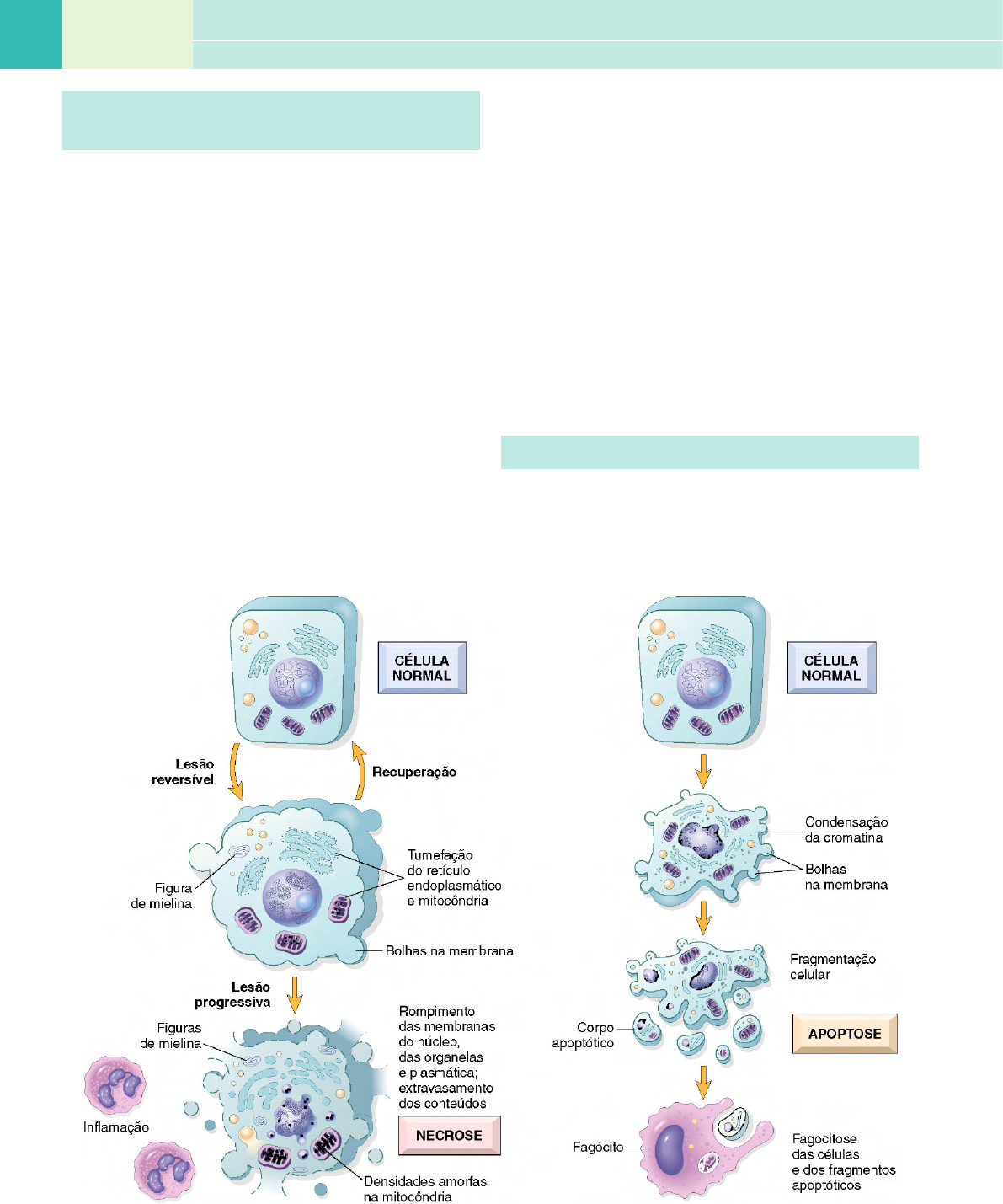 <p>C A P Í T U L O 16 Lesão Celular, Morte Celular e Adaptações</p><p>VISÃO GERAL DA LESÃO CELULAR</p><p>E MORTE CELULAR</p><p>Como mencionado no início do capítulo, a lesão celular ocor-</p><p>re quando as células são estressadas tão excessivamente que</p><p>não são mais capazes de se adaptar ou quando são expostas a</p><p>agentes lesivos ou são prejudicadas por anomalias intrínsecas</p><p>(p. ex., no DNA ou nas proteínas). Os diferentes estímulos le-</p><p>sivos afetam muitas vias metabólicas e organelas celulares. A</p><p>lesão pode progredir de um estágio reversível e culminar em</p><p>morte celular (Fig. 1-1).</p><p>• Lesão celular reversível. Nos estágios iniciais ou nas formas</p><p>leves de lesão, as alterações morfológicas e funcionais são</p><p>reversíveis se o estímulo nocivo for removido. Nesse es-</p><p>tágio, embora existam anomalias estruturais e funcionais</p><p>significativas, a lesão ainda não progrediu para um dano</p><p>severo à membrana e dissolução nuclear.</p><p>• Morte celular. Com a persistência do dano, a lesão torna-se</p><p>irreversível e, com o tempo, a célula não pode se recuperar</p><p>e morre. Existem dois tipos de morte celular — necrose e apop-</p><p>tose — que diferem em suas morfologias, mecanismos e papéis</p><p>na fisiologia e na doença (Fig. 1-6 e Tabela 1-1). Quando o</p><p>dano às membranas é acentuado, as enzimas extravasam</p><p>dos lisossomos, entram no citoplasma e digerem a célula,</p><p>resultando em necrose. Os conteúdos celulares também</p><p>extravasam através da membrana plasmática lesada e</p><p>iniciam uma reação (inflamatória) no hospedeiro. A ne-</p><p>crose é a principal via de morte celular em muitas lesões</p><p>comumente encontradas, como as que resultam de isque-</p><p>mia, de exposição a toxinas, várias infecções e trauma.</p><p>Quando a célula é privada de fatores de crescimento ou</p><p>quando o DNA celular ou as proteínas são danificadas</p><p>sem reparo, a célula se suicida por outro tipo de morte,</p><p>chamado apoptose, que é caracterizada pela dissolução</p><p>nuclear sem a perda da integridade da membrana. En-</p><p>quanto a necrose constitui sempre um processo patológi-</p><p>co, a apoptose auxilia muitas funções normais e não está</p><p>necessariamente associada à lesão celular patológica. Além</p><p>disso, a apoptose, em certos papéis fisiológicos, não desencadeia</p><p>uma resposta inflamatória. As características morfológicas,</p><p>os mecanismos e o significado dessas duas vias de morte</p><p>celular são discutidos em mais detalhes nas próximas</p><p>seções.</p><p>CAUSAS DA LESÃO CELULAR</p><p>As causas da lesão celular variam de trauma físico grosseiro</p><p>de um acidente de automóvel a defeito em um único gene que</p><p>resulta em uma enzima defeituosa, caracterizando uma doença</p><p>Figura 1-6 Características celulares da necrose (esquerda) e da apoptose (direita).</p><p>7Morfologia da lesão celular e tecidual</p><p>metabólica específica. A maioria dos estímulos nocivos pode ser</p><p>agrupada nas seguintes categorias.</p><p>Privação de Oxigênio</p><p>A hipóxia, ou deficiência de oxigênio, interfere com a res-</p><p>piração oxidativa aeróbica e constitui uma causa comum</p><p>e extremamente importante de lesão e morte celulares. A</p><p>hipóxia pode ser distinguida da isquemia, que é a perda do</p><p>suprimento sanguíneo em um tecido devido ao impedimento</p><p>do fluxo arterial ou à redução da drenagem venosa. Enquanto</p><p>a isquemia é a causa mais comum de hipóxia, a deficiência</p><p>de oxigênio pode resultar também da oxigenação inadequada</p><p>do sangue, como na pneumonia, ou por redução da capaci-</p><p>dade do sangue em transportar oxigênio, como na anemia</p><p>ou envenenamento por monóxido de carbono (CO). (O CO</p><p>forma um complexo estável com a hemoglobina que impede</p><p>a ligação ao oxigênio.)</p><p>Agentes Químicos</p><p>Enorme número de substâncias químicas que podem lesar as</p><p>células é amplamente conhecido; mesmo substâncias inócuas,</p><p>como glicose, o sal ou mesmo água, se absorvidas ou admi-</p><p>nistradas em excesso podem perturbar o ambiente osmótico,</p><p>resultando em lesão ou morte celular. Os agentes comumente</p><p>conhecidos como venenos causam severos danos em nível ce-</p><p>lular por alterarem a permeabilidade da membrana, a homeos-</p><p>tasia osmótica ou a integridade de uma enzima ou cofator. A</p><p>exposição a esses venenos pode culminar em morte de todo o</p><p>organismo. Outros agentes potencialmente tóxicos são encon-</p><p>trados diariamente no nosso ambiente; eles incluem poluentes</p><p>do ar, inseticidas, CO, asbesto e os “estímulos” sociais, como</p><p>o álcool. Mesmo as drogas terapêuticas podem causar lesão à</p><p>célula ou ao tecido em paciente suscetível ou se usadas de modo</p><p>excessivo ou inapropriado (Capítulo 7). Até mesmo o oxigênio</p><p>em altas pressões parciais é tóxico.</p><p>Agentes Infecciosos</p><p>Esses agentes variam desde vírus submicroscópicos a tênias</p><p>grandes; entre eles estão as riquétsias, as bactérias, os fungos e</p><p>os protozoários. As diversas maneiras pelas quais os patógenos</p><p>infecciosos causam lesão são discutidas no Capítulo 8.</p><p>Reações Imunológicas</p><p>Embora o sistema imune defenda o corpo contra micróbios</p><p>patogênicos, as reações imunes podem também resultar em</p><p>lesão à célula ou ao tecido. Os exemplos incluem as reações</p><p>autoimunes contra os próprios tecidos e as reações alérgicas</p><p>contra substâncias ambientais, em indivíduos geneticamente</p><p>suscetíveis (Capítulo 4).</p><p>Fatores Genéticos</p><p>As anomalias genéticas resultam em alterações patológicas</p><p>tão grosseiras como nas malformações congênitas associadas</p><p>com a síndrome de Down ou tão sut