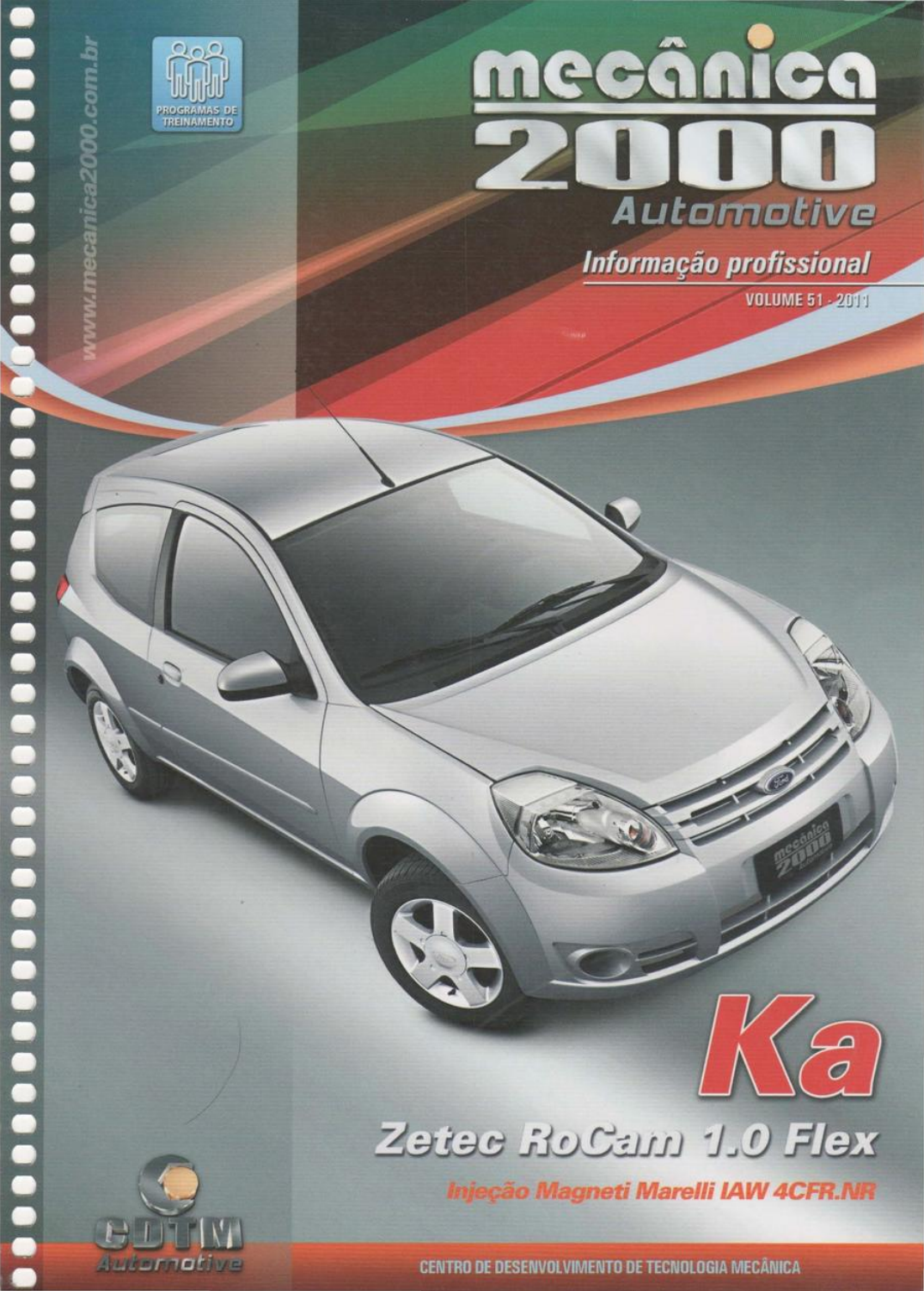 <p>FORD KA 1.0 FLEX</p><p>Neste volume, a Mecânica 2000 apre</p><p>senta o manual de manutenção do Ford Ka,</p><p>equipado com motor Zetec RoCam 1.0 Flex e</p><p>com o sistema de injeção Magneti Marelli</p><p>IAW 4CRENR, diferentemente das habituais</p><p>injeções FIC que equipam os veículos Ford.</p><p>O Ford Ka apresenta um excelente</p><p>desempenho com este motor, que conta com</p><p>o acionamento das válvulas com sistema de</p><p>balancins roletados. Isto contribui para a</p><p>transferência direta e mais livre do movi</p><p>mento, permitindo assim um menor atrito</p><p>com o eixo comando de válvulas. A distri</p><p>buição por corrente metálica melhora o</p><p>desempenho do motor em todas as rotações e</p><p>aumenta a durabilidade do conjunto.</p><p>· t_( ~ . "~</p><p>" I</p><p>~--</p><p>O CDTM se esforça para desvendar</p><p>procedimentos mecânicos muito frequentes</p><p>nas atividades de manutenção automotiva,</p><p>que devem ser de conhecimento do repara</p><p>dor em suas atividades. Apresentamos diag</p><p>nósticos complexos da injeção eletrônica, e o</p><p>sistema elétrico é apresentado de forma a</p><p>facilitar a visualização e a compreensão, com</p><p>identificação de seus conectares, componen</p><p>tes, terminais e chicotes.</p><p>Agradecemos aos clientes, parceiros,</p><p>colaboradores e amigos, pela confiança na</p><p>equipe de produção da Mecânica 2000, e</p><p>deixamos nossos votos de bons serviços!</p><p>Equipe Mecânica 2000</p><p>Índice</p><p>4 - FICHA TECi'iiCA DO YEICULO</p><p>5 - MANUTENÇAO PERIODICA PREVENTIVA</p><p>6 - CHECK-LIST</p><p>9 - SUBSTITUIÇÃO DA EMBREAGEM</p><p>23- FREIOS</p><p>41- SUSPENSÃO DIANTEIRA</p><p>44 - SUSPENSÃO TRASEIRA</p><p>48 - ARTICULAÇÕES DO SISTEMA DE SUSPENSÃO</p><p>52 - ROLAMENTO DIANTEIRO</p><p>57 - CABEÇOTE DO MOTOR</p><p>66 - CORRENTE DA DISTRIBUIÇÃO</p><p>69 - SUBSTITUIÇÃO DA BOMBA D'ÁGUA E BOMBA DE ÓLEO</p><p>77 - SISTEMA DE ARREFECIMENTO</p><p>85 - HIGIENIZAÇÃO DO AR-CONDICIONADO</p><p>89 - TORQUES DE APERTO</p><p>97 - ALTERNADOR</p><p>111 - MOTOR DE PARTIDA</p><p>121 -CENTRAL DO VAO DO MOTOR</p><p>122 -CENTRAL DE RELÉS E FUSÍVEIS DO PAINEL DE INSTRUMENTO</p><p>124 - CONECTORES AUXILIARES</p><p>127 -PONTOS DE ATERRAMENTO</p><p>130 - CHICOTES ELETRICOS</p><p>132 -PAINEL DE INSTRUMENTOS</p><p>134 -ESPECIFICAÇÕES TÉCNICAS DAS LÂMPADAS</p><p>136 - DIAGRAMA DO INTERRUPTOR DE MULTIPLA FUNÇAO (IMF)</p><p>137 - DIAG. DO COMUT,ADOR DE IGN. ALTER. E MOT. DE PARTIDA</p><p>138 - LUZES DE POSIÇAO</p><p>139 - DIAGRAMA DO Ft-.ROL ALTO E BAIXO</p><p>139 - DIAGRAMA DA LAMPADA DE PLACA</p><p>140 - DIAGRAMA DAS LUZES DE RE</p><p>141 - DIAGRAMA DAS LUZES DE FREIQ</p><p>142 - LUZES INDICADORAS DE DIREÇAO</p><p>143 - DIAGRAMA DA SIRENE DO ALARME</p><p>143 - DIAGRAMA DA BUZINA</p><p>144 - TOMADA 12V</p><p>144 - DIAGRAMA DAS LUZES DE CORTESIA</p><p>145 - DIAGRAMA DO IMOBILIZADOR •</p><p>145 - DIAGRAMA DO INTERRUPTOR DO CAPO</p><p>146 - DIAGRAMA DO SENSOR DE PRESENÇA DO ALARME</p><p>146 - DIAGRAMA DOS VIDROS ELETRICOS</p><p>147 - DIAGRAMA DOS LIMPADQRES DE LAVADOR DE PARA-BRISA</p><p>148- DIAGRAMA DE,VENTILAÇAO INTERNA</p><p>149- DIAGRAMA ELETRICO Dó SISTEMA DE ARREFECIMENTO</p><p>149 - DIAGRAMA DO DESEMBAÇAPOR DO VIDRO TRASEIRO</p><p>150 - DIAGRAMA DAS TRAVAS ELETRICAS</p><p>151 - DIAGRAMA DO SISTEMA DE AUDIO</p><p>152 - DIAGRAMA DO DESEMBAÇADOR DO VIDRO TRASEIRO</p><p>153 - DIAGRAMA DO SI~TEMA DE ARREFECIMENTO COM A/C</p><p>154 - DIAGRAMA DO MODULO DE CONFORTO (MCF)</p><p>156 - SISTEMA IMOBILIZADOR PATS I!</p><p>159 - SISTEMA DE ALIMENTAÇÃO DE COM_BUSTÍVEL</p><p>164 - CQMPONENTES E SUAS LOCALIZAÇOES</p><p>171 - COD. DE FALHAS APRESENTADOS NO SCANNER RASTHER I!</p><p>173- PINAGEM DO MÓDULO DE COMANDO</p><p>174- MÓDULO DE COMANDO (MC)</p><p>178- SENSOR DE OXIGÊNIO (.HEGO 1 E 2)</p><p>182 - SENSOR DE TEMP. DO LIQ. DE ARREFECIMENTO (ECT)</p><p>185 - CONJUNTO MEDIDOR DE DENSIDADE (CMD)</p><p>189 - SENSOR DE POSIÇ~O DO ÇOMANDO DE VÁLVULAS (CMP)</p><p>191- SENSOR DE POSIÇ~O DA ARVORE DE MANIVELAS (CKP)</p><p>193- SENSOR DE POSIÇAO DA BORBOLETA (TPS)</p><p>195- ATUADOR DE MARCHA LENTA- IAC</p><p>198- SENSOR DE VELOCIDADE (VSS)</p><p>201 - SENSOR DE DETON~ÇÃO (KS)</p><p>204 - BOBINAS DE IGNIÇAO (DIS)</p><p>208 - ELETROINJETORES - INJ</p><p>211 - SISTEMA DE ALIMENTAÇÃO DE COMBUSTÍVEL (SAC)</p><p>215 - SISTEMA ,DE PARTIDA A FRIO (SPF)</p><p>219 - ELETROVALVULA DE PURGA DO CANISTER (CANP)</p><p>222 - VÁLVULA TERMOSTÁTICA ELETRÔNICA- VTE</p><p>224 - TABELA DE VALORES IDEAIS</p><p>225 - OSCILOSCÓPIO DIGITAL</p><p>228 - DIAGRAMA ELÉTRICO</p><p>230 -TESTE SEUS CONHECIMENTOS</p><p>--------------------------------------------------------------'3</p><p>tfl Ficha técnica</p><p>FICHA TÉCNICA - FORO KA 1.0 FLEX</p><p>Motor</p><p>Tipo</p><p>Número e disposição dos cilindros</p><p>Ordem de Ignição</p><p>Diâmetro x Curso</p><p>Número de válvulas por cilindro</p><p>Acionamento</p><p>Potência do motor</p><p>Torque máximo</p><p>Rotação de marcha lenta</p><p>Transmissão</p><p>Tipo de Lubrificante</p><p>Bomba de óleo</p><p>Capacidade do sistema</p><p>Pressão de operação</p><p>Transversal , dianteiro</p><p>4 em linha</p><p>1 - 3- 4 -2</p><p>68,68 mm x 67,40 mm</p><p>2</p><p>Por corrente e balancins com ajuste hidráulico</p><p>69,0 CV a 6.700 rpm (gasolina)</p><p>73,0 CV a 6.700 rpm (álcool)</p><p>8,9 Kgfm a 4.750 rpm (gasolina)</p><p>9,3 Kgfm a 4,750 rpm (álcool)</p><p>850 ±50 rpm</p><p>Manual de 5 marchas</p><p>Sistema de Lubrificação</p><p>SAE 5W30</p><p>Bomba de engrenagens (Acionada por corrente )</p><p>4,11itros(comfiltro)</p><p>3 a 5,5 bar a 880 rpm</p><p>Sistema de Alimentação de Combustível</p><p>Injeção eletrônica de combustível Magneti Marelli IAW 4CFR.NR</p><p>Tipo da bomba de combustível</p><p>Reservatório de partida a frio</p><p>Tanque de combustível</p><p>Pressão da bomba de combustível</p><p>Tipo da bomba d'água</p><p>Tipo da válvula t