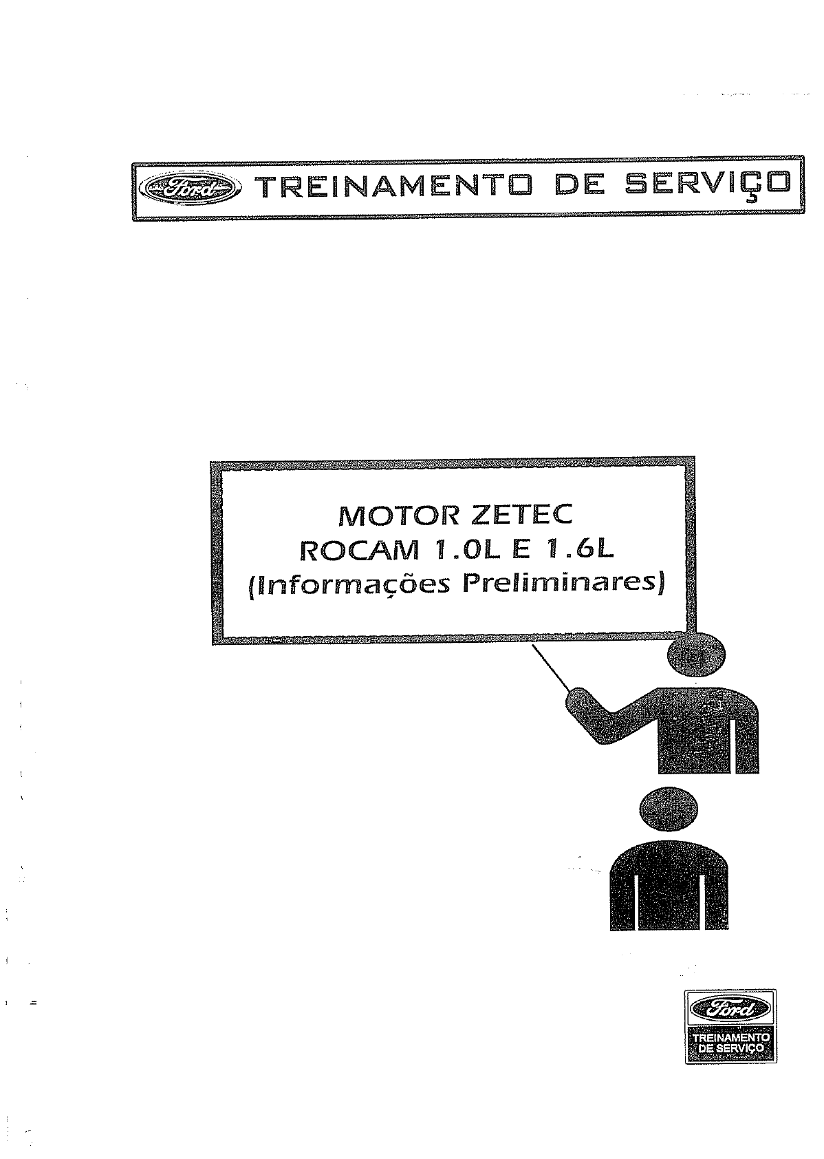 <p>TREINAMENTO DE MOTOR ZETEC ROCAM 1.0L E 1.6L (Informações Preliminares) Ford TREINAMENTO DE SERVIÇO</p><p>MOTOR ZETEC ROCAM ATM-041 Edição - Julho/99</p><p>MOTOR ZETEC ROCAM 1.0LE1 1.6 L ÍNDICE APRESENTAÇÃO 4 SIMBOLOGIA 5 DESCRIÇÃO E FUNCIONAMENTO 6 MEDIÇÃO DA COMPRESSÃO COM MOTOR QUENTE 12 MEDIÇÃO DA PRESSÃO DO ÓLEO COM O MOTOR QUENTE 14 MOTOR 16 Desmontagem 17 Montagem 27 CABEÇOTE DO MOTOR 53 Desmontagem 54 Montagem 55 ESPECIFICAÇÕES 64 ESPECIFICAÇÕES DE TORQUE 67 FERRAMENTAS ESPECIAIS 70 NOTAS 71 3</p><p>MOTOR ZETEC ROCAM 1.0 E 1.6 L APRESENTAÇÃO Os procedimentos de reparos apropriados e métodos de serviços adequados são essenciais para a segurança, uma operação confiável de todos os veículos, bem como para a segurança pessoal do que está executando o trabalho. Esta apostila fornece diretrizes gerais para a realização do serviço e do trabalho de reparo com técnicas efetivamente testadas. Seguindo-as, estas o auxiliarão a assegurar confiabilidade. Sempre use óculos de segurança para proteção dos olhos; - Utilize suportes de segurança sempre que um procedimento exigir que você permaneça sob o Assegure-se que a chave de ignição esteja sempre na posição DESLIGADA, a menos que seja exigido de alguma outra forma pelo procedimento; Acione freio de estacionamento ao trabalhar no veiculo. Se a transmissão for automática, coloque-a na posição ESTACIONADO (PARK) a menos que seja de alguma outra forma por uma operação Somente faça o motor funcionar em uma área bem ventilada de forma a evitar o perigo do Monóxido de Carbono (CO); Para evitar queimaduras sérias, evite contato com peças metálicas quentes tais como radiador, coletor de escape, tubo de escapamento, conversor catalitico e silenciador de escape; Não fume enquanto estiver trabalhando no veiculo; Para evitar acidentes, sempre retire anéis relógios e roupas soltas antes de começar a trabalhar no veiculo e mantenha os cabelos longos presos com uma rede; Mantenha as mãos e outros objetos afastados da ventoinha do radiador. Ventoinhas elétricas podem começar a funcionar a qualquer momento devido a um aumento nas temperaturas sob capô; Mantenha-se longe das peças móveis quando o motor estiver funcionando, principalmente da ventoinha e As recomendações e sugestões contidas nesta apostila são feitas para auxiliar o distribuidor na melhoria de suas operações do departamento de assistência técnica Estas recomendações e sugestões não anulam ou substituem as disposições do Manual de Serviços. O desta apostila é para uso exclusivo de treinamento aos distribuidores Quaisquer alterações em modelos, técnicas ou procedimentos podem ser feitas sem prévio aviso, já que a Ford Brasil Ltda. está em constante Ford Treinamento de Serviço Ford São Bernardo do Campo Brasil 4</p><p>MOTOR ZETEC ROCAM 1.0 L E 1.6 L SIMBOLOGIA Esta apostila permite que as figuras transmitam São utilizados os seguintes simbolos para muito do texto. Está um texto chamar a atenção quanto aos pontos chaves adicional para ajudar a expressar as idéias da questão: de forma tão elucidativa quanto INSTALAÇÃO IMPORTANTE/NOTA REMOÇÃO SELANTE CONSULTAR O MANUAL DE COMPONENTE NOVO SERVIÇO OU PROCEDIMENTO LUBRIFICAÇÃO A ATENÇÃO / CUIDADO FROUXO / APERTADO NÃO REUTILIZAR DESAPARAFUSAR COMPONENTE DE ALUMÍNIO TORQUE FERRAMENTA NOVA G MEDIÇÃO 5</p><p>MOTOR ZETEC ROCAM 1.0 LE 1.6 L DESCRIÇÃO E FUNCIONAMENTO Os Fiesta e Courier estão equipados com o novo motor Zetec Rocam disponível em duas versões, e para o Fiesta e para o Courier. Estes motores atingem 65 CV (48 Kw) a 5800 rpm e 95 CV (70 Kw) a 5500 rpm Desenvolvidos dentro da mais alta tecnologia, estes motores tem como características principais a injeção seqüencial multiponto controlada eletronicamente, comando de válvulas com balancins roletados, coletor de admissão em material termoplástico, cabeçote do motor e de óleo em de alta resistência, nas versões com ar- 6</p><p>MOTOR ZETEC ROCAM 1.0 L E 1.6 L Sistema de Injeção A injeção de combustivel é um sistema controlado eletronicamente que injeta combustivel nos dutos de admissão do motor em pulsos intermitentes por meio de válvulas O módulo "EEC V" ( Eletronic Engine Control) tem a função de processar todas as informações recebidas e fornecer o tempo de injeção e avanço de ignição adequados para cada condição de uso do A ignição é mapeada com ou sem o sistema passivo anti-furto. 7</p><p>MOTOR ZETEC ROCAM 1.0LE1.6 L Mecanismo das válvulas O comando de válvulas do motor Zetec Rocam conta com um sistema de balancins roletados o que permite menor atrito com a árvore de comando de válvulas, melhorando o desempenho do motor em todas as rotações e aumentando a durabilidade do conjunto 8</p><p>MOTOR ZETEC ROCAM 1.0 L E 1.6 L Coletor de admissão coletor de admissão é injetado em material termoplástico que reduz o peso, e a condutibilidade do calor, melhora as caracteristicas do fluxo de ar, a condensação durante a partida a frio e proporciona uma melhor resposta durante a partida a quente. Este coletor é composto de dutos de admissão com alojamento para o corpo da borboleta. 9</p><p>MOTOR ZETEC ROCAM 1.0LE1.6 L Cabeçote do motor cabeçote do motor Zetec Rocam é todo em que permite uma melhora nas caracteristicas térmicas, com consequente redução de peso e maior durabilidade O cabeçote é montado no bloco de cilindros com uma junta especial, fixado por 10 M11 parafusos M11 e 2 parafusos M8 M8 Cárter de óleo Em veiculos equipados com ar-condicionado, o cárter de óleo do motor Zetec Rocam é confeccionado em de alta resistência, reduzindo o peso do conjunto e aumentando a durabilidade, Nos demais modelos sem ar-condicionado, o cárter é confeccionado em chapa de aço NOTA: a junta do cárter de óleo deve ser trocada sempre que removida 10</p><p>MOTOR ZETEC ROCAM L Número de identificação do motor O numero de identificação 