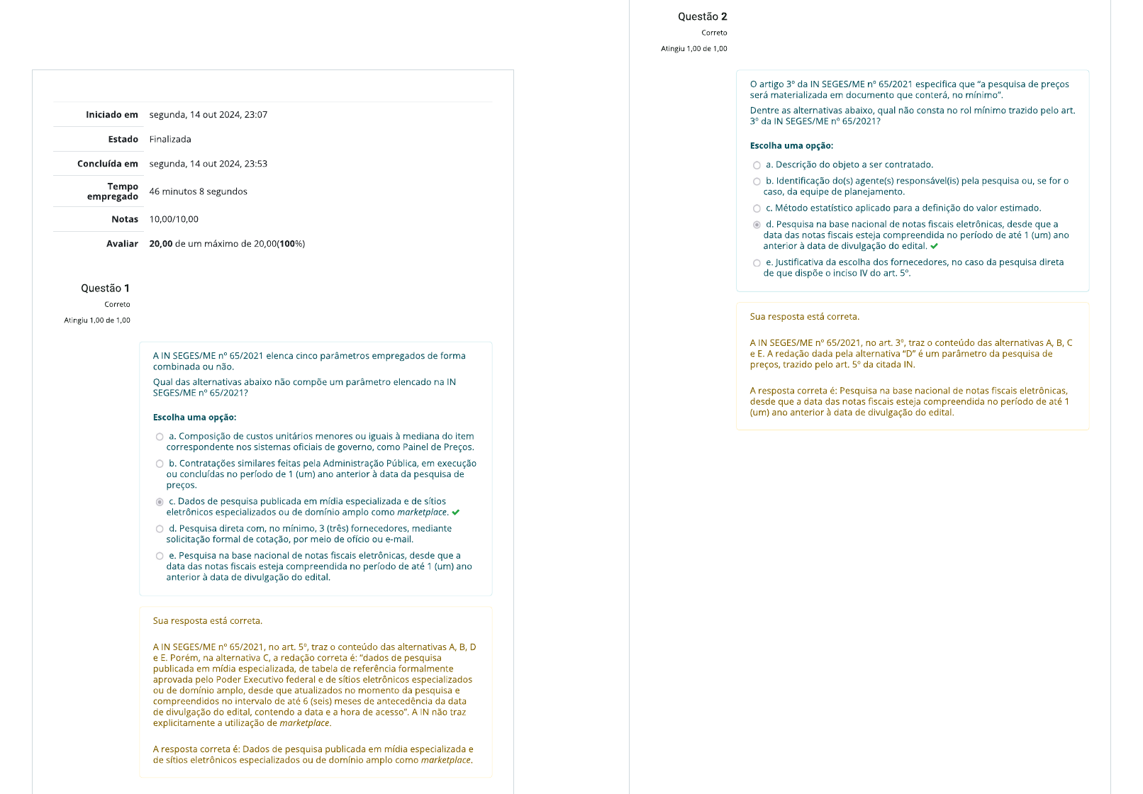 <p>Questão 2 Correto Atingiu 1,00 de 1,00 artigo 3° da IN SEGES/ME 65/2021 especifica que "a pesquisa de preços será materializada em documento que conterá, no mínimo". Iniciado em segunda, 14 out 2024, 23:07 Dentre as alternativas abaixo, qual não consta no rol mínimo trazido pelo art. 3° da IN SEGES/ME 65/2021? Estado Finalizada Escolha uma opção: Concluída em segunda, 14 out 2024, 23:53 a. Descrição do objeto a ser contratado. b. Identificação do(s) agente(s) responsável(is) pela pesquisa ou, se for o Tempo empregado 46 minutos 8 segundos caso, da equipe de planejamento. Método estatístico aplicado para a definição do valor estimado. Notas 10,00/10,00 d. Pesquisa na base nacional de notas fiscais eletrônicas, desde que a data das notas fiscais esteja compreendida no período de até 1 (um) ano Avaliar 20,00 de um máximo de 20,00(100%) anterior à data de divulgação do edital. e. Justificativa da escolha dos fornecedores, no caso da pesquisa direta de que dispõe o inciso IV do art. Questão 1 Correto Atingiu 1.00 de 1,00 Sua resposta está correta. A IN SEGES/ME 65/2021, no art. traz o conteúdo das alternativas A, B, C A IN SEGES/ME 65/2021 elenca cinco parâmetros empregados de forma e E. A redação dada pela alternativa "D" é um parâmetro da pesquisa de combinada ou não. preços, trazido pelo art. 5° da citada IN. Qual das alternativas abaixo não compõe um parâmetro elencado na IN SEGES/ME 65/2021? A resposta correta é: Pesquisa na base nacional de notas fiscais eletrônicas, desde que a data das notas fiscais esteja compreendida no período de até 1 Escolha uma opção: (um) ano anterior à data de divulgação do edital. a. Composição de custos unitários menores ou iguais à mediana do item correspondente nos sistemas oficiais de governo, como Painel de Preços. b. Contratações similares feitas pela Administração Pública, em execução ou concluídas no período de 1 (um) ano anterior à data da pesquisa de preços. Dados de pesquisa publicada em mídia especializada e de sítios eletrônicos especializados ou de domínio amplo como marketplace. d. Pesquisa direta com, no mínimo, 3 (três) fornecedores, mediante solicitação formal de por meio de ofício ou e-mail. e. Pesquisa na base nacional de notas fiscais eletrônicas, desde que a data das notas fiscais esteja compreendida no período de até 1 (um) ano anterior à data de divulgação do edital. Sua resposta está correta. A IN SEGES/ME 65/2021, no art. traz o conteúdo das alternativas A, B, D e E. Porém, na alternativa C, a redação correta é: "dados de pesquisa publicada em mídia especializada, de tabela de referência formalmente aprovada pelo Poder Executivo federal e de sítios eletrônicos especializados ou de domínio amplo, desde que atualizados no momento da pesquisa e compreendidos no intervalo de até 6 (seis) meses de antecedência da data de divulgação do edital, contendo a data e a hora de acesso". A IN não traz explicitamente a utilização de marketplace. A resposta correta é: Dados de pesquisa publicada em mídia especializada e de sítios eletrônicos especializados ou de domínio amplo como marketplace.</p><p>Questão 3 Questão 4 Correto Correto Atingiu 1,00 de 1,00 Atingiu 1,00 de 1,00 Para o correto preenchimento da planilha de custos e, consequentemente, a Sobre o modelo de planilha da SEGES, trazida na Instrução Normativa n° correta estimativa dos custos de uma licitação, é necessário ficar atento aos 05/2017, no Anexo VII-D, para composição de custos e formação de preços. normativos legais, à CCT vigente à época da elaboração do orçamento Assinale a alternativa que não compõe o Módulo 1 Composição da estimativo, ao valor da tarifa de transporte, à necessidade de realização de Remuneração: horas extraordinárias, entre outros aspectos. Em qual das alternativas abaixo o valor é uma previsão legal? Escolha uma opção: Escolha uma opção: a. Salário Base. b. Adicional de periculosidade. a. Auxílio alimentação. Adicional insalubridade. b. Adicional de periculosidade. d. Auxílio alimentação. C. Plano de Saúde. e. Adicional noturno. d. Seguro de vida. e. Auxílio funeral. Sua resposta está correta. Sua resposta está correta. o Auxílio Alimentação compõe o Submódulo 2.3, Benefícios mensais e diários, no modelo de planilha de custos e formação de preços da SEGES, valor do adicional de periculosidade é Previsto na Consolidação das Leis do trazida na Instrução Normativa 05/2017, no Anexo VII-D. Trabalho CLT, no "Art. 193.São consideradas atividades ou operações perigosas, na forma da regulamentação aprovada pelo Ministério do Trabalho e Emprego, A resposta correta é: Auxílio alimentação. aquelas que, por sua natureza ou métodos de trabalho, impliquem risco acentuado em virtude de exposição permanente do trabalhador a: [...] trabalho em condições de periculosidade assegura ao empregado um adicional de 30% (trinta por cento) sobre salário sem os acréscimos resultantes de gratificações, prêmios ou participações nos lucros da empresa." Em todas as demais alternativas os seus valores são definidos pelas Convenções Coletivas de Trabalho ou definidos na licitação. A resposta correta é: Adicional de periculosidade.</p><p>Questão 5 Questão 6 Correto Correto Atingiu 1,00 de 1,00 Atingiu 1,00 de 1,00 Com relação aos documentos necessários de habilitação fiscal, social e Qual foi uma das principais novidades trazidas pela Lei n° 14.133/2021 em trabalhista, para participar de um certame licitatório. relação à Lei n° 8.666/1993, no que tange à habilitação fiscal, social e trabalhista? Qual alternativa está incorreta? Assinale a alternativa correta: Escolha uma opção: Escolha uma opção: a. A inscrição no Cadastro de Pessoas Físicas (CPF) ou no Cadastro Nacional da Pessoa Jurídica (CNPJ). a. Não permitir a impressão das respectivas documentações exigidas no art