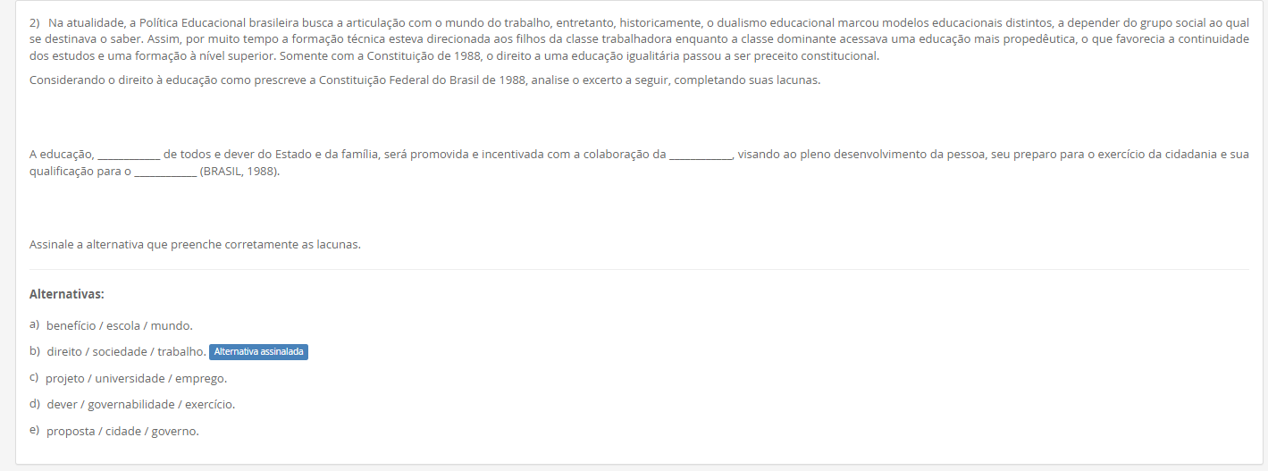 <p>2) Na atualidade, a Política Educacional brasileira busca a articulação com mundo do trabalho, entretanto, historicamente, dualismo educacional marcou modelos educacionais distintos, a depender do grupo social ao qual se destinava o saber. Assim, por muito tempo a formação técnica esteva direcionada aos filhos da classe trabalhadora enquanto a classe dominante acessava uma educação mais propedêutica, que favorecia a continuidade dos estudos e uma formação à nível superior. Somente com a Constituição de 1988, direito a uma educação igualitária passou a ser preceito constitucional. Considerando direito à educação como prescreve a Constituição Federal do Brasil de 1988, analise excerto a seguir, completando suas A educação, de todos e dever do Estado e da família, será promovida e incentivada com a colaboração da visando ao pleno desenvolvimento da pessoa, seu preparo para exercício da cidadania e sua qualificação para O (BRASIL, 1988). Assinale a alternativa que preenche corretamente as Alternativas: a) benefício / escola / b) direito / sociedade / trabalho. Alternativa assinalada c) projeto / universidade / emprego. d) dever / governabilidade / e) proposta / cidade / governo.</p>