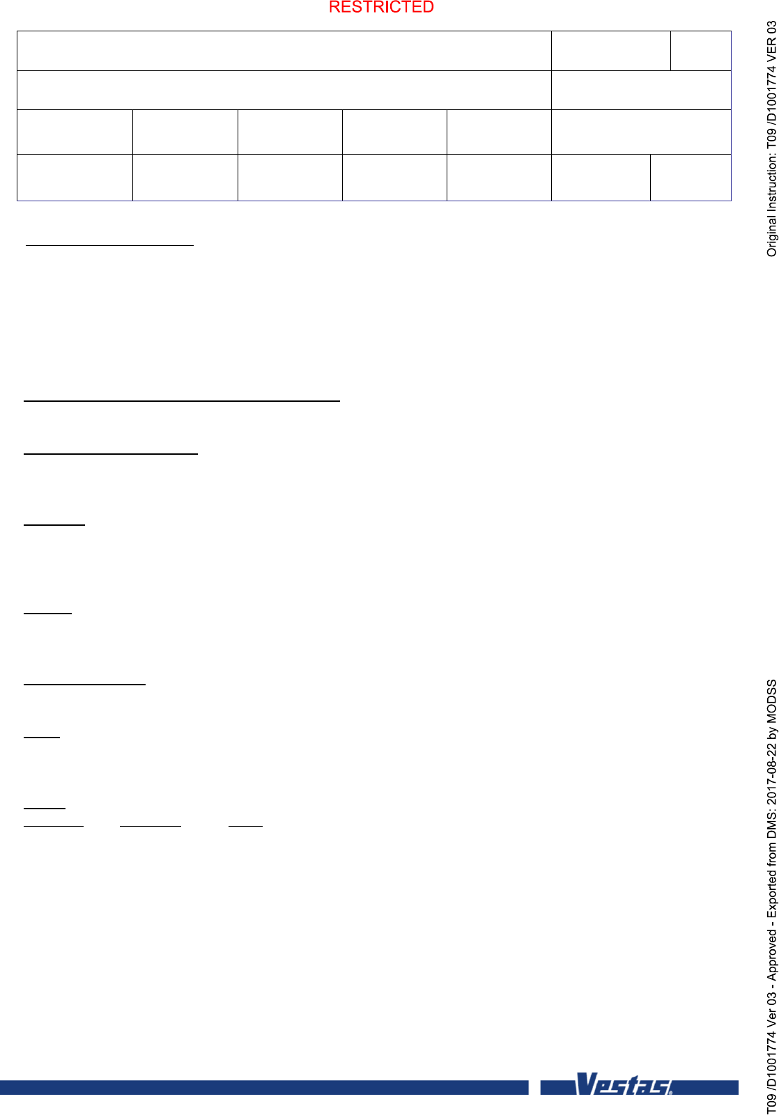 <p>SERVICE WORK INSTRUCTION SWI</p><p>Document number:</p><p>1001774</p><p>Rev.no.:</p><p>3</p><p>Title:</p><p>Upgrade of Torque Arm Bushings in NM 64C/1500 and NM 72C/1500</p><p>Workplace:</p><p>Service</p><p>Rev. date R</p><p>Sign. Appd.</p><p>1</p><p>FRN BSIP</p><p>2</p><p>FRN BSIP</p><p>3</p><p>4</p><p>Prepared by: Date:</p><p>FRN 2010-03-25</p><p>5</p><p>6</p><p>7</p><p>8</p><p>9</p><p>Approved by:</p><p>BSIP</p><p>Page of</p><p>1 7</p><p>Vestas Wind Systems A/S · Alsvej 21 · 8940 Randers SV · Denmark · www.vestas.com</p><p>History of this Document</p><p>Changes in this document:</p><p>Rev. no.: Date: Description of change</p><p>1 2006-02-09 First edition</p><p>2 2006-02-16 Minor changes</p><p>03 2010-03-25 Replaced the internal crane picture in the section ‘Performance of Work’</p><p>Education Requirements of Service Technician:</p><p>No special requirements.</p><p>Required Documentation:</p><p>WKI 1001217 Service Instruction Generator - Alignment</p><p>Installation and Service Data - Document no. 5001556 for 64C and 5001166 for 72C..</p><p>Purpose:</p><p>This work instruction has been prepared due to CIM case no. 950.</p><p>Owing to some problems with the rubber bushings of the torque arms, a new bushing and torque arm</p><p>have been introduced.</p><p>Safety:</p><p>Read, understand and comply with the rules in WKI 1000711 Safety Manual and WKI 1001381 –</p><p>Turbine Safety Instructions. Do not perform the work in high winds.</p><p>Risk Assessment:</p><p>Not assessed.</p><p>Note:</p><p>Special tools are required.</p><p>If the generator is to be aligned, special tools beyond the below mentioned are required.</p><p>Tools:</p><p>Item no.:</p><p>Quantity:</p><p>Text:</p><p>60093416 1 Trigger tool with hydraulic press</p><p>301202 1 Electric chain hoist 800 kg</p><p>VT742285 1 Crane for nacelle</p><p>VT189669 1 Hydraulic pump, Plarad VAX6-W</p><p>VT730322 1 RSL 2 hydraulic wrench ¾”</p><p>VT730371 1 Eye bolt M12</p><p>238447 1 Top ¾” 36 mm</p><p>T2185200 1 Aligning tool with magnets</p><p>T3241500 1 Adjusting device for generator NM60/64/72/82</p><p>VESTAS PROPRIETARY NOTICE: This document contains valuable confidential information of Vestas Wind Systems A/S. It is protected by copyright law as an unpublished work. Vestas reserves all patent, copyright, trade secret, and</p><p>other proprietary rights to it. The information in this document may not be used, reproduced, or disclosed except if and to the extent rights are expressly granted by Vestas in writing and subject to applicable conditions. Vestas</p><p>disclaims all warranties except as expressly granted by written agreement and is not responsible for unauthorized uses, for which it may pursue legal remedies against responsible parties.</p><p>SERVICE WORK INSTRUCTION SWI</p><p>Document number:</p><p>1001774</p><p>Rev.no.</p><p>3</p><p>Workplace:</p><p>Service</p><p>Title:</p><p>Upgrade of Torque Arm Bushings in NM 64C/1500 and NM</p><p>72C/1500</p><p>Sign. date:</p><p>2010-03-25</p><p>Page of</p><p>2 7</p><p>Vestas Wind Systems A/S · Alsvej 21 · 8940 Randers SV · Denmark · www.vestas.com</p><p>Various hand tools:</p><p>Crowbar</p><p>Large pair of circlip pliers</p><p>Degreasing agent</p><p>Cleaning paper</p><p>Pair of water pump pliers</p><p>½” Socket wrench set</p><p>400 Nm Torque wrench</p><p>10”-12” Adjustable spanner</p><p>27-30-32-36 mm Ring spanner</p><p>Spare Parts:</p><p>Item no.: Quantity: Text:</p><p>NM 64C/1500</p><p>60106127 4 Gear support NM 64C (Set)</p><p>A set includes:</p><p>60111582 1 Torque arm surface treated 72C 3-layer</p><p>60106057 2 Rubber bush 3-layer (UB03 006 50)</p><p>60099837 1 Axial disc NM72/82 – 1650 (UB03 012 103)</p><p>60099838 1 Distance ring 1650 (UB03 012 104)</p><p>60034582 1 Washer ISO 7089 20-200 HV-tzn</p><p>60033168 1 Screw ISO 4017 M20x55-8.8tzn</p><p>60043424 1 Plastic stopper H74 H2</p><p>60035086 2 Dowel pin ISO 8752 Ø 8X30</p><p>NM 64C/1500 – Equipped with Metso PLH 1100 gear</p><p>60112194 4 Gear support NM 64C (Metso gear) (Set)</p><p>A set includes:</p><p>60112193 1 Rear Cup</p><p>60111582 1 Torque arm surface treated 72C 3-layer</p><p>60106057 2 Rubber bush 3-layer (UB03 006 50)</p><p>60099838 1 Distance ring 1650 (UB03 012 104)</p><p>60034582 1 Washer ISO 7089 20-200 HV-tzn</p><p>60033168 1 Screw ISO 4017 M20x55-8.8tzn</p><p>60043424 1 Plastic stopper H74 H2</p><p>60035086 2 Dowel pin ISO 8752 Ø 8X30</p><p>NM 72C/1500</p><p>60111589 4 Gear support NM72C/1500 3 layer (Set)</p><p>A set includes:</p><p>60111582 1 Torque arm surface treated 72C 3-layer</p><p>60099836 2 Rubber bush 3-layer (UB03 006 001)</p><p>60099837 1 Axial disc NM72/82 – 1650 (UB03 012 103)</p><p>60099838 1 Distance ring 1650 (UB03 012 104)</p><p>60034582 1 Washer ISO 7089 20-200 HV-tzn</p><p>60033168 1 Screw ISO 4017 M20x55-8.8tzn</p><p>60043424 1 Plastic stopper H74 H2</p><p>60035086 2 Dowel pin ISO 8752 Ø 8X30</p><p>Weights:</p><p>-</p><p>SERVICE WORK INSTRUCTION SWI</p><p>Document number:</p><p>1001774</p><p>Rev.no.</p><p>3</p><p>Workplace:</p><p>Service</p><p>Title:</p><p>Upgrade of Torque Arm Bushings in NM 64C/1500 and NM</p><p>72C/1500</p><p>Sign. date:</p><p>2010-03-25</p><p>Page of</p><p>3 7</p><p>Vestas Wind Systems A/S · Alsvej 21 · 8940 Randers SV · Denmark · www.vestas.com</p><p>Performance of the Work:</p><p>Prior to commencing the work, stop the turbine and open the emergency stop circuit.</p><p>The torque arms and the main bearing are the only points of connection between the main beams and</p><p>gear/main shaft and hub. Therefore, only dismantle one torque arm at a time.</p><p>Mount a custom-manufactured crane arm at the front of the main beam. Tighten the crane according to</p><p>5001166 Installation and Service Data – General Bolt Torques. Hook either a small electrical crane or a</p><p>chain hoist to the arm.</p><p>Loosen and unscrew the six nuts and stay bolts holding the torque arms down against the beam.</p><p>Dismantle the locking ring at the en