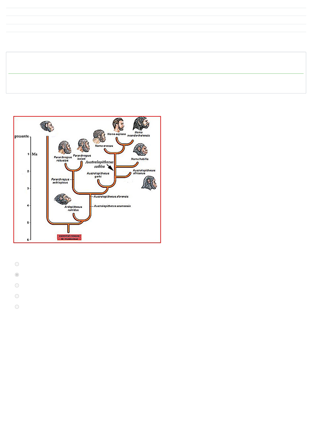 <p>Iniciado em segunda-feira, 14 out. 2024, 16:32</p><p>Estado Finalizada</p><p>Concluída em segunda-feira, 14 out. 2024, 16:37</p><p>Tempo</p><p>empregado</p><p>4 minutos 56 segundos</p><p>QUESTÃO 1</p><p>Completo</p><p>Vale 1,0 ponto(s).</p><p>Com base na filogenia de Hominidae apresentada abaixo. Podemos afirmar que:</p><p>Escolha uma opção:</p><p>a. Paranthropus é parafilético</p><p>b. Australopithecus sediba é a espécie ancestral imediata de todas as espécies do gênero Homo</p><p>c. Homo erectus é grupo-irmão de H.sapiens + H. neanderthalensis + H. habilis</p><p>d. A espécie ancestral imediata de todas as espécies do gênero Homo surgiu há ca. 5 Ma.</p><p>e. O ancestral imediato de Homo sapiens e H.neanderthalensis tinha aspecto de macaco</p><p>14/10/2024, 16:37 AD3 - 2024.2: Revisão da tentativa | PLATAFORMA CEDERJ</p><p>https://graduacao.cederj.edu.br/mod/quiz/review.php?attempt=57156&cmid=159353 1/8</p><p>QUESTÃO 2</p><p>Completo</p><p>Vale 1,0 ponto(s).</p><p>Um cladograma totalmente resolvido implica em:</p><p>Escolha uma opção:</p><p>a. Apresentar autapomorfias</p><p>b. Apresentar nós e táxons terminais</p><p>c. Apresentar grupos monofiléticos</p><p>d. Apresentar politomia</p><p>e. Ser totalmente dicotômico</p><p>14/10/2024, 16:37 AD3 - 2024.2: Revisão da tentativa | PLATAFORMA CEDERJ</p><p>https://graduacao.cederj.edu.br/mod/quiz/review.php?attempt=57156&cmid=159353 2/8</p><p>QUESTÃO 3</p><p>Completo</p><p>Vale 1,0 ponto(s).</p><p>As três tabelas abaixo incluem dados sobre espécies de lagartos (L1-L5), sapos (S1-S4) e peixes (P1-P5). Ao lado de cada espécie está sua</p><p>respectiva área de ocorrência. Após recuperar as relações de parentesco, obtenha o cladograma geral de área mais parcimonioso segundo</p><p>o método da análise de parcimônia de Brooks (BPA). Feito isso, aponte qual alternativa está errada.</p><p>Escolha uma opção:</p><p>a. SA+IND é área irmã de AUS+AFR+AS</p><p>b. IND+AUS é monofilética</p><p>c. A área ancestral original é formada pelo conjunto AS+AFR+AUS+SA+IND</p><p>d. A ausência de sapo na área AFR pode ser explicada por extinção</p><p>e. AS+AFR+AUS foram um componente indicativo de história comum</p><p>14/10/2024, 16:37 AD3 - 2024.2: Revisão da tentativa | PLATAFORMA CEDERJ</p><p>https://graduacao.cederj.edu.br/mod/quiz/review.php?attempt=57156&cmid=159353 3/8</p><p>QUESTÃO 4</p><p>Completo</p><p>Vale 1,0 ponto(s).</p><p>No Cladograma abaixo podemos afirmar que:</p><p>Escolha uma opção:</p><p>a. O grupo L1-6 é parafilético</p><p>b. O grupo L5+L7 é monofilético</p><p>c. O grupo L4 é grupo-irmão de L3</p><p>d. O grupo L1-6 é polifilético</p><p>e. O grupo L5+L7 é polifilético</p><p>14/10/2024, 16:37 AD3 - 2024.2: Revisão da tentativa | PLATAFORMA CEDERJ</p><p>https://graduacao.cederj.edu.br/mod/quiz/review.php?attempt=57156&cmid=159353 4/8</p><p>QUESTÃO 5</p><p>Completo</p><p>Vale 1,0 ponto(s).</p><p>Considere a árvore não enraizada abaixo. Se fixarmos A como grupo-externo e obtermos a polarização, podemos afirmar que:</p><p>Escolha uma opção:</p><p>a. C+F formam um grupo polifilético</p><p>b. B+C+D formam um grupo monofilético</p><p>c. D+E+F formam um grupo monofilético</p><p>d. B é grupo-irmão de A</p><p>e. F+E é o clado mais basal</p><p>14/10/2024, 16:37 AD3 - 2024.2: Revisão da tentativa | PLATAFORMA CEDERJ</p><p>https://graduacao.cederj.edu.br/mod/quiz/review.php?attempt=57156&cmid=159353 5/8</p><p>QUESTÃO 6</p><p>Completo</p><p>Vale 1,0 ponto(s).</p><p>QUESTÃO 7</p><p>Completo</p><p>Vale 1,0 ponto(s).</p><p>A partir da seguinte matriz de dados:</p><p>Construa um cladograma mais parcimonioso que represente as relações entre os gêneros. Feito isso, aponte qual a afirmativa correta.</p><p>Escolha uma opção:</p><p>a. A+B+C formam grupo monofilético</p><p>b. A+B+C+D+E é parafilético</p><p>c. A+D é um grupo monofilético</p><p>d. A+B+E formam grupo monofilético</p><p>e. C+D é caracterizado por aspectos primitivos</p><p>Na análise componentes pode-se afirmar que:</p><p>Escolha uma opção:</p><p>a. n.d.a</p><p>b. Os dados não são trabalhados a priori na construção de componentes</p><p>c. Relega-se a segundo plano as suposições 0,1 e 2</p><p>d. O clique oferece a solução para o cladograma geral de áreas</p><p>e. A rota de dispersão é inferida a partir da interseção de cladogramas de áreas de grupos taxonômicos</p><p>14/10/2024, 16:37 AD3 - 2024.2: Revisão da tentativa | PLATAFORMA CEDERJ</p><p>https://graduacao.cederj.edu.br/mod/quiz/review.php?attempt=57156&cmid=159353 6/8</p><p>QUESTÃO 8</p><p>Completo</p><p>Vale 1,0 ponto(s).</p><p>QUESTÃO 9</p><p>Completo</p><p>Vale 1,0 ponto(s).</p><p>Qual das seguintes metodologias não se propõe a recuperar relação histórica entre áreas.</p><p>Escolha uma opção:</p><p>a. Análise de componentes</p><p>b. Biogeografia cladística</p><p>c. n.d.a</p><p>d. Pan-biogeografia tradicional</p><p>e. Análise de parcimônia de endemismos</p><p>Considere o cladograma abaixo. Podemos afirmar que:</p><p>Escolha uma opção:</p><p>a. As espécies a-c exibem ampla distribuição geográfica e d é simpátrica</p><p>b. O único problema biogeográfico é a extinção de d na área C</p><p>c. Não há qualquer problema biogeográfico já que há condição trivial</p><p>d. As espécies a e c mostram simpatria</p><p>e. As espécies a-c exibem simpatria e a espécie d exibe ampla distribuição geográfica</p><p>14/10/2024, 16:37 AD3 - 2024.2: Revisão da tentativa | PLATAFORMA CEDERJ</p><p>https://graduacao.cederj.edu.br/mod/quiz/review.php?attempt=57156&cmid=159353 7/8</p><p>QUESTÃO 10</p><p>Completo</p><p>Vale 1,0 ponto(s).</p><p>Considerando o mapa abaixo e a tabela espécies versus caracteres. A-E são áreas. As espécies z1, z2, z3, z4 e z5 são encontradas nas áreas</p><p>E, D, C, A e B, respectivamente. Construa o cladograma para as espécies de z de acordo com argumentação hennigiana e aplique o método</p>