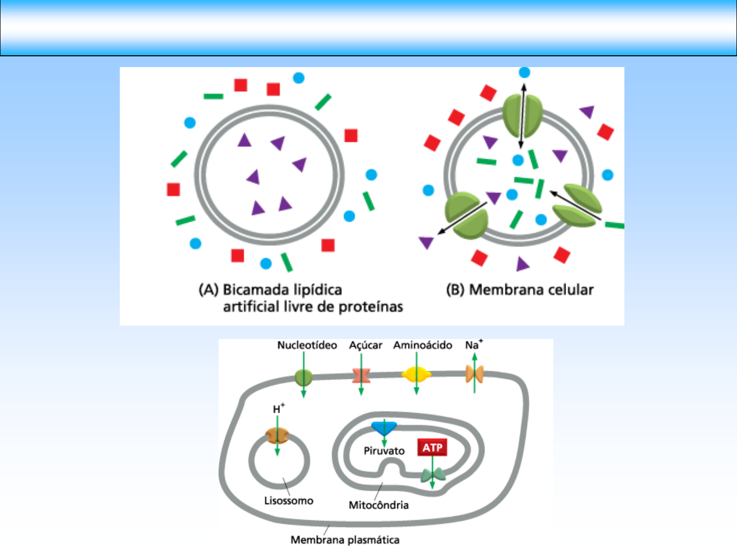 <p>A permeabilidade da Bicamada Lipídica</p><p>Alberts e col. Biologia Molecular da Célula. 2010</p><p>COMPONENTE CONCENTRAÇÃO</p><p>INTRACELULAR (mM)</p><p>CONCENTRAÇÃO</p><p>EXTRACELULAR (mM)</p><p>Concentração de íons no interior e no exterior de uma célula de mamífero</p><p>Alberts e col. Biologia Molecular da Célula. 2010</p><p>COMPONENTE CONCENTRAÇÃO</p><p>INTRACELULAR (mM)</p><p>CONCENTRAÇÃO</p><p>EXTRACELULAR (mM)</p><p>Concentração de íons no interior e no exterior de uma célula de mamífero</p><p>Alberts e col. Biologia Molecular da Célula. 2010</p><p>Difusão da água: osmose</p><p>Alberts e col. Biologia Molecular da Célula. 2010</p><p>Resposta do eritrócito humano a mudanças na osmolaridade</p><p>Alberts e col. Biologia Molecular da Célula. 2010</p><p>Concentração de</p><p>íons no espaço</p><p>extracelular HIPERTÔNICA ISOTÔNICA HIPOTÔNICA MUITO</p><p>HIPOTÔNICA</p><p>CÉLULA VERMELHA</p><p>SANGUÍNEA</p><p>CRENADA NORMAL INCHADA LISADA</p><p>Estratégias para evitar o intumescimento osmótico</p><p>Alberts e col. Biologia Molecular da Célula. 2010</p><p>A permeabilidade da Bicamada Lipídica</p><p>Alberts e col. Biologia Molecular da Célula. 2010</p><p>Cooper, G. A Célula. 2007</p><p>Proteína Transportadora (transmembrana multipasso)</p><p>MEIO EXTRACELULAR</p><p>CITOSOL</p><p>Alberts e col. Biologia Molecular da Célula. 2010</p><p>Tipos de proteínas de transporte</p><p>Alberts e col. Biologia Molecular da Célula. 2010</p><p>Transporte passivo X transporte ativo</p><p>Gradiente eletroquímico</p><p>Gradiente eletroquímico sem</p><p>potencial de membrana</p><p>Gradiente eletroquímico com</p><p>potencial de membrana interior</p><p>negativo</p><p>Gradiente eletroquímico com</p><p>potencial de membrana interior</p><p>positivo</p><p>EXTERIOR</p><p>INTERIOR</p><p>POTENCIAL DE MEMBRANA + GRADIENTE DE CONCENTRAÇÃO</p><p>Alberts e col. Biologia Molecular da Célula. 2010</p><p>Difusão Facilitada</p><p>Alberts e col. Biologia Molecular da Célula. 2010</p><p>Deslocamento da molécula ocorre a favor do gradiente eletroquímico</p><p>Transporte ativo</p><p>Alberts e col. Biologia Molecular da Célula. 2010</p><p>Deslocamento da molécula ocorre contra o gradiente eletroquímico</p><p>Alberts e col. Biologia Molecular da Célula. 2017</p><p>Tipos de bombas dirigidas por ATP</p><p>Alberts e col. Biologia Molecular da Célula. 2010</p><p>Bomba tipo P (bomba de Na+K+)</p><p>Alberts e col. Biologia molecular da célula. 2010</p><p>Bomba tipo P (bomba de Na+K+)</p><p>Bomba tipo P (bomba de Na+K+)</p><p>Transportadores ABC</p><p>Molécula pequena</p><p>TRANSPORTADOR ABC BACTERIANO</p><p>TRANSPORTADOR ABC EUCARIÓTICO</p><p>Molécula</p><p>pequena</p><p>Alberts e col. Biologia Molecular da Célula. 2010</p><p>Alberts e col. Biologia molecular da célula. 2010</p><p>Transporte acoplado</p><p>SIMPORTE ANTIPORTE</p><p>TRANSPORTE ACOPLADO</p><p>UNIPORTE</p><p>MOLÉCULA TRANSPORTADA ÍON CO-TRANSPORTADO</p><p>BICAMADA</p><p>LIPÍDICA</p><p>Transporte Ativo dirigido por gradiente de íons</p><p>Alberts e col. Biologia Molecular da Célula. 2010</p><p>Alberts e col. Biologia Molecular da Célula. 2010</p><p>Antiporte</p><p>Cooper, G. A Célula. 2007</p><p>Transporte Ativo dirigido por gradiente de íons</p><p>Alberts e col. Biologia Molecular da Célula. 2010</p><p>Transportadores de glicose (células epiteliais intestinais)</p><p>Canais iônicos</p><p>Alberts e col. Biologia Molecular da Célula. 2010</p><p>Cooper, G. A Célula. 2001</p><p>Seletividade dos Canais de Na+</p><p>Seletividade dos Canais de K+</p><p>Seletividade dos canais iônicos</p><p>Alberts e col. Biologia Molecular da Célula. 2017</p><p>Controle da abertura dos canais iônicos</p><p>Abertura controlada por estresse</p><p>Alberts e col. Biologia Molecular da Célula. 2010</p><p>Controle da abertura dos canais iônicos</p><p>Alberts e col. Biologia Molecular da Célula. 2010</p><p>Ligante</p><p>Voltagem</p><p>Estrutura do neurônio</p><p>Geração de potencial de ação</p><p>Alberts e col. Biologia Molecular da Célula. 2010</p><p>Alberts e col. Biologia Molecular da Célula. 2010</p><p>Propagação do potencial de ação</p><p>Alberts e col. Biologia Molecular da Célula. 2010</p><p>JUNÇÃO NEUROMUSCULAR EM REPOUSO JUNÇÃO NEUROMUSCULAR ATIVADA</p><p>Transmissão neuromuscular</p><p>Receptor de acetilcolina</p><p>Alberts e col. Biologia Molecular da Célula. 2010</p><p>Referências</p><p>• ALBERTS, B., JOHNSON, A., LEWIS, J., RAFF, M., ROBERTS, K., WALTER, P.</p><p>Biologia Molecular da Célula. Trad. de Ana Letícia de Souza Vanz et al. 6ª ed. Porto</p><p>Alegre: Artmed. 2017. 1427 p. il.</p><p>• ALBERTS, B., BRAY, D., JOHNSON, A., LEWIS, J., RAFF, M., ROBERTS, K.,</p><p>WALTER, P. Fundamentos da Biologia Celular. Trad. de Ana Letícia de Souza Vanz</p><p>et al. 3 ed. Porto Alegre: Artmed. 2011. 844 p. il.</p><p>• LODISH, H.; BERK, A.; MATSUDAIRA, P.; KAISER C.A.; KRIEGER, M.; SCOTT, M.P.</p><p>Biologia Celular e Molecular. Trad. Adriana de Freitas S. Bizarro et al. 7ª ed. Porto</p><p>Alegre: Artmed. 2014. 1210 p. il.</p><p>• CAMPBELL, N. A. & REECE, J. B. Biologia. Trad. Anne D. Villela et al. 8ª ed. Porto</p><p>Alegre. Artmed. 2010. 1464 p il.</p>