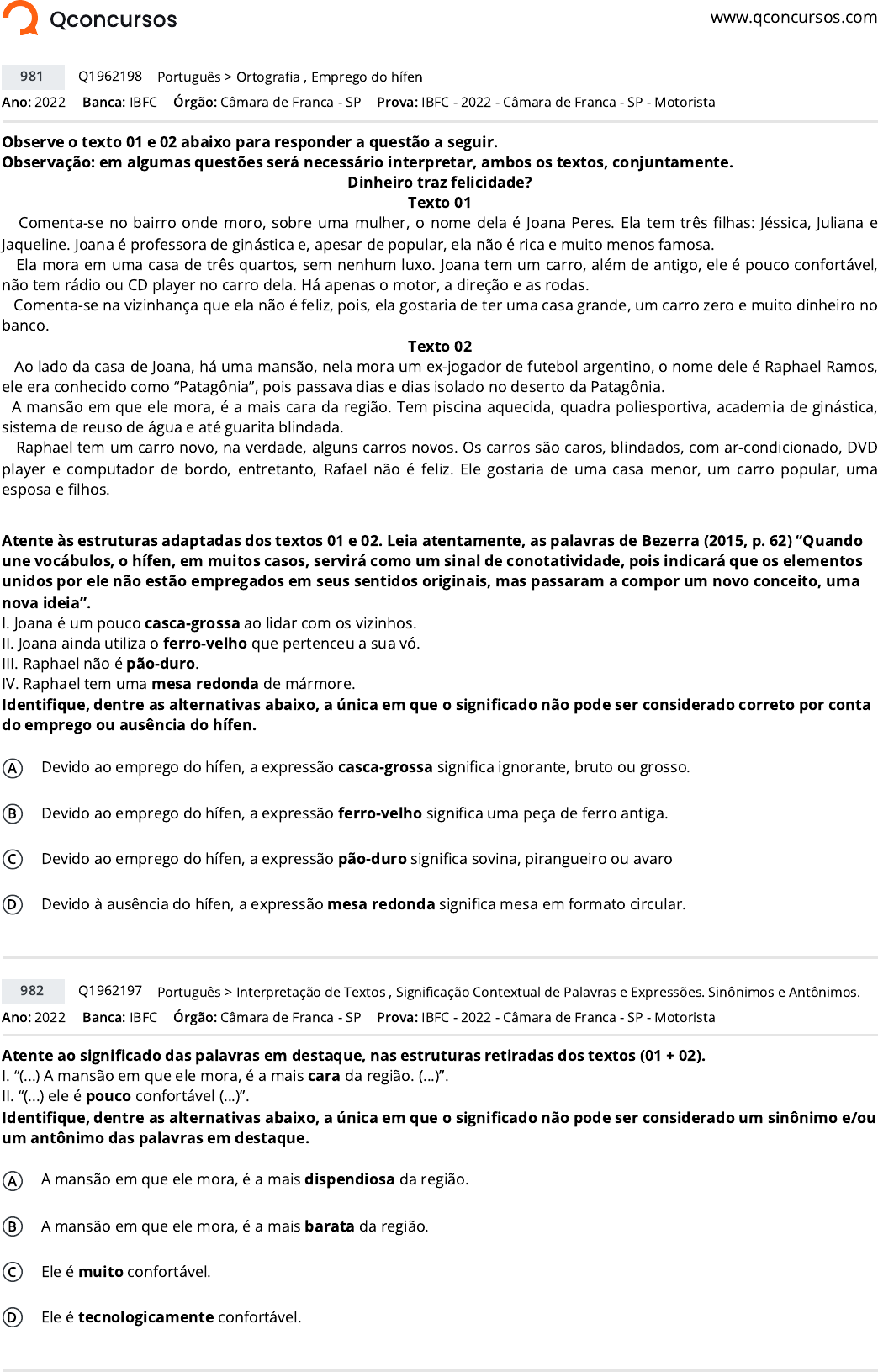 <p>www.qconcursos.com</p><p>Ano: 2022 Banca: IBFC Órgão: Câmara de Franca - SP</p><p>Observe o texto 01 e 02 abaixo para responder a questão a seguir.</p><p>Observação: em algumas questões será necessário interpretar, ambos os textos, conjuntamente.</p><p>Dinheiro traz felicidade?</p><p>Texto 01</p><p>Comenta-se no bairro onde moro, sobre uma mulher, o nome dela é Joana Peres. Ela tem três �lhas: Jéssica, Juliana e</p><p>Jaqueline. Joana é professora de ginástica e, apesar de popular, ela não é rica e muito menos famosa.</p><p>Ela mora em uma casa de três quartos, sem nenhum luxo. Joana tem um carro, além de antigo, ele é pouco confortável,</p><p>não tem rádio ou CD player no carro dela. Há apenas o motor, a direção e as rodas.</p><p>Comenta-se na vizinhança que ela não é feliz, pois, ela gostaria de ter uma casa grande, um carro zero e muito dinheiro no</p><p>banco.</p><p>Texto 02</p><p>Ao lado da casa de Joana, há uma mansão, nela mora um ex-jogador de futebol argentino, o nome dele é Raphael Ramos,</p><p>ele era conhecido como “Patagônia”, pois passava dias e dias isolado no deserto da Patagônia.</p><p>A mansão em que ele mora, é a mais cara da região. Tem piscina aquecida, quadra poliesportiva, academia de ginástica,</p><p>sistema de reuso de água e até guarita blindada.</p><p>Raphael tem um carro novo, na verdade, alguns carros novos. Os carros são caros, blindados, com ar-condicionado, DVD</p><p>player e computador de bordo, entretanto, Rafael não é feliz. Ele gostaria de uma casa menor, um carro popular, uma</p><p>esposa e �lhos.</p><p>Atente às estruturas adaptadas dos textos 01 e 02. Leia atentamente, as palavras de Bezerra (2015, p. 62) “Quando</p><p>une vocábulos, o hífen, em muitos casos, servirá como um sinal de conotatividade, pois indicará que os elementos</p><p>unidos por ele não estão empregados em seus sentidos originais, mas passaram a compor um novo conceito, uma</p><p>nova ideia”.</p><p>I. Joana é um pouco casca-grossa ao lidar com os vizinhos.</p><p>II. Joana ainda utiliza o ferro-velho que pertenceu a sua vó.</p><p>III. Raphael não é pão-duro.</p><p>IV. Raphael tem uma mesa redonda de mármore.</p><p>Identi�que, dentre as alternativas abaixo, a única em que o signi�cado não pode ser considerado correto por conta</p><p>do emprego ou ausência do hífen.</p><p>A Devido ao emprego do hífen, a expressão casca-grossa signi�ca ignorante, bruto ou grosso.</p><p>B Devido ao emprego do hífen, a expressão ferro-velho signi�ca uma peça de ferro antiga.</p><p>C Devido ao emprego do hífen, a expressão pão-duro signi�ca sovina, pirangueiro ou avaro</p><p>D Devido à ausência do hífen, a expressão mesa redonda signi�ca mesa em formato circular.</p><p>Ano: 2022 Banca: IBFC Órgão: Câmara de Franca - SP</p><p>Atente ao signi�cado das palavras em destaque, nas estruturas retiradas dos textos (01 + 02).</p><p>I. “(...) A mansão em que ele mora, é a mais cara da região. (...)”.</p><p>II. “(...) ele é pouco confortável (...)”.</p><p>Identi�que, dentre as alternativas abaixo, a única em que o signi�cado não pode ser considerado um sinônimo e/ou</p><p>um antônimo das palavras em destaque.</p><p>A A mansão em que ele mora, é a mais dispendiosa da região.</p><p>B A mansão em que ele mora, é a mais barata da região.</p><p>C Ele é muito confortável.</p><p>D Ele é tecnologicamente confortável.</p><p>981 Q1962198 >Português Ortogra�a , Emprego do hífen</p><p>Prova: IBFC - 2022 - Câmara de Franca - SP - Motorista</p><p>982 Q1962197 >Português Interpretação de Textos , Signi�cação Contextual de Palavras e Expressões. Sinônimos e Antônimos.</p><p>Prova: IBFC - 2022 - Câmara de Franca - SP - Motorista</p><p>https://www.qconcursos.com/</p><p>https://www.qconcursos.com/questoes-de-concursos/bancas/ibfc</p><p>https://www.qconcursos.com/questoes-de-concursos/institutos/camara-de-franca-sp</p><p>https://www.qconcursos.com/questoes-de-concursos/bancas/ibfc</p><p>https://www.qconcursos.com/questoes-de-concursos/institutos/camara-de-franca-sp</p><p>https://www.qconcursos.com/questoes-de-concursos/questoes/695b1256-33</p><p>https://www.qconcursos.com/questoes-de-concursos/disciplinas/letras-portugues</p><p>https://www.qconcursos.com/questoes-de-concursos/disciplinas/letras-portugues/ortografia</p><p>https://www.qconcursos.com/questoes-de-concursos/disciplinas/letras-portugues/emprego-do-hifen</p><p>https://www.qconcursos.com/questoes-de-concursos/provas/ibfc-2022-camara-de-franca-sp-motorista</p><p>https://www.qconcursos.com/questoes-de-concursos/questoes/69576236-33</p><p>https://www.qconcursos.com/questoes-de-concursos/disciplinas/letras-portugues</p><p>https://www.qconcursos.com/questoes-de-concursos/disciplinas/letras-portugues/interpretacao-de-textos</p><p>https://www.qconcursos.com/questoes-de-concursos/disciplinas/letras-portugues/significacao-contextual-de-palavras-e-expressoes-sinonimos-e-antonimos</p><p>https://www.qconcursos.com/questoes-de-concursos/provas/ibfc-2022-camara-de-franca-sp-motorista</p><p>Ano: 2022 Banca: IBFC Órgão: Câmara de Franca - SP</p><p>Atente à acentuação das palavras em destaque, nas estruturas retiradas do texto:</p><p>I. “(...) Joana é professora de ginástica (...)”.</p><p>II. “(...) Ele é pouco confortável (...)”.</p><p>III. “(...) Ela tem três �lhas (...)”. Identi�que, dentre as alternativas abaixo, a única em que o padrão de acentuação</p><p>segue ao das palavras em destaque.</p><p>A caráter, sábado, cortês.</p><p>B freguês, sólido, éter.</p><p>C pássaro, vulnerável, pés.</p><p>D máquina, afável, português.</p><p>Ano: 2022 Banca: IBFC Órgão: Câmara de Franca - SP</p><p>Atente ao uso da pontuação na estrutura a seguir: “Ela tem três �lhas: Jéssica, Juliana e Jaqueline”. Assinale a</p><p>alternativa que justi�ca o uso da vírgula.</p><p>A</p><p>A vírgula foi empregada par