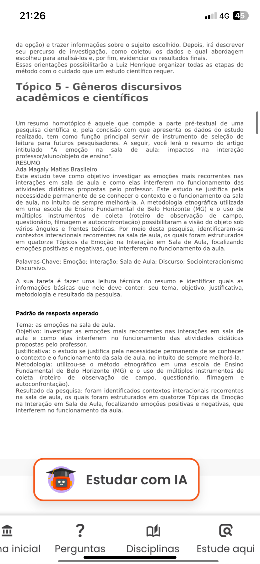<p>21:26 4G da opção) e trazer informações sobre o sujeito escolhido. Depois, irá descrever seu percurso de investigação, como coletou os dados e qual abordagem escolheu para analisá-los e, por fim, evidenciar os resultados finais. Essas orientações possibilitarão a Luiz Henrique organizar todas as etapas do método com o cuidado que um estudo requer. Tópico 5 - Gêneros discursivos acadêmicos e científicos Um resumo é aquele que compõe a parte pré-textual de uma pesquisa científica e, pela concisão com que apresenta os dados do estudo realizado, tem como função principal servir de instrumento de seleção de leitura para futuros pesquisadores. A seguir, você lerá o resumo do artigo intitulado "A emoção na sala de aula: impactos na interação professor/aluno/objeto de ensino". RESUMO Ada Magaly Matias Brasileiro Este estudo teve como objetivo investigar as emoções mais recorrentes nas interações em sala de aula e como elas interferem no funcionamento das atividades didáticas propostas pelo professor. Este estudo se justifica pela necessidade permanente de se conhecer o contexto e o funcionamento da sala de aula, no intuito de sempre melhorá-la. A metodologia etnográfica utilizada em uma escola de Ensino Fundamental de Belo Horizonte (MG) e o uso de múltiplos instrumentos de coleta (roteiro de observação de campo, questionário, filmagem e autoconfrontação) possibilitaram a visão do objeto sob vários ângulos e frentes teóricas. Por meio desta pesquisa, identificaram-se contextos interacionais recorrentes na sala de aula, os quais foram estruturados em quatorze Tópicos da Emoção na Interação em Sala de Aula, focalizando emoções positivas e negativas, que interferem no funcionamento da aula. Palavras-Chave: Emoção; Sala de Aula; Discurso; Sociointeracionismo Discursivo. A sua tarefa é fazer uma leitura técnica do resumo e identificar quais as informações básicas que nele deve conter: seu tema, objetivo, justificativa, metodologia e resultado da pesquisa. Padrão de resposta esperado Tema: as emoções na sala de aula. Objetivo: as emoções mais recorrentes nas interações em sala de aula e como elas interferem no funcionamento das atividades didáticas propostas pelo professor. Justificativa: o estudo se justifica pela necessidade permanente de se conhecer o contexto e o funcionamento da sala de aula, no intuito de sempre melhorá-la. Metodologia: utilizou-se o método etnográfico em uma escola de Ensino Fundamental de Belo Horizonte (MG) e o uso de múltiplos instrumentos de coleta (roteiro de observação de campo, questionário, filmagem e autoconfrontação). Resultado da pesquisa: foram identificados contextos interacionais recorrentes na sala de aula, os quais foram estruturados em quatorze Tópicas da Emoção na Interação em Sala de Aula, focalizando emoções positivas e negativas, que interferem no funcionamento da aula. Estudar com IA ? Q a inicial Perguntas Disciplinas Estude aqui</p>