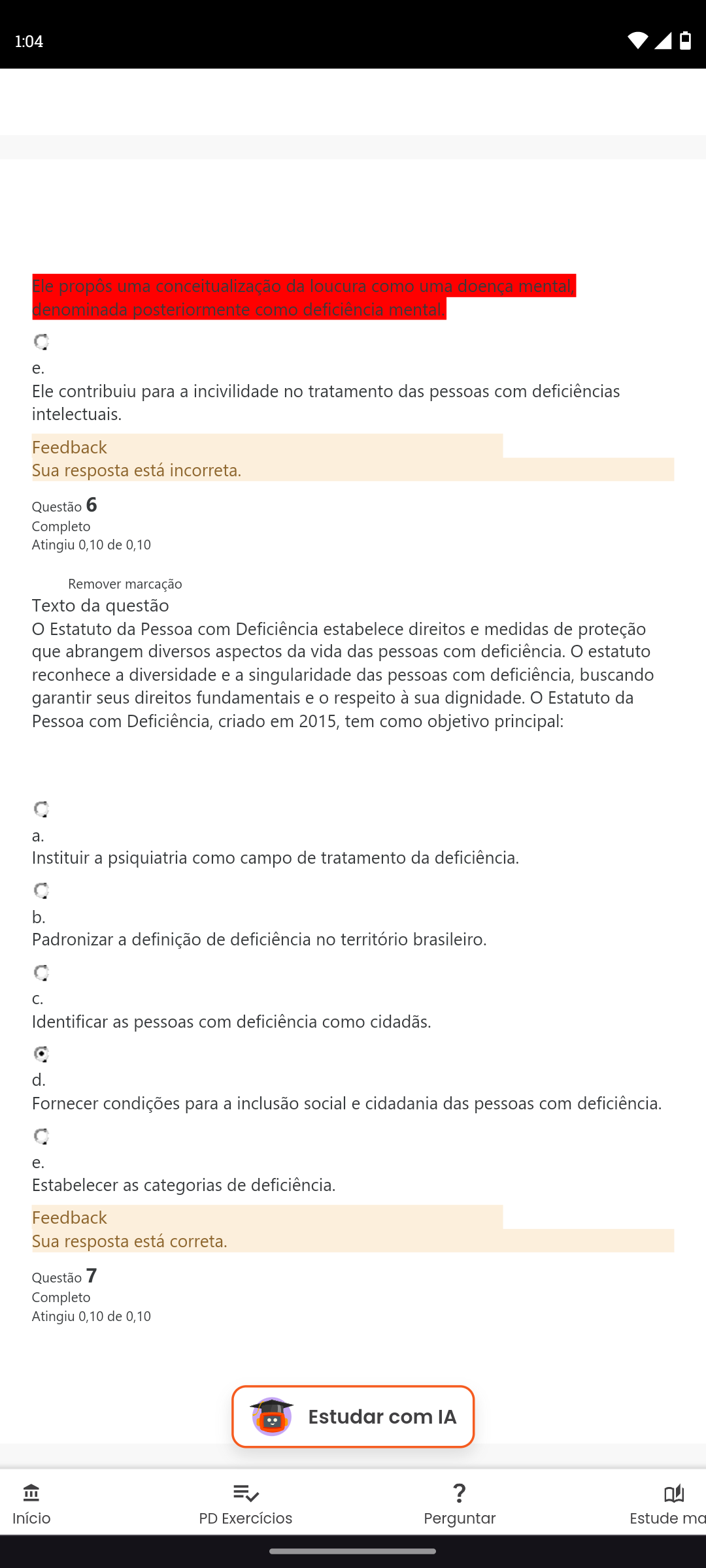<p>e. Ele contribuiu para a incivilidade no tratamento das pessoas com deficiências intelectuais. Feedback Sua resposta está incorreta. Questão 6 Completo Atingiu 0,10 de 0,10 Remover marcação Texto da questão O Estatuto da Pessoa com Deficiência estabelece direitos e medidas de proteção que abrangem diversos aspectos da vida das pessoas com deficiência. O estatuto reconhece a diversidade e a singularidade das pessoas com deficiência, buscando garantir seus direitos fundamentais e respeito à sua dignidade. O Estatuto da Pessoa com Deficiência, criado em 2015, tem como objetivo principal: a. Instituir a psiquiatria como campo de tratamento da deficiência. b. Padronizar a definição de deficiência no território brasileiro. C. Identificar as pessoas com deficiência como d. Fornecer condições para a inclusão social e cidadania das pessoas com deficiência. e. Estabelecer as categorias de deficiência. Feedback Sua resposta está correta. Questão 7 Completo Atingiu 0,10 de 0,10 Estudar com IA ? Início PD Exercícios Perguntar Estude ma</p>