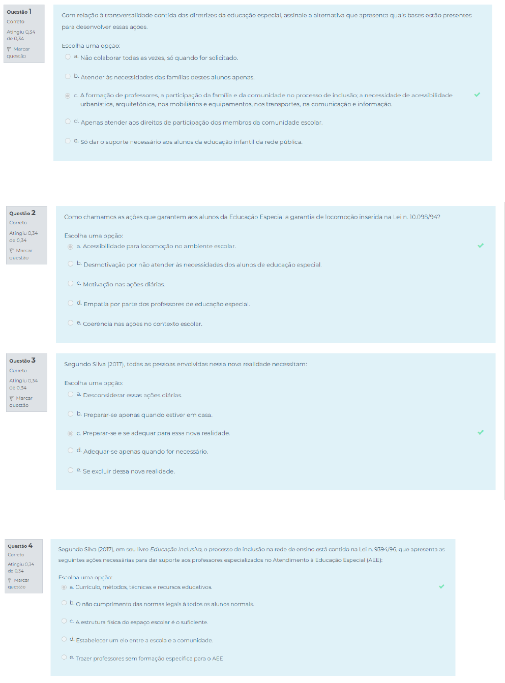 <p>Questão 1 Com relação à transversalidade contida das diretrizes da educação especial, assinale a alternativa que apresenta quais bases estão presentes Correto para desenvolver essas ações. Atingiu 0,34 de Escolha uma opção: P Marcar questão a. Não colaborar todas as vezes, só quando for solicitado. b. Atender às necessidades das famílias destes alunos apenas. C. A formação de professores, a participação da família e da comunidade no processo de inclusão; a necessidade de acessibilidade arquitetônica, nos mobiliários e equipamentos, nos transportes, na comunicação e informação. d. Apenas atender aos direitos de participação dos membros da comunidade escolar. dar suporte necessário aos alunos da educação infantil da rede pública. Questão 2 Como chamamos as ações que garantem aos alunos da Educação Especial a garantia de locomoção inserida na Lei n. 10.098/94? Correto Atingiu 0,34 Escolha uma opção: de a. Acessibilidade para locomoção no ambiente escolar. Marcar questão b. Desmotivação por não atender às necessidades dos alunos de educação especial. C. Motivação nas ações d. Empatia por parte dos professores de educação especial. e. Coerência nas ações no contexto escolar. Questão 3 Segundo Silva (2017), todas as pessoas envolvidas nessa nova realidade necessitam: Correto Atingiu 0,34 Escolha uma opção: do 0,34 P Marcar a. Desconsiderar essas ações questão b. Preparar-se apenas quando estiver em casa. C. Preparar-se e se adequar para essa nova realidade. d. Adequar-se apenas quando for necessário. e. Se excluir dessa nova realidade. Questão 4 Segundo Silva (2017), em seu livro Educação Inclusiva, processo de inclusão na rede de ensino está contido na Lei n. 9394/96, que apresenta as Correto seguintes ações necessárias para dar suporte aos professores especializados no Atendimento à Educação Especial (AEE): Atingiu 0,34 P Marcar Escolha uma opção: questão métodos, técnicas e recursos educativos. b. não cumprimento das normas legais à todos os alunos A estrutura física do espaço escolar é o suficiente. d. Estabelecer um elo entre a escola e a comunidade. e. Trazer professores sem formação específica para AEE</p><p>Questão 5 Segundo Silva (2017), em seu livro Educação Inclusiva, cada sistema de ensino apresenta sua própria diretriz para garantir aos profissionais e aos Correto alunos da educação especial as seguintes ações: Atingiu 0,34 de P Marcar questão Escolha uma opção: a A criação da Sala de Apoio e Acompanhamento à Inclusão (SAAI) e o apoio aos profissionais envolvidos no atendimento. b. A criação de novas técnicas para acompanhar os alunos do ensino superior. C. Nivelar todos os alunos pelo grau de conhecimento. d. Compreender as novas técnicas que serão incorporadas nas ações aos professores da rede. acompanhamento em algumas ações aos alunos de la 3 anos de</p>