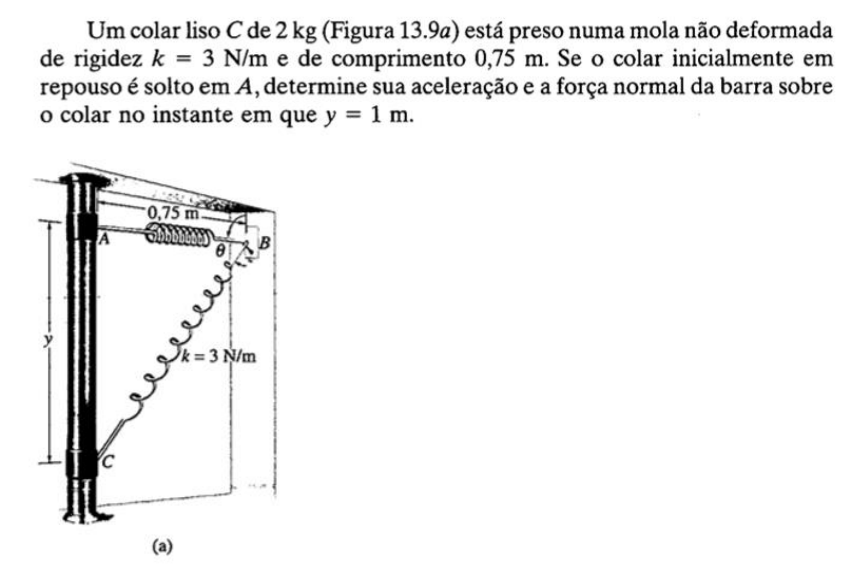 <p>Um colar liso C de 2 kg (Figura 13.9a) está preso numa mola não deformada de rigidez k = 3 N/m e de comprimento 0,75 m. Se o colar inicialmente em repouso é solto em A, determine sua aceleração e a força normal da barra sobre o colar no instante em que y = 1 m. 0,75 m A B k=3N/m C (a)</p>
