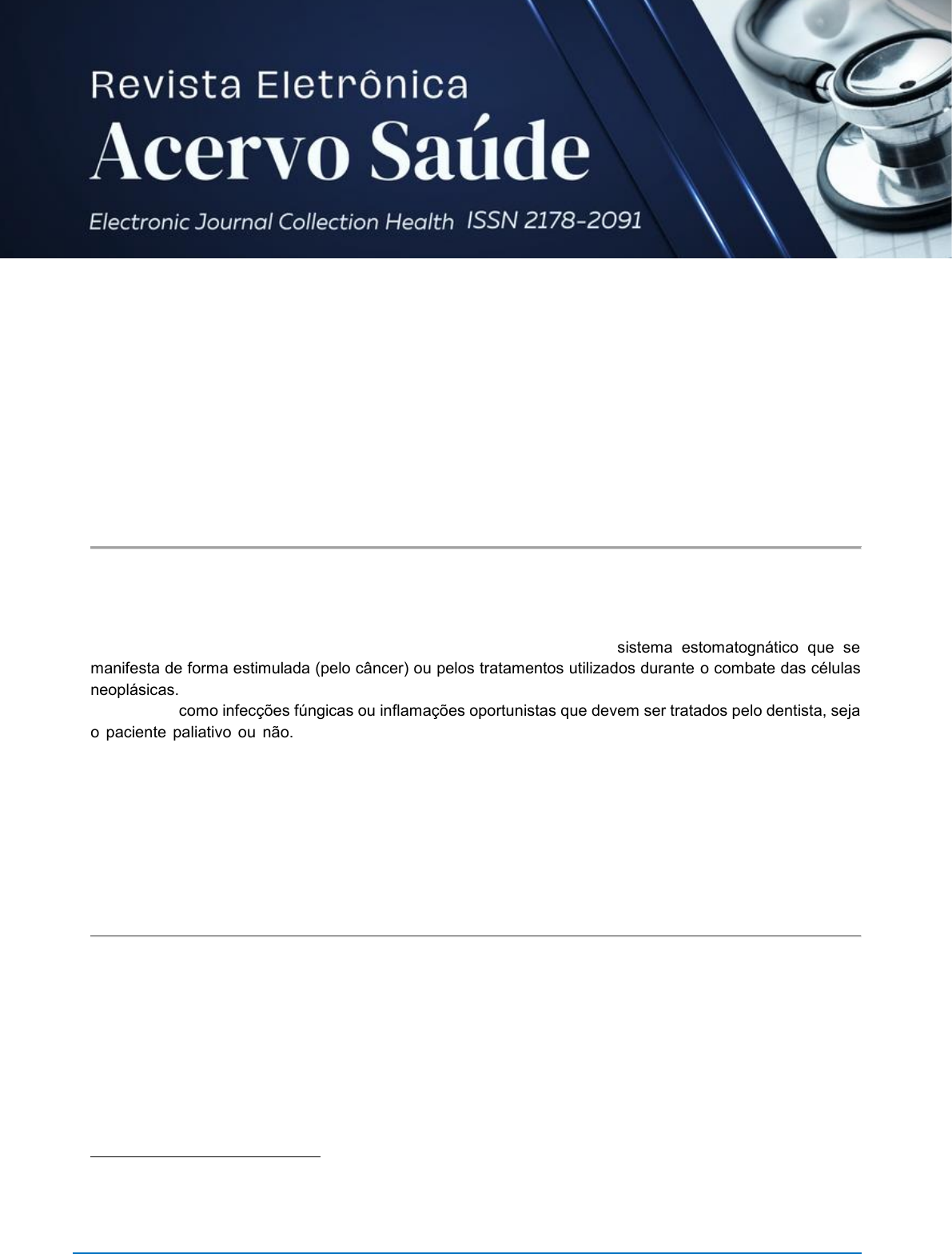 <p>Revista Eletrônica Acervo Saúde | ISSN 2178-2091</p><p>REAS | Vol. 23(5) | DOI: https://doi.org/10.25248/REAS.e12358.2023 Página 1 de 8</p><p>A relevância da odontologia e estomatologia no tratamento em</p><p>pacientes oncológicos</p><p>The relevance of dentistry and stomatology in the treatment of cancer patients</p><p>La relevancia de la odontología y la estomatología en el tratamiento de los pacientes</p><p>con câncer</p><p>Emilly Regina Matias Lima Bomfim1, Vanessa de Carla Batista dos Santos1, Débora Maria Tenório</p><p>Vitorino1, Max Heitor de Brito Lins1, Yvanna Angelo da Silva1, Katharina Jucá de Moraes Fernandes1.</p><p>RESUMO</p><p>Objetivo: Destacar a relevância e importância da odontologia e estomatologia frente à tratamentos</p><p>oncológicos, paliativos e manejo correto do paciente. Revisão bibliográfica: O cirurgião-dentista atua na</p><p>prevenção, correto diagnóstico e tratamento de lesões presentes no sistema estomatognático que se</p><p>manifesta de forma estimulada (pelo câncer) ou pelos tratamentos utilizados durante o combate das células</p><p>neoplásicas. Dessa forma, algumas dificuldades podem surgir durante o tratamento com quimioterapia e/ou</p><p>radioterapia como infecções fúngicas ou inflamações oportunistas que devem ser tratados pelo dentista, seja</p><p>o paciente paliativo ou não. Assim, essa revisão da literatura teve como destaque primordial, apontar as</p><p>principais doenças que podem aparecer em pacientes oncológicos e a importância de um odontólogo na</p><p>equipe multidisciplinar da oncologia. Torna-se importante e imprescindível uma maior atuação e participação</p><p>de dentistas na área da equipe multidisciplinar, visto que patologias orais em pacientes oncológicos existem</p><p>e foram comprovados por estudos da área. Considerações finais: O estudo ainda é limitado, principalmente</p><p>pela falta de dentistas na área antineoplásica. Além disso, estudos tem seu direcionamento para área de</p><p>enfermagem ou medicina, trazendo à luz uma grande necessidade de artigos na área odontológica. Em suma,</p><p>considera-se que o cirurgião-dentista é de vital importância no tratamento e manejo desses pacientes.</p><p>Palavras-chave: Estomatologia, Odontologia, Oncologia.</p><p>ABSTRACT</p><p>Objective: To highlight the relevance and importance of dentistry and stomatology in oncological treatments,</p><p>palliatives and correct management of the patient. Bibliographic review: The dental surgeon acts in the</p><p>prevention, correct diagnosis and treatment of lesions present in the stomatognathic system that manifest</p><p>themselves in a stimulated way (by cancer) or by the treatments used during the combat of neoplastic cells.</p><p>Thus, some difficulties may arise during treatment with chemotherapy and/or radiotherapy such as fungal</p><p>infections or opportunistic inflammations that must be treated by the dentist, whether the patient is palliative or</p><p>not. Thus, this literature review had as its primary highlight, to point out the main diseases that can appear in</p><p>1 Centro Universitário CESMAC, Maceió - AL.</p><p>SUBMETIDO EM: 2/2023 | ACEITO EM: 3/2023 | PUBLICADO EM: 5/2023</p><p>https://doi.org/10.25248/REAS.e12358.2023</p><p>Revista Eletrônica Acervo Saúde | ISSN 2178-2091</p><p>REAS | Vol. 23(5) | DOI: https://doi.org/10.25248/REAS.e12358.2023 Página 2 de 8</p><p>oncology patients and the importance of a dentist in the multidisciplinary oncology team. It becomes important</p><p>and indispensable a greater performance and participation of dentists in the multidisciplinary team, since oral</p><p>pathologies in oncologic patients exist and have been proven by studies in the area. Final considerations:</p><p>The study is still limited, mainly due to the lack of dentists in the antineoplastic area. Moreover, studies are</p><p>directed to the nursing or medical areas, bringing to light a great need for articles in the dental area. In</p><p>summary, it is considered that the dental surgeon is of vital importance in the treatment and management of</p><p>these patients.</p><p>Keywords: Stomatology, Dentistry, Oncology.</p><p>RESUMEN</p><p>Objetivo: Destacar la relevancia e importancia de la odontología y estomatología frente a los tratamientos</p><p>oncológicos, paliativos y correcto manejo del paciente. Revisión bibliográfica: El cirujano dentista actúa en</p><p>la prevención, correcto diagnóstico y tratamiento de las lesiones presentes en el sistema estomatognático que</p><p>se manifiesta de forma estimulada (por cáncer) o por los tratamientos utilizados durante el combate de las</p><p>células neoplásicas. De esta forma, pueden surgir algunas dificultades durante el tratamiento con</p><p>quimioterapia y/o radioterapia como infecciones fúngicas o inflamaciones oportunistas que deben ser tratadas</p><p>por el odontólogo, tanto si el paciente es paliativo como si no. Así, esta revisión bibliográfica tuvo como</p><p>principal destaque, señalar las principales enfermedades que pueden aparecer en pacientes oncológicos y la</p><p>importancia de un odontólogo en el equipo multidisciplinar de oncología. Se torna importante e imprescindible</p><p>una mayor actuación y participación de los odontólogos en el equipo multidisciplinario, ya que las patologías</p><p>bucales en pacientes con cáncer existen y han sido comprobadas por estudios en el área. Consideraciones</p><p>finales: El estudio aún es limitado, principalmente debido a la falta de odontólogos en el área antineoplásica.</p><p>Además, los estudios se dirigen al área de enfermería o medicina, lo que pone de manifiesto una gran</p><p>necesidad de artículos en el área odontológica. En definitiva, se considera que el cirujano-dentista es de vital</p><p>importancia en el tratamiento y manejo de estos pacientes.</p><p>Palabras clave: Estomatología, Odontología, Oncología.</p><p>INTRODUÇÃO</p><