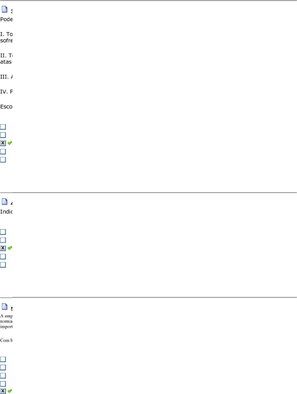<p>3a Questão (Ref.: 201307193184) Pontos: 1,0 / 1,0</p><p>Podem ser considerados artefatos de trabalho de um projeto de desenvolvimento:</p><p>I. Todos os programas que compõem o sistema, com exceção dos módulos de menu, que normalmente não</p><p>sofrem alterações.</p><p>II. Todos os documentos que são gerados dentro de um projeto de desenvolvimento, incluindo cronogramas,</p><p>atas de reunião e evidências de teste.</p><p>III. Alterações de requisitos enviados pelo cliente.</p><p>IV. Planejamento do projeto e cronogramas.</p><p>Escolha a alternativa correta:</p><p>Alternativas I, II e IV estão corretas.</p><p>Alternativas I e IV estão corretas.</p><p>Alternativas II, III e IV estão corretas.</p><p>Alternativas I, III e IV estão corretas.</p><p>Alternativas I e IV estão corretas.</p><p>4a Questão (Ref.: 201307162820) Pontos: 0,5 / 0,5</p><p>Indique a alternativa correta para definir CONHECIMENTO:</p><p>Símbolos, números, letras.</p><p>Dados analisados dentro de um contexto.</p><p>Experiência pessoal, informações analisadas, gerando ações ou decisões.</p><p>Conjunto de dados aos quais os seres humanos deram forma para torná-los significativos e úteis.</p><p>Fatos brutos que retratam ocorrências atuais ou do passado.</p><p>5a Questão (Ref.: 201307184988) Pontos: 0,5 / 0,5</p><p>A empresa de consultoria ARTMAIS está desenvolvendo um projeto de controle do acervo da História e Patrimônio Cultural da Saúde no Brasil, embasada nas</p><p>normas do PDS. Atualmente, o projeto encontra-se no último estágio do processo de validação das funcionalidades pelos usuários e clientes. É uma fase</p><p>importante na qual os usuários interagem com todo o sistema.</p><p>Com base no texto acima, identifique, nas opções abaixo, qual a atual fase de teste do PDS em que o projeto se encontra no momento.</p><p>Teste de sistemas</p><p>Teste da unidade</p><p>Teste de carga do sistema</p><p>Teste de integração</p><p>Teste de aceite</p><p>6a Questão (Ref.: 201307185524) Pontos: 0,5 / 0,5</p><p>Basicamente o que é um processo de software?</p><p>Um processo de software define como um produto deve ser entregue.</p><p>Um processo de software define como se testar.</p><p>Um processo de software define o que deve ser feito, como deve ser feito, por quem deve ser feito e</p><p>quando deve ser feito.</p><p>Um processo de software define que linguagem deve se usar.</p><p>Um processo de software define a forma como os requisitos devem ser levantados.</p><p>7a Questão (Ref.: 201307162596) Pontos: 0,0 / 1,0</p><p>O programa de Melhoria de Processo do Software Brasileiro estabelece:</p><p>as atividades de tecnologia da informação agrupadas em processos e esses em domínios</p><p>os estágios do ciclo de vida dos serviços de tecnologia da informação.</p><p>um modelo de processos de software, um método de avaliação e um modelo de negócio.</p><p>um modelo de áreas de processos representadas por categoria e por estágios.</p><p>os processos fundamentais, organizacionais e de apoio do ciclo de vida de software.</p><p>8a Questão (Ref.: 201307184183) Pontos: 0,5 / 0,5</p><p>Como forma de análise/levantamento de requisitos podemos utilizar várias técnicas. Cada item representa a</p><p>descrição de uma técnica:</p><p>=> O analista se insere no dia a dia da empresa, de forma a entender o funcionamento na prática;</p><p>=> O analista verifica relatórios e outros impressos da empresa;</p><p>=> É excelente para projetos que necessitam discussão de várias áreas da empresa.</p><p>Assinale a resposta que apresenta respectivamente as técnicas descritas.</p><p>Entrevista - Questionário - JAD</p><p>Entrevista - Análise de documentos - Brainstorm</p><p>Visita em Locco - Análise de documentos - JAD</p><p>Análise de documentos - Questionário - GED</p><p>Visita em Locco - Questionário - Análise de documentos</p><p>9a Questão (Ref.: 201307162821) Pontos: 0,5 / 0,5</p><p>Marque a alternativa correta que define Classe na modelagem orientada a objetos.</p><p>É uma propriedade das ligações de uma associação.</p><p>É a conexão física ou conceitual entre instâncias de objetos.</p><p>É um conceito, uma abstração, algo com limites nítidos e significado em relação à realidade estudada</p><p>(Rumbaugh, 1994).</p><p>Descreve um grupo de objetos com propriedades semelhantes (atributos), o mesmo comportamento</p><p>(operações) e conseqüentemente a mesma semântica (Rumbaugh, 1994).</p><p>Descreve um conjunto de ligação com estrutura e semântica comuns.</p><p>10a Questão (Ref.: 201307184970) Pontos: 0,0 / 0,5</p><p>Uma empresa resolveu desenvolver um sistema on-line utilizando o modelo de prototipação, pois ele executa uma abordagem top-down radical. Outros fatos que</p><p>fizeram com que o gerente desenvolvesse o sistema nesta metodologia são:</p><p>I- Porque durante cada interação, os requisitos e as soluções alternativas para o problema são identificadas e analisadas, novas soluções são projetadas e uma</p><p>parte do sistema é implementada.</p><p>II- Porque envolve a criação ou a aquisição dos vários componentes do sistema detalhados na fase de projeto, sua montagem e a disponibilização do sistema</p><p>novo ou da versão modificada.</p><p>III- Porque a prototipação tem inicio com a criação de um modelo preliminar de um grande subsistema ou de uma versão, em escala, do sistema todo.</p><p>Analisando as duas sentenças acima, assinale a única resposta correta:</p><p>Somente as sentenças I e II estão corretas</p><p>Somente a sentença II está correta</p><p>Somente as sentenças I e III estão corretas</p><p>Somente as sentenças II e III estão corretas</p><p>Todas as sentenças apresentadas estão corretas</p><p>Período de não visualização da prova: desde 30/05/2014 até 16/06/2014.</p><p>Avaliação: CCT0194_AV_201301262846 » PROCESSOS DE DESENVOLVIMENTO DE SOFTWARE</p><p>Tipo de Avaliação: AV</p><p>Aluno:</p><p>Professor: ED
