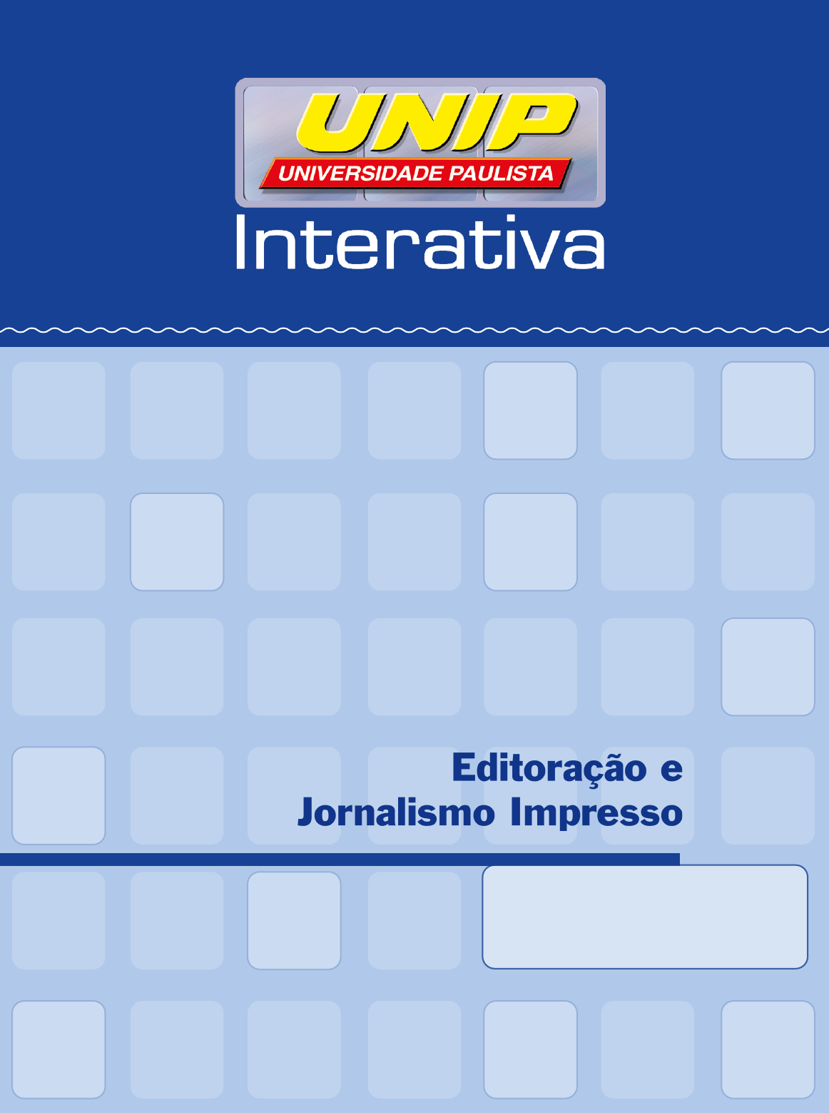 <p>Autora: Profa. Gisele Roncon</p><p>Colaboradores: Prof. Roni Everson Muraoka</p><p>Prof. Mauro Kiehn</p><p>Editoração e</p><p>Jornalismo Impresso</p><p>Professora conteudista: Gisele Roncon</p><p>Graduada em Design pela Fundação Armando Alvares Penteado (Faap) em 1997. Mestre em Comunicação pela</p><p>Universidade Paulista (UNIP) em 2013. Desde 2006, docente do curso de Design Gráfico da UNIP, onde também orienta</p><p>projetos acadêmicos nos cursos de Design Gráfico, Propaganda e Marketing, e Jornalismo. Tem uma empresa de design</p><p>na qual cria acessórios com materiais naturais, como algodão, couro e resina.</p><p>© Todos os direitos reservados. Nenhuma parte desta obra pode ser reproduzida ou transmitida por qualquer forma e/ou</p><p>quaisquer meios (eletrônico, incluindo fotocópia e gravação) ou arquivada em qualquer sistema ou banco de dados sem</p><p>permissão escrita da Universidade Paulista.</p><p>Dados Internacionais de Catalogação na Publicação (CIP)</p><p>R769e Roncon, Gisele.</p><p>Editoração e Jornalismo Impresso / Gisele Roncon. – São Paulo:</p><p>Editora Sol, 2021.</p><p>176 p., il.</p><p>Nota: este volume está publicado nos Cadernos de Estudos e</p><p>Pesquisas da UNIP, Série Didática, ISSN 1517-9230.</p><p>1. Texto. 2. Diagramação. 3. Editoração. I. Título.</p><p>CDU 76</p><p>U514.88 – 22</p><p>Prof. Dr. João Carlos Di Genio</p><p>Reitor</p><p>Profa. Sandra Miessa</p><p>Reitora em Exercício</p><p>Profa. Dra. Marilia Ancona Lopez</p><p>Vice-Reitora de Graduação</p><p>Profa. Dra. Marina Ancona Lopez Soligo</p><p>Vice-Reitora de Pós-Graduação e Pesquisa</p><p>Profa. Dra. Claudia Meucci Andreatini</p><p>Vice-Reitora de Administração</p><p>Prof. Dr. Paschoal Laercio Armonia</p><p>Vice-Reitor de Extensão</p><p>Prof. Fábio Romeu de Carvalho</p><p>Vice-Reitor de Planejamento e Finanças</p><p>Profa. Melânia Dalla Torre</p><p>Vice-Reitora de Unidades do Interior</p><p>Unip Interativa</p><p>Profa. Elisabete Brihy</p><p>Prof. Marcelo Vannini</p><p>Prof. Dr. Luiz Felipe Scabar</p><p>Prof. Ivan Daliberto Frugoli</p><p>Material Didático</p><p>Comissão editorial:</p><p>Profa. Dra. Christiane Mazur Doi</p><p>Profa. Dra. Angélica L. Carlini</p><p>Profa. Dra. Ronilda Ribeiro</p><p>Apoio:</p><p>Profa. Cláudia Regina Baptista</p><p>Profa. Deise Alcantara Carreiro</p><p>Projeto gráfico:</p><p>Prof. Alexandre Ponzetto</p><p>Revisão:</p><p>Ricardo Duarte</p><p>Kleber Souza</p><p>Sumário</p><p>Editoração e Jornalismo Impresso</p><p>APRESENTAÇÃO ......................................................................................................................................................7</p><p>INTRODUÇÃO ...........................................................................................................................................................7</p><p>Unidade I</p><p>1 DESIGN GRÁFICO E DESIGN EDITORIAL ................................................................................................. 11</p><p>2 IDENTIDADE VISUAL E ELEMENTOS GRÁFICOS ................................................................................... 12</p><p>3 COMPREENSÃO DA FORMA DA LETRA ................................................................................................... 13</p><p>3.1 Nomenclatura ........................................................................................................................................ 14</p><p>3.2 Anatomia ................................................................................................................................................. 15</p><p>3.3 Peso e largura......................................................................................................................................... 17</p><p>3.3.1 Peso .............................................................................................................................................................. 18</p><p>3.3.2 Largura ........................................................................................................................................................ 18</p><p>3.4 História da tipografia ........................................................................................................................ 20</p><p>3.4.1 Criação dos tipos gráficos ................................................................................................................... 22</p><p>3.4.2 Classificação dos tipos gráficos ........................................................................................................ 23</p><p>3.4.3 Curiosidades de algumas fontes conhecidas ............................................................................. 29</p><p>3.4.4 Evolução tipográfica ............................................................................................................................ 29</p><p>3.5 Combinação de tipos .......................................................................................................................... 30</p><p>4 PALAVRA E TEXTO ............................................................................................................................................ 33</p><p>4.1 Palavra....................................................................................................................................................... 33</p><p>4.1.1 Kerning ........................................................................................................................................................ 33</p><p>4.1.2 Tracking ....................................................................................................................................................... 33</p><p>4.1.3 Diagramação de títulos e subtítulos ............................................................................................... 35</p><p>4.2 Texto .............................................