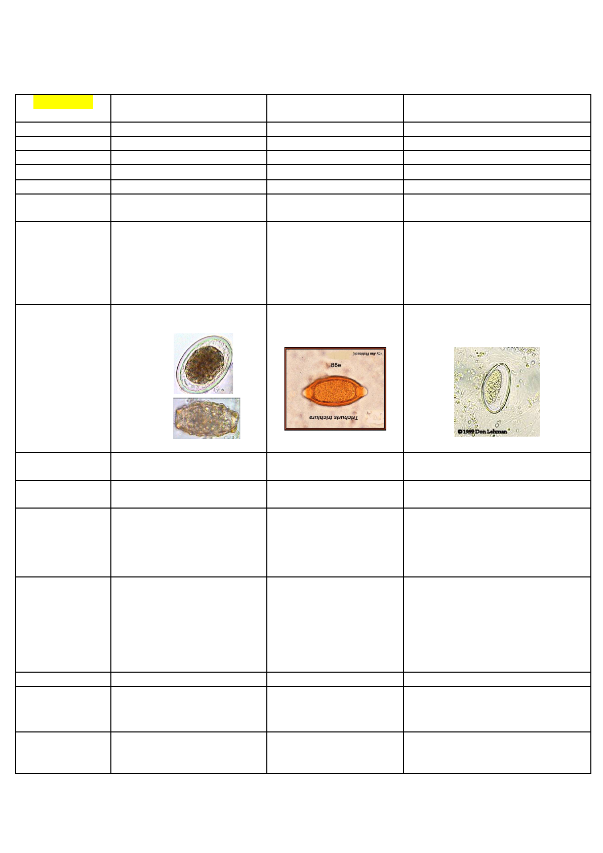 <p>NEMATODOS Ascaris lumbricoides Trichuris trichuria Enterobius vermiculares</p><p>Filo Nematoda Nematoda Nematoda</p><p>Classe Sacernentea Adenophorea Sacernentea</p><p>Sub Família Ascaridoidea Trichuroidea Ascaridíase</p><p>Família Ascarididae Tricuridae Oxyuridae</p><p>Gênero Ascaris Trichuris Enterobius</p><p>T Adulto M: 20-30 cm</p><p>F: 30-40 cm</p><p>M: 3 cm</p><p>F: 4 cm</p><p>M: 5 mm</p><p>F: 1 mm</p><p>Forma adulto M: posterior circular e 2</p><p>espículas</p><p>F:posterior reta, boca</p><p>trilobulada e frente afilada</p><p>M: cauda enrolada, 1</p><p>espícula</p><p>F: cauda reta</p><p>Alças cefálicas- órgão sensorial de</p><p>expansão da boca</p><p>M: cauda , eliminado após a</p><p>fecundação</p><p>F: cauda</p><p>Ovo: MI e E + camada proteica,</p><p>produzida no oviduto.</p><p>Fértil:</p><p>Infértil:</p><p>MExterna (massas</p><p>mucólicas) + duas I.</p><p>± 50 μm X 22 μm</p><p>± 50 μm X 20 μm</p><p>5 a 16 mil ovos embrionado postados</p><p>pela fêmea no RETO</p><p>T. Larva ± 50 μm X 22 μm</p><p>Tipos de larva L1; L2 E L3 (infectantes); L4 e L5</p><p>já após perfurar pulmão</p><p>Ciclo Monoxênico (ciclo de vida</p><p>apenas no hosp. D) e</p><p>estenoxênico (apenas numa</p><p>espécie)</p><p>Monoxênico</p><p>Estenoxênico</p><p>Geohelminto (passa por</p><p>fase que se desenv. na</p><p>terra)</p><p>Monoxênico</p><p>Explicação ciclo Fezes => ambiente =></p><p>embrionam se férteis => L1 =></p><p>L2 => L3 => infecção =></p><p>intestino, sangue, fígado,</p><p>coração D, pulmão, traqueia,</p><p>laringe => L5</p><p>Fezes c/ ovo fértil n</p><p>embrionado => embriona</p><p>no solo => L. infectante</p><p>=> ingere => eclode no</p><p>intestino direto (É</p><p>ANAEROBIA</p><p>FACULTATIVA)</p><p>Ingestão de ovos (amadurecem 4-6 h)</p><p>=> digestão da casca => reprodução</p><p>=> após um mês as fêmeas vao para a</p><p>parte peri-anal</p><p>Doença ascarídiase</p><p>Patogenia L – problemas pulmonares</p><p>A – espoliação, falta de</p><p>nutrientes.</p><p>Maiores: úlcera e abcesso</p><p>Maçiças: anemia e</p><p>prolapso retal</p><p>Prurido anal, enterite catarral, ovarite,</p><p>salpingite, vaginite</p><p>Sintomas: Cólica, má digestão, náusea,</p><p>meningite, irritabilidade,</p><p>convulão.</p><p>Prurido anal, náusea, dor epigastrica</p><p>Tratamento Albendazol, Invermectina,</p><p>Tetramizole, Piperazina</p><p>Albendazol, Invermectina,</p><p>Tetramizole, Piperazina</p><p>Albendazol (400 mg), Pirantel ,</p><p>Mebendazol, Piperazina (Doses de 50</p><p>a 75mg por cinco dias)</p><p>Profilaxia Educação sanitária e</p><p>tratamento doentes</p><p>Educação sanitária e</p><p>tratamento doentes</p><p>Tratar coletividade, cuidado com</p><p>roupa, cortar unha e limpar com</p><p>aspirador</p><p>Epidemio. Áreas tropicais Zona urbana Cosmopolita de locais frios.</p><p>Trasmissão Ingestão de ovos contaminados Ingestão de ovos Hetero: de alguém doente</p><p>Autoinf externa: coça, mão, boca</p><p>Autoinfec interna: qdo ovos rompem</p><p>antes ( no intestino)</p><p>Retroinfeccção: qdo rompe antes de</p><p>chegar ao reto</p><p>Indireta:</p><p>Diagnóstico EPF – método de LUTZ. Pesquisa com fita adesiva gomada</p><p>Características + Os ovos não precisam ser</p><p>fertilizados, mas devem ser</p><p>férteis e embrionados. –</p><p>inférteis tem cerca de 60</p><p>micrometros, de camada</p><p>granulosa.</p><p>FÊMEAS LIBERAM OS OVOS JÁ COM AS</p><p>LARVAS DENTRO!!!</p><p>NÃO É GEO-HELMINTO!!</p><p>É o que dá coceira anal</p><p>Onde vivem Intestino delgado, jejuno e íleo. Intestino grosso ++ ceco. Ceco ou apêndice cecal</p><p>P. pré patente 2 meses até L3( na</p><p>região torácica) => contamina HD</p><p>ao sugar sangue => L3 vai p vasos</p><p>=> fêmeas são fertilizadas =></p><p>Ciclo pulmonar => adultos</p><p>no ID. => ovo nas fezes =></p><p>larva rabditoide 1-2 dias =></p><p>larva filarioide (solo) 6 sem</p><p>=> penetra pela pele.</p><p>Larva F. de fêmea partenogênica (FP) no solo</p><p>=> penetra pela pele => passa pela cs e</p><p>pulmão => verme adulto de FP no intestino</p><p>=> autofecundação (é 3n) => eclosão no</p><p>intestino na forma de Larva R. => fezes => 3n</p><p>vira filarióide e infecta</p><p>A Larva R. pode ser n (macho de vida livre),</p><p>2n (femea de vida livre) e 3n( FP)</p><p>Macho VL e femea VL cruzam e geram</p><p>rabditoide q podem contaminar</p><p>Doença Elefantíase Ancilostomose/amarelão Strongiloidiase</p><p>Patogenia Filariose linfática – causa edema</p><p>Reações inflamatórias:</p><p>granuloma, inchaço pq mto</p><p>eosinófilos,</p><p>Ações mecânicas: dilatação dos</p><p>vasos</p><p>Acoes irritativa por causa do prod</p><p>do metabolismo.</p><p>Alteração cuanea, aparecimento de larva</p><p>migrans, estrongiloidose disseminada</p><p>Sintomas: Agudo: febre, dor e inflamação</p><p>Cronico: elefantíase</p><p>Coceira(penetração), tosse,</p><p>eosinofilia, dor abdominal,</p><p>anemia e subnutrição.</p><p>Tratamento Albendazol</p><p>Dietil carbamazina: 2mg/kg/ 3</p><p>vezes dia via oral por 12 dias</p><p>Invermectina: dose única de</p><p>100-400 µg/kg</p><p>Antibióticos pois relação de</p><p>simbiose com bactérias.</p><p>Albendazol</p><p>Mebendazol e Pirantel</p><p>Tiabendazol, Cambendazol</p><p>Profilaxia Combater vetor, tratar doente,</p><p>repelente, mosquitos (...)</p><p>Sanemanto, uso de</p><p>calçados, plantio de capim</p><p>cidreira.</p><p>Usar luvas e calçados em contato com o solo</p><p>Epidemio. Africa, Asia, América Sul e Central</p><p>BR: PE e AL</p><p>Regiões quentes e úmidas/ cosmopolita</p><p>Trasmissão HI-HD Mosquito transmite em L3</p><p>HD-HI homem transmite a</p><p>microfilária</p><p>Hetero infecção: tava no solo e contaminou</p><p>Auto infecção – interna:</p><p>Auto infecção – externa: vira filarioide dentro</p><p>do intestino</p><p>Diagnóstico Clínica: febre, eosinofilia,</p><p>adenolinfoma</p><p>Laboratorial: méto
