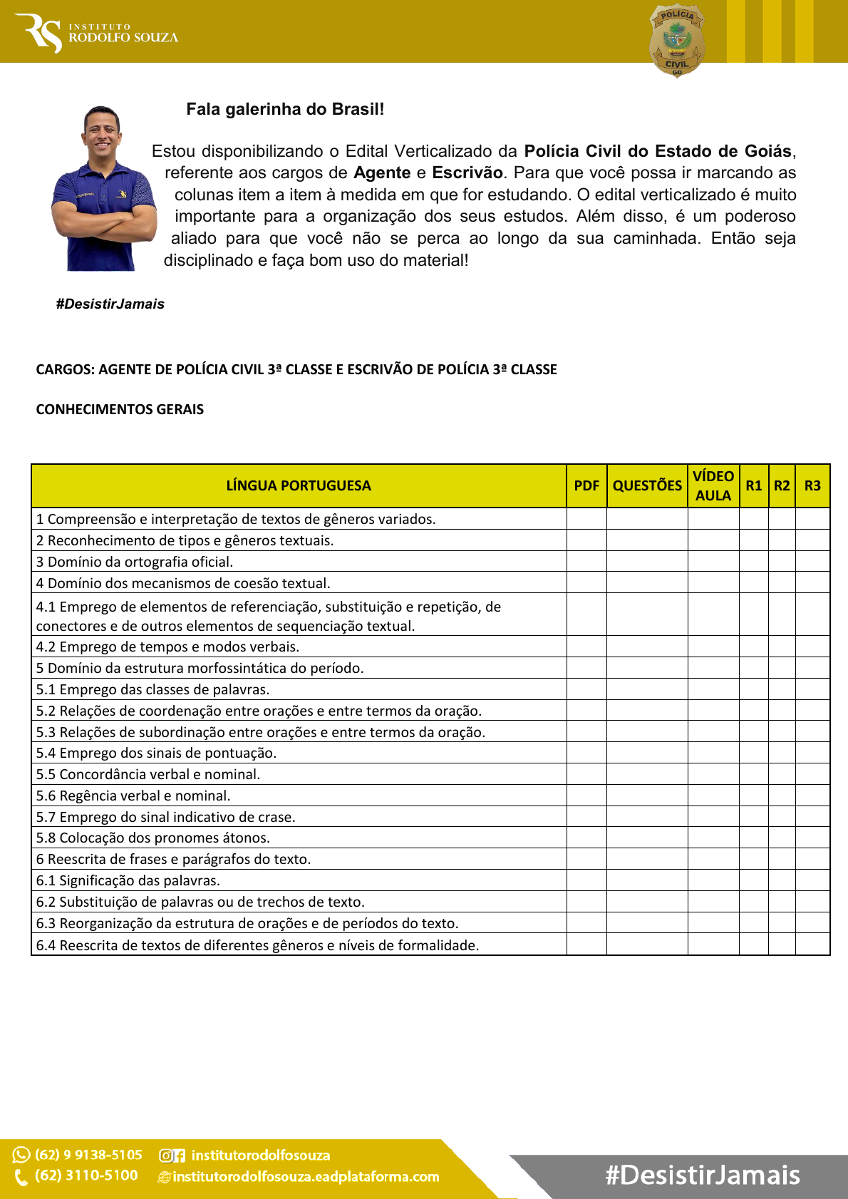<p>Fala galerinha do Brasil!</p><p>Estou disponibilizando o Edital Verticalizado da Polícia Civil do Estado de Goiás,</p><p>referente aos cargos de Agente e Escrivão. Para que você possa ir marcando as</p><p>colunas item a item à medida em que for estudando. O edital verticalizado é muito</p><p>importante para a organização dos seus estudos. Além disso, é um poderoso</p><p>aliado para que você não se perca ao longo da sua caminhada. Então seja</p><p>disciplinado e faça bom uso do material!</p><p>#DesistirJamais</p><p>CARGOS: AGENTE DE POLÍCIA CIVIL 3ª CLASSE E ESCRIVÃO DE POLÍCIA 3ª CLASSE</p><p>CONHECIMENTOS GERAIS</p><p>LÍNGUA PORTUGUESA PDF QUESTÕES</p><p>VÍDEO</p><p>AULA</p><p>R1 R2 R3</p><p>1 Compreensão e interpretação de textos de gêneros variados.</p><p>2 Reconhecimento de tipos e gêneros textuais.</p><p>3 Domínio da ortografia oficial.</p><p>4 Domínio dos mecanismos de coesão textual.</p><p>4.1 Emprego de elementos de referenciação, substituição e repetição, de</p><p>conectores e de outros elementos de sequenciação textual.</p><p>4.2 Emprego de tempos e modos verbais.</p><p>5 Domínio da estrutura morfossintática do período.</p><p>5.1 Emprego das classes de palavras.</p><p>5.2 Relações de coordenação entre orações e entre termos da oração.</p><p>5.3 Relações de subordinação entre orações e entre termos da oração.</p><p>5.4 Emprego dos sinais de pontuação.</p><p>5.5 Concordância verbal e nominal.</p><p>5.6 Regência verbal e nominal.</p><p>5.7 Emprego do sinal indicativo de crase.</p><p>5.8 Colocação dos pronomes átonos.</p><p>6 Reescrita de frases e parágrafos do texto.</p><p>6.1 Significação das palavras.</p><p>6.2 Substituição de palavras ou de trechos de texto.</p><p>6.3 Reorganização da estrutura de orações e de períodos do texto.</p><p>6.4 Reescrita de textos de diferentes gêneros e níveis de formalidade.</p><p>10702 - 45.173.255.70 - 01298613167</p><p>10702 - 45.173.255.70 - 01298613167</p><p>3</p><p>REALIDADE ÉTNICA, SOCIAL, HISTÓRICA, GEOGRÁFICA, CULTURAL, POLÍTICA E</p><p>ECONÔMICA DO ESTADO DE GOIÁS</p><p>PDF QUESTÕES</p><p>VÍDEO</p><p>AULA</p><p>R1 R2 R3</p><p>1 Formação econômica de Goiás: a mineração no século XVIII, a agropecuária nos</p><p>séculos XIX e XX, a estrada de ferro e a modernização da economia goiana, as</p><p>transformações econômicas com a construção de Goiânia e Brasília,</p><p>industrialização, infraestrutura e planejamento.</p><p>2 Modernização da agricultura e urbanização do território goiano.</p><p>3 População goiana: povoamento, movimentos migratórios e densidade</p><p>demográfica.</p><p>4 Economia goiana: industrialização e infraestrutura de transportes e</p><p>comunicação.</p><p>5 As regiões goianas e as desigualdades regionais.</p><p>6 Aspectos físicos do território goiano: vegetação, hidrografia, clima e relevo.</p><p>6 Aspectos da história política de Goiás: a independência em Goiás, o coronelismo</p><p>na República Velha, as oligarquias, a Revolução de 1930, a administração política</p><p>de 1930 até os dias atuais.</p><p>7 Aspectos da História Social de Goiás: o povoamento branco, os grupos</p><p>indígenas, a escravidão e cultura negra, os movimentos sociais no campo e a</p><p>cultura popular.</p><p>8 Atualidades econômicas, políticas e sociais do Brasil, especialmente do Estado</p><p>de Goiás.</p><p>RACIOCÍNIO LÓGICO PDF QUESTÕES</p><p>VÍDEO</p><p>AULA</p><p>R1 R2 R3</p><p>1 Estruturas lógicas.</p><p>2 Lógica de argumentação: analogias, inferências, deduções e conclusões.</p><p>3 Lógica sentencial (ou proposicional).</p><p>3.1 Proposições simples e compostas.</p><p>3.2 Tabelas verdade.</p><p>3.3 Equivalências.</p><p>3.4 Leis de De Morgan.</p><p>3.5 Diagramas lógicos.</p><p>4 Lógica de primeira ordem.</p><p>5 Princípios de contagem e probabilidade.</p><p>6 Operações com conjuntos.</p><p>7 Raciocínio lógico envolvendo problemas aritméticos, geométricos e matriciais.</p><p>CONHECIMENTOS ESPECÍFICOS</p><p>NOÇÕES DE DIREITO ADMINISTRATIVO PDF QUESTÕES</p><p>VÍDEO</p><p>AULA</p><p>R1 R2 R3</p><p>1 Estado, Governo e Administração Pública.</p><p>1.1 Conceitos, elementos, poderes e organização.</p><p>1.2 Natureza, fins e princípios.</p><p>2 Organização administrativa da União: administração direta e indireta.</p><p>3 Atos administrativos.</p><p>3.1 Conceitos, requisitos, elementos, pressupostos e classificação.</p><p>3.2 Fato e ato administrativo.</p><p>10702 - 45.173.255.70 - 01298613167</p><p>10702 - 45.173.255.70 - 01298613167</p><p>3</p><p>3.3 Atos administrativos em espécie.</p><p>3.4 O silêncio no direito administrativo.</p><p>3.5 Cassação.</p><p>3.6 Revogação e anulação.</p><p>3.7 Processo administrativo (Lei estadual n.º 13.800/2001).</p><p>3.8 Fatos da administração pública: atos da administração pública e fatos</p><p>administrativos.</p><p>3.9 Formação do ato administrativo: elementos, procedimento administrativo.</p><p>3.10 Validade, eficácia e autoexecutoriedade do ato administrativo.</p><p>3.11 Atos administrativos simples, complexos e compostos.</p><p>3.12 Atos administrativos unilaterais, bilaterais e multilaterais.</p><p>3.13 Atos administrativos gerais e individuais.</p><p>3.14 Atos administrativos vinculados e discricionários.</p><p>3.15 Mérito do ato administrativo, discricionariedade.</p><p>3.16 Ato administrativo inexistente.</p><p>3.17 Teoria das nulidades no direito administrativo.</p><p>3.18 Atos administrativos nulos e anuláveis.</p><p>3.19 Vícios do ato administrativo.</p><p>3.20 Teoria dos motivos determinantes.</p><p>3.21 Revogação, anulação e convalidação do ato administrativo.</p><p>4 Poderes administrativos.</p><p>4.1 Poder hierárquico.</p><p>4.2 Poder disciplinar.</p><p>4.3 Poder regulamentar.</p><p>4.4 Poder de polícia.</p><p>4.5 Uso e abuso do poder.</p><p>5 Controle e responsabilização da administraç