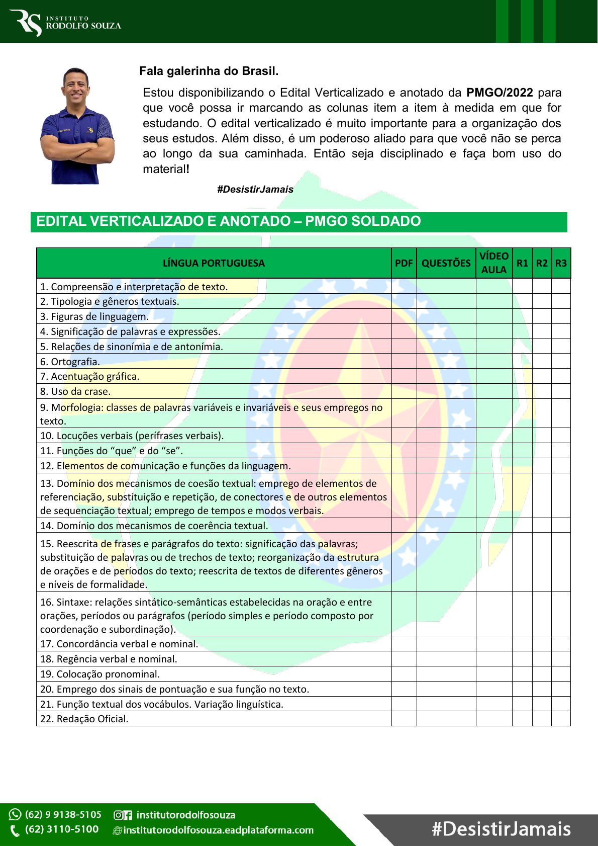 <p>Fala galerinha do Brasil.</p><p>Estou disponibilizando o Edital Verticalizado e anotado da PMGO/2022 para</p><p>que você possa ir marcando as colunas item a item à medida em que for</p><p>estudando. O edital verticalizado é muito importante para a organização dos</p><p>seus estudos. Além disso, é um poderoso aliado para que você não se perca</p><p>ao longo da sua caminhada. Então seja disciplinado e faça bom uso do</p><p>material!</p><p>#DesistirJamais</p><p>EDITAL VERTICALIZADO E ANOTADO – PMGO SOLDADO</p><p>LÍNGUA PORTUGUESA PDF QUESTÕES</p><p>VÍDEO</p><p>AULA</p><p>R1 R2 R3</p><p>1. Compreensão e interpretação de texto.</p><p>2. Tipologia e gêneros textuais.</p><p>3. Figuras de linguagem.</p><p>4. Significação de palavras e expressões.</p><p>5. Relações de sinonímia e de antonímia.</p><p>6. Ortografia.</p><p>7. Acentuação gráfica.</p><p>8. Uso da crase.</p><p>9. Morfologia: classes de palavras variáveis e invariáveis e seus empregos no</p><p>texto.</p><p>10. Locuções verbais (perífrases verbais).</p><p>11. Funções do “que” e do “se”.</p><p>12. Elementos de comunicação e funções da linguagem.</p><p>13. Domínio dos mecanismos de coesão textual: emprego de elementos de</p><p>referenciação, substituição e repetição, de conectores e de outros elementos</p><p>de sequenciação textual; emprego de tempos e modos verbais.</p><p>14. Domínio dos mecanismos de coerência textual.</p><p>15. Reescrita de frases e parágrafos do texto: significação das palavras;</p><p>substituição de palavras ou de trechos de texto; reorganização da estrutura</p><p>de orações e de períodos do texto; reescrita de textos de diferentes gêneros</p><p>e níveis de formalidade.</p><p>16. Sintaxe: relações sintático-semânticas estabelecidas na oração e entre</p><p>orações, períodos ou parágrafos (período simples e período composto por</p><p>coordenação e subordinação).</p><p>17. Concordância verbal e nominal.</p><p>18. Regência verbal e nominal.</p><p>19. Colocação pronominal.</p><p>20. Emprego dos sinais de pontuação e sua função no texto.</p><p>21. Função textual dos vocábulos. Variação linguística.</p><p>22. Redação Oficial.</p><p>10702 - 45.173.255.70 - 01298613167</p><p>10702 - 45.173.255.70 - 01298613167</p><p>REALIDADE ÉTNICA, SOCIAL, HISTÓRICA, GEOGRÁFICA, CULTURAL,</p><p>POLÍTICA E ECONÔMICA DO ESTADO DE GOIÁS:</p><p>PDF QUESTÕES</p><p>VÍDEO</p><p>AULA</p><p>R1 R2 R3</p><p>1. Formação econômica de Goiás: a mineração no século XVIII, a</p><p>agropecuária nos séculos XIX e XX, a estrada de ferro e a modernização da</p><p>economia goiana, as transformações econômicas com a construção de</p><p>Goiânia, industrialização, infraestrutura e planejamento.</p><p>2. Aspectos físicos do território goiano: vegetação, hidrografia, clima e</p><p>relevo.</p><p>3. Aspectos da história política de Goiás: os bandeirantes e a colonização, o</p><p>coronelismo e oligarquia na República Velha, a Revolução de 1930, aspectos</p><p>políticos e administrativos de 1930 até os dias atuais.</p><p>4. Aspectos da História Sociocultural de Goiás: o povoamento branco, os</p><p>grupos indígenas, a escravidão e cultura negra, os movimentos sociais no</p><p>campo e a cultura popular goiana.</p><p>5. Atualidades econômicas, políticas, sociais e culturais do Estado de Goiás.</p><p>NOÇÕES DE DIREITO PENAL PDF QUESTÕES</p><p>VÍDEO</p><p>AULA</p><p>R1 R2 R3</p><p>1. Aplicação da lei penal.</p><p>1.1. Princípios da legalidade e da anterioridade.</p><p>1.2 A lei penal no tempo e no espaço.</p><p>1.3 Tempo e lugar do crime.</p><p>1.4. Lei penal excepcional, especial e temporária.</p><p>1.5. Territorialidade e extraterritorialidade da lei penal.</p><p>1.6. Pena cumprida no estrangeiro.</p><p>1.7. Eficácia da sentença estrangeira.</p><p>1.8. Contagem de prazo.</p><p>1.9. Frações não computáveis da pena.</p><p>1.10. Interpretação da lei penal.</p><p>1.11. Analogia.</p><p>1.12. Irretroatividade da lei penal.</p><p>1.13. Conflito aparente de normas penais.</p><p>2. Crimes contra a pessoa.</p><p>3. Crimes contra o patrimônio.</p><p>4. Crimes contra a administração pública.</p><p>5. Disposições constitucionais aplicáveis ao direito penal.</p><p>6. Lei Maria da Penha (Lei federal nº 11.340/2006, arts. 01 a 07).</p><p>NOÇÕES DE DIREITO CONSTITUCIONAL PDF QUESTÕES</p><p>VÍDEO</p><p>AULA</p><p>R1 R2 R3</p><p>1. Dos princípios fundamentais.</p><p>1.1. Dos direitos e garantias fundamentais (direitos e deveres individuais e</p><p>coletivos, nacionalidade).</p><p>1.2. Da organização do Estado (organização político-administrativa, União,</p><p>Estados Federados, Municípios, Distrito Federal e Territórios, militares dos</p><p>Estados, Distrito Federal e Territórios).</p><p>10702 - 45.173.255.70 - 01298613167</p><p>10702 - 45.173.255.70 - 01298613167</p><p>1.3. Da organização dos poderes (poder legislativo, congresso nacional,</p><p>atribuições do congresso nacional, câmara dos deputados, senado federal,</p><p>deputados e senadores, processo legislativo, poder executivo).</p><p>1.4. Da defesa do Estado e das Instituições Democráticas (estado de defesa e</p><p>estado de sítio, Forças Armadas, segurança pública).</p><p>1.5. Da administração pública.</p><p>NOÇÕES DE DIREITO PROCESSUAL PENAL PDF QUESTÕES</p><p>VÍDEO</p><p>AULA</p><p>R1 R2 R3</p><p>1. Aplicação da lei processual no tempo, no espaço e em relação às pessoas.</p><p>1.1. Disposições preliminares do Código de Processo Penal.</p><p>2. Inquérito policial.</p><p>3. Ação penal.</p><p>4. Prisão, medidas cautelares e liberdade provisória</p><p>4.1. Lei federal nº 7.960/1989 (prisão temporária).</p><p>5. Processo e julgamento dos crimes de responsabilidade dos funcionários</p><p>públicos.</p><p>6. O habeas corpus e seu processo.</p><p>7. Jurisdição e competência.</p><p>8. Das questões e processos 