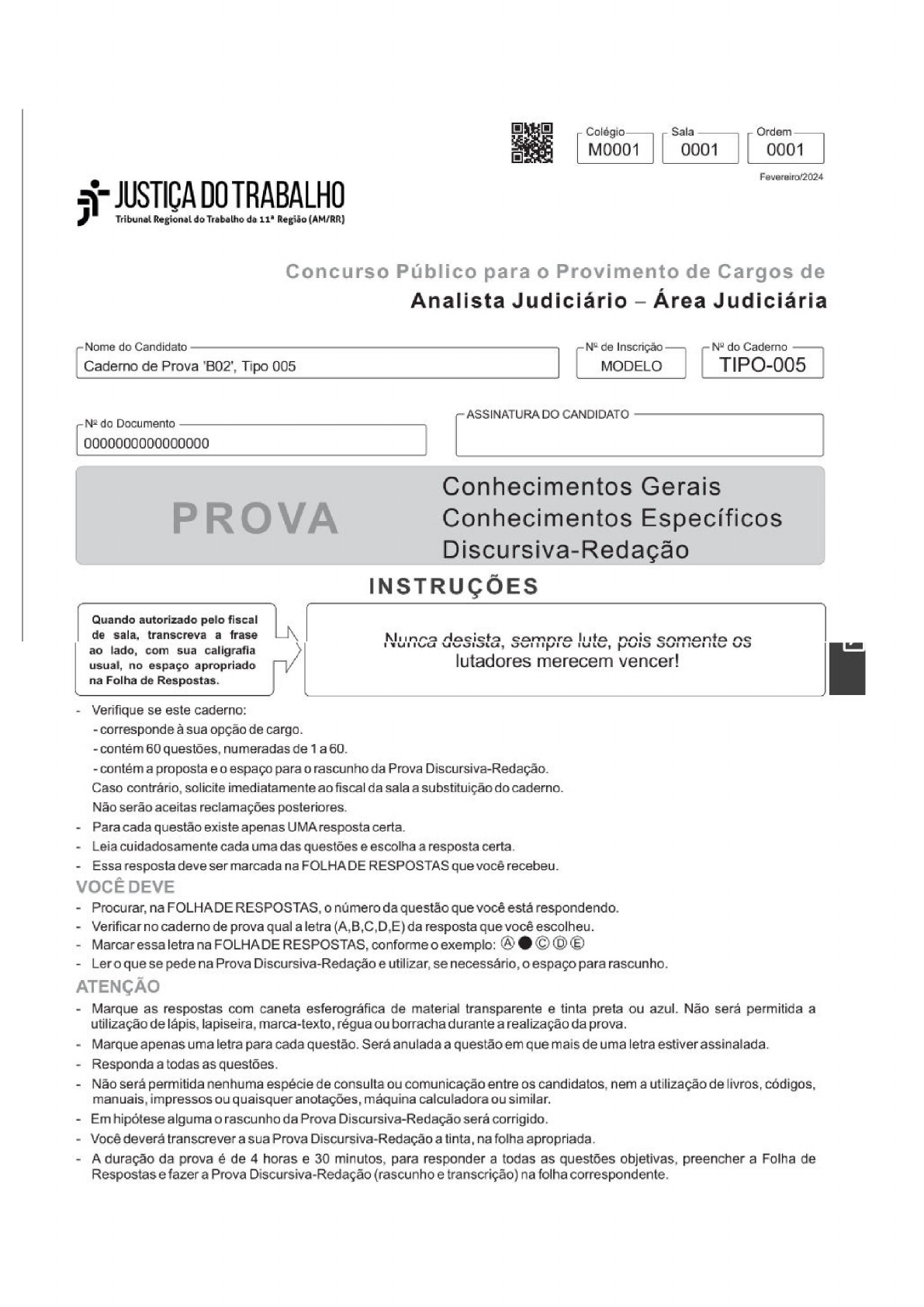 <p>EI Colégio Sala Ordem</p><p>E | MO004 | 0001 | 0001</p><p>Feverairo/2024</p><p>a JUSTIÇA DO TRABALHO</p><p>Tribunal Regional do Trabalho da 11º Região (AM/RR)</p><p>Concurso Público para o Provimento de Cargos de</p><p>Analista Judiciário - Área Judiciária</p><p>- Nome do Candidato | Nº de Inscrição —, —Nº do Cademo —</p><p>| Caderno de Prova 'B0O2', Tipo 005 MODELO TIPO-005 |</p><p>[ Nº do Documento |</p><p>ASSINATURA DO CANDIDATO</p><p>0000000000000000 |</p><p>Conhecimentos Gerais</p><p>PROVA Conhecimentos Específicos</p><p>Discursiva-Redação</p><p>INSTRUÇÕES</p><p>Quando autorizado pelo fiscal</p><p>de sala, transcreva a frase</p><p>ao lado, com sua caligrafia</p><p>usual, no espaço apropriado lutadore</p><p>na Folha de Respostas.</p><p>a nnie enmanta</p><p>VA Lis pPeta somel TEA</p><p>merecem vencer!</p><p>a</p><p>La,</p><p>a</p><p>Verifique se este caderno:</p><p>- corresponde à sua opção de cargo.</p><p>- contém 60 questões, numeradas de 1 a 60,</p><p>- contém a proposta e o espaço para o rascunho da Prova Discursiva-Redação.</p><p>Caso contrário, solicite imediatamente ao fiscal da sala a substituição do caderno.</p><p>Não serão aceitas reclamações posteriores.</p><p>- Paracada questão existe apenas UMA resposta certa.</p><p>- Leia cuidadosamente cada uma das questões e escolha a resposta certa.</p><p>- Essa resposta deve ser marcada na FOLHA DE RESPOSTAS que você recebeu.</p><p>VOCÊ DEVE</p><p>- Procurar, na FOLHADE RESPOSTAS, o número da questão que você está respondendo.</p><p>- Verificar no caderno de prova qual aletra (A,B,C,D,E) da resposta que você escolheu.</p><p>- Marcar essa letrana FOLHADE RESPOSTAS. conforme o exemplo: BM0ODEO</p><p>- Leroquese pede na Prova Discursiva-Redação e utilizar, se necessário, o espaço para rascunho.</p><p>ATENÇÃO</p><p>- Marque as respostas com caneta esferográfica de material transparente e tinta preta ou azul. Não será permitida a</p><p>utilização de lápis, lapiseira, marca-texto, régua ou borracha durante a realização da prova.</p><p>- Marque apenas uma letra para cada questão. Será anulada a questão em que mais de uma letra estiver assinalada.</p><p>- Responda a todas as questões.</p><p>- Não será permitida nenhuma espécie de consulta ou comunicação entre os candidatos, nem a utilização de livros, códigos,</p><p>manuais, impressos ou quaisquer anotações, máquina calculadora ou similar.</p><p>- Emhipótese alguma o rascunho da Prova Discursiva-Redação será corrigido.</p><p>- Você deverá transcrever a sua Prova Discursiva-Redação a tinta, na folha apropriada.</p><p>- A duração da prova é de 4 horas e 30 minutos, para responder a todas as questões objetivas, preencher a Folha de</p><p>Respostas e fazer a Prova Discursiva-Redação (rascunho e transcrição) na folha correspondente.</p><p>- A duração da prova é de 4 horas e 30 minutos, para responder a todas as questões objetivas, preencher a Folha de</p><p>Respostas e fazer a Prova Discursiva-Redação (rascunho e transcrição) na folha correspondente.</p><p>- Aoterminar a prova, chame o fiscal e devolva todo o material recebido para conferência.</p><p>- Eproibida a divulgação ou impressão parcial outotal da presente prova. Direitos Reservados.</p><p>Fundação earios Chagas</p><p>ENE A Cademo de Prova 'BO2', Tipo 005</p><p>CONHECIMENTOS GERAIS</p><p>Língua Portuguesa</p><p>Atenção: Para responder às questões de números 1 a 7, baseie-se no texto abaixo.</p><p>Temos que acreditar</p><p>Será que podemos entender o mundo sem algum tipo de crença? Esta é uma pergunta central na dicotomia entre ciência e fé.</p><p>De fato, o modo como um individuo escolhe responder a ela determina, em grande parte, como se relaciona com o mundo e a vida em</p><p>geral. Contrastando as explicações míticas e cientificas da realidade, podemos dizer que muitos religiosos buscam explicar o desco-</p><p>nhecido com o desconhecível, enquanto a ciência busca explicar o desconhecido com o conhecivel.</p><p>Muito da tensão entre ciência e fé vem da suposição de que existem duas realidades mutuamente incompatíveis, uma dentro</p><p>deste mundo (e, portanto, “conhecivel” através da aplicação diligente do método científico) e outro fora dele (e, portanto, “desco-</p><p>nhecivel', relacionada tradicionalmente à crença religiosa).</p><p>Mitos religiosos permitem que os que neles creem transcendam sua “situação histórica”, a perplexidade que sentimos ao</p><p>compreendermos que somos criaturas delimitadas pelo tempo. cada um com uma história que tem um começo e um fim. Em um nivel</p><p>mais pragmático, explicações míticas de fenômenos naturais são tentativas pré-científicas de dar sentido áquilo que existe além do</p><p>controle humano. A motivação por trás dessas explicações não é tão diferente daquela da ciência, já que ambas tentam de alguma</p><p>forma revelar mecanismos por trás dos fenômenos naturais: afinal, tanto deuses quanto forças fisicas fazem coisas acontecer, mesmo</p><p>que de formas radicalmente distintas.</p><p>Tanto o cientista quanto o crente acreditam em causas não compreendidas. ou seja, em coisas que ocorrem por razões</p><p>desconhecidas, mesmo que a natureza da causa seja completamente diferente para cada um.</p><p>(Adaptado de: GLEISER, Marcelo. À ilha do conhecimento. Rio de Janeiro: Record, 2023, p. 31-32)</p><p>1. Considerando-se o contexto, traduz-se adequadamente o sentido de um segmento do texto em:</p><p>(A) explicações míticas de fenômenos (3º parágrafo) = suposições sensíveis de ocorrências</p><p>pe e e e e pr ga F o a E</p><p>(B) a motivação por trás dessas explicações (3 parágrafo) = a causa oculta dessas elucidações</p><p>(C) uma pergunta central na dicotomia (1º parágrafo) = um mistério essencial na relativização</p><p>(D) aplicação diligente do método (2º parágrafo) = administração implici