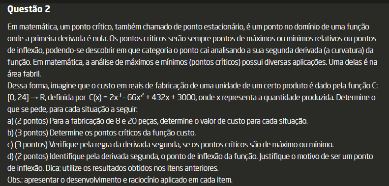 <p>Questão 2 Em matemática, um ponto crítico, também chamado de ponto estacionário, é um ponto no domínio de uma função onde a primeira derivada é nula. Os pontos críticos serão sempre pontos de máximos ou mínimos relativos ou pontos de inflexão, podendo-se descobrir em que categoria ponto cai analisando a sua segunda derivada (a curvatura) da função. Em matemática, a análise de máximos e mínimos (pontos críticos) possui diversas aplicações. Uma delas é na área fabril. Dessa forma, imagine que custo em reais de fabricação de uma unidade de um certo produto é dado pela função C: [0,24] R, definida por C(x) = 66x2 + 432x + 3000, onde X representa a quantidade produzida. Determine que se pede, para cada situação a a) (2 pontos) Para a fabricação de 8 e 20 peças, determine valor de custo para cada situação. b) (3 pontos) Determine os pontos críticos da função custo. c) (3 pontos) Verifique pela regra da derivada segunda, se os pontos críticos são de máximo mínimo. d) (2 pontos) Identifique pela derivada segunda, ponto de inflexão da função. motivo de ser um ponto de inflexão. Dica: utilize os resultados obtidos nos itens anteriores. Obs.: apresentar desenvolvimento e raciocínio aplicado em cada item.</p>