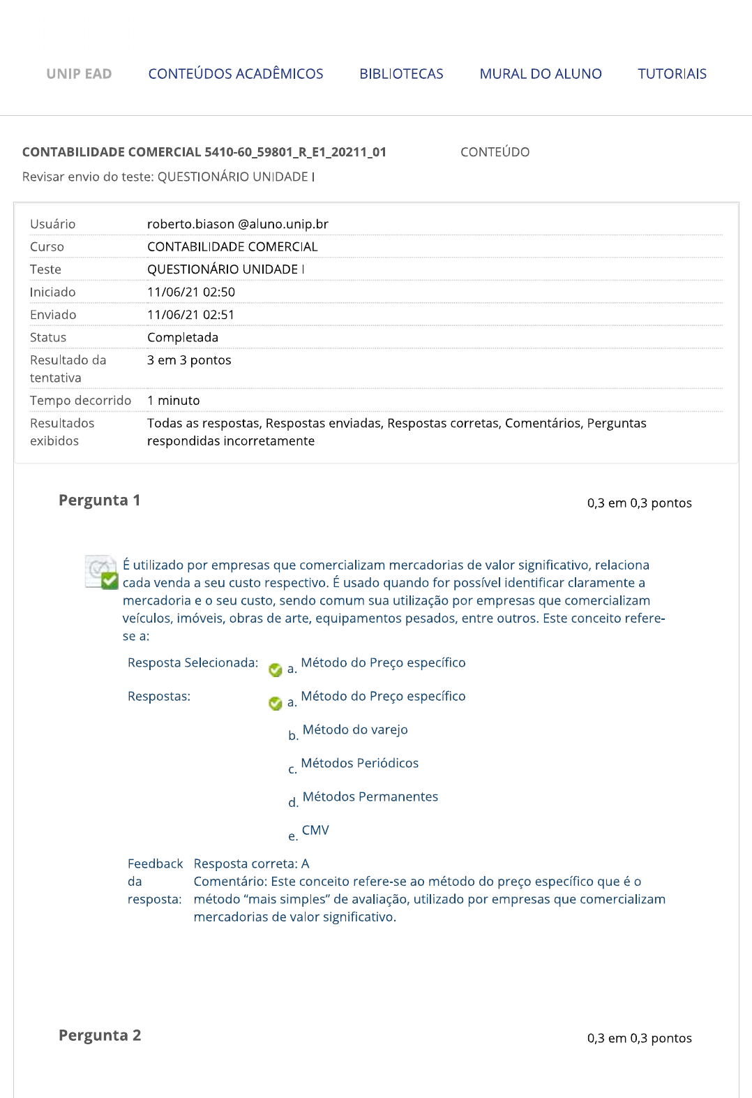<p>UNIP EAD CONTEÚDOS ACADÊMICOS BIBLIOTECAS MURAL DO ALUNO TUTORIAIS CONTABILIDADE COMERCIAL 5410-60_59801_R_E1_20211_01 CONTEÚDO Revisar envio do teste: QUESTIONÁRIO UNIDADE I Usuário @aluno.unip.br Curso CONTABILIDADE COMERCIAL Teste QUESTIONÁRIO UNIDADE Iniciado 11/06/21 02:50 Enviado 11/06/21 02:51 Status Completada Resultado da 3 em 3 pontos tentativa Tempo decorrido 1 minuto Resultados Todas as respostas, Respostas enviadas, Respostas corretas, Comentários, Perguntas exibidos respondidas incorretamente Pergunta 1 0,3 em 0,3 pontos É utilizado por empresas que comercializam mercadorias de valor significativo, relaciona cada venda a seu custo respectivo. É usado quando for possível identificar claramente a mercadoria e o seu custo, sendo comum sua utilização por empresas que comercializam veículos, imóveis, obras de arte, equipamentos pesados, entre outros. Este conceito refere- se a: Resposta Selecionada: Método do Preço específico a. Respostas: Método do Preço específico a. b. Método do varejo Métodos Periódicos C. Métodos Permanentes d. CMV e. Feedback Resposta correta: A da Comentário: Este conceito refere-se ao método do preço específico que é o resposta: método "mais simples" de avaliação, utilizado por empresas que comercializam mercadorias de valor significativo. Pergunta 2 0,3 em 0,3 pontos</p><p>Por esse método de registro da conta Mercadoria, quando a empresa utiliza o inventário periódico, usa-se uma única conta Mercadorias para registrar o estoque inicial debitando a conta Mercadorias; as compras também são lançadas a débito da conta Mercadorias, enquanto as vendas são nela creditadas, este método é considerado uma exceção em toda a contabilidade. Selecione a alternativa correta. Resposta Selecionada: Método Conta mista e. Respostas: Métodos Permanentes a. b. Método do varejo C. Método do Preço específico d. Métodos Periódicos Método Conta mista e. Feedback Resposta correta: E da Comentário: Pode-se entender que controle da conta de mercadorias com o resposta: método conta mista constitui uma exceção em toda a Contabilidade" uma vez que, conforme será demonstrado a seguir, a conta de Mercadorias ora é classificada como conta patrimonial, ora como de resultado. Pergunta 3 0,3 em 0,3 pontos Utilizando um exemplo de movimentação de mercadorias em que há uma venda líquida de $ CMV de $ 500,00; despesas operacionais de $ 100,00; outras receitas operacionais de $ 100,00 responda: qual o resultado a que chegaremos e qual a nomenclatura dada a esse resultado? Resposta Selecionada: b. RLP (Resultado Líquido do Período) de $ 500,00. Respostas: LB (Lucro Bruto) de $ 500,00. a. b. RLP (Resultado Líquido do Período) de $ 500,00. RCM (Resultado com Mercadoria) de $ 400,00. C. d. ROL (Receita Operacional Líquida) de $ 500,00. LB (Lucro Bruto) de $ 600,00. e. Feedback da Resposta correta: B resposta: Comentário: resultado líquido do período é equivalente ao lucro líquido, ou seja: Vendas líquidas $ 1.000,00 (-) CMV $ 500,00 (=) Lucro bruto $ 500,00 (-) Despesas operacionais $ 100,00 (+) Outras receitas operacionais $ 100,00 (=) Resultado líquido do período... $ 500,00</p><p>Pergunta 4 0,3 em 0,3 pontos Uma empresa comercial vende suas mercadorias pelo preço de custo, ou seja, por $ 100.000,00. Assinale a alternativa correta: Resposta e. Selecionada: Essa operação é equivalente ao CMV (Custo da Mercadoria Vendida) e o valor de registro, nessa conta, é equivalente ao valor de baixa dos estoques. Respostas: a. Essa operação não altera o RCM (Resultado com Mercadorias). b. Essa operação deverá ser revertida e somada ao RLP (Resultado Líquido do Período). C. Essa operação representa os custos agregados à expectativa de lucro da empresa. d. preço de venda deverá sempre ser superior ao do custo. e. Essa operação é equivalente ao CMV (Custo da Mercadoria Vendida) e o valor de registro, nessa conta, é equivalente ao valor de baixa dos estoques. Feedback Resposta correta: E da Comentário: Independentemente do método que a empresa utilizará para a resposta: apuração dos estoques e dos custos da mercadoria vendida, o valor do CMV é exatamente igual à baixa dessa mercadoria dos estoques, tanto em quantidade como em valores monetários. Pergunta 5 0,3 em 0,3 pontos A apuração do RCM (Resultado com Mercadorias) é feita pela seguinte fórmula: Resposta Selecionada: d. Respostas: RCM = V + CMV a. b. RCM = CMV - V d. e. Feedback Resposta correta: D da Comentário: resultado com mercadorias, ou lucro bruto, é obtido resposta: aritmeticamente pelas empresas comerciais, subtraindo-se da receita total das vendas de mercadorias o custo pelo qual essas mercadorias foram adquiridas, ou seja: RCM = V - CMV.</p><p>Pergunta 6 0,3 em 0,3 pontos Qual a finalidade de se apurar o RCM (Resultado com Mercadorias)? Resposta C. Selecionada: Demonstrar o resultado obtido com a compra e a venda de mercadorias. Respostas: a. Identificar o valor correto do estoque final de mercadorias. b. Estabelecer a alíquota do imposto do período. C. Demonstrar o resultado obtido com a compra e a venda de mercadorias. d. Implantar uma política de venda. Apresentar sempre um resultado positivo do período. e. Feedback Resposta correta: C da Comentário: O resultado com mercadorias é importante para as empresas resposta: comerciais, por representar o resultado principal obtido pela sua atividade, em outras palavras, a partir do RCM ou LB que a empresa saberá se está ganhando ou perdendo com o investimento chamado estoques, se as receitas de vendas não cobrirem o custo de aquisição dessas mercadorias, a empresa não terá condições de manter sua estrutura (despesas necessárias para o desenvolvimento de sua atividade) e assim, fatalmente, entrará em um processo de falência. Pergunta 7 0,3 em 0,3 pontos A "Comercial de Tecidos para Estofamento Pink Ltda." apurou no mês um RCM (Resultado com Mercadorias) no valor de R$ 38