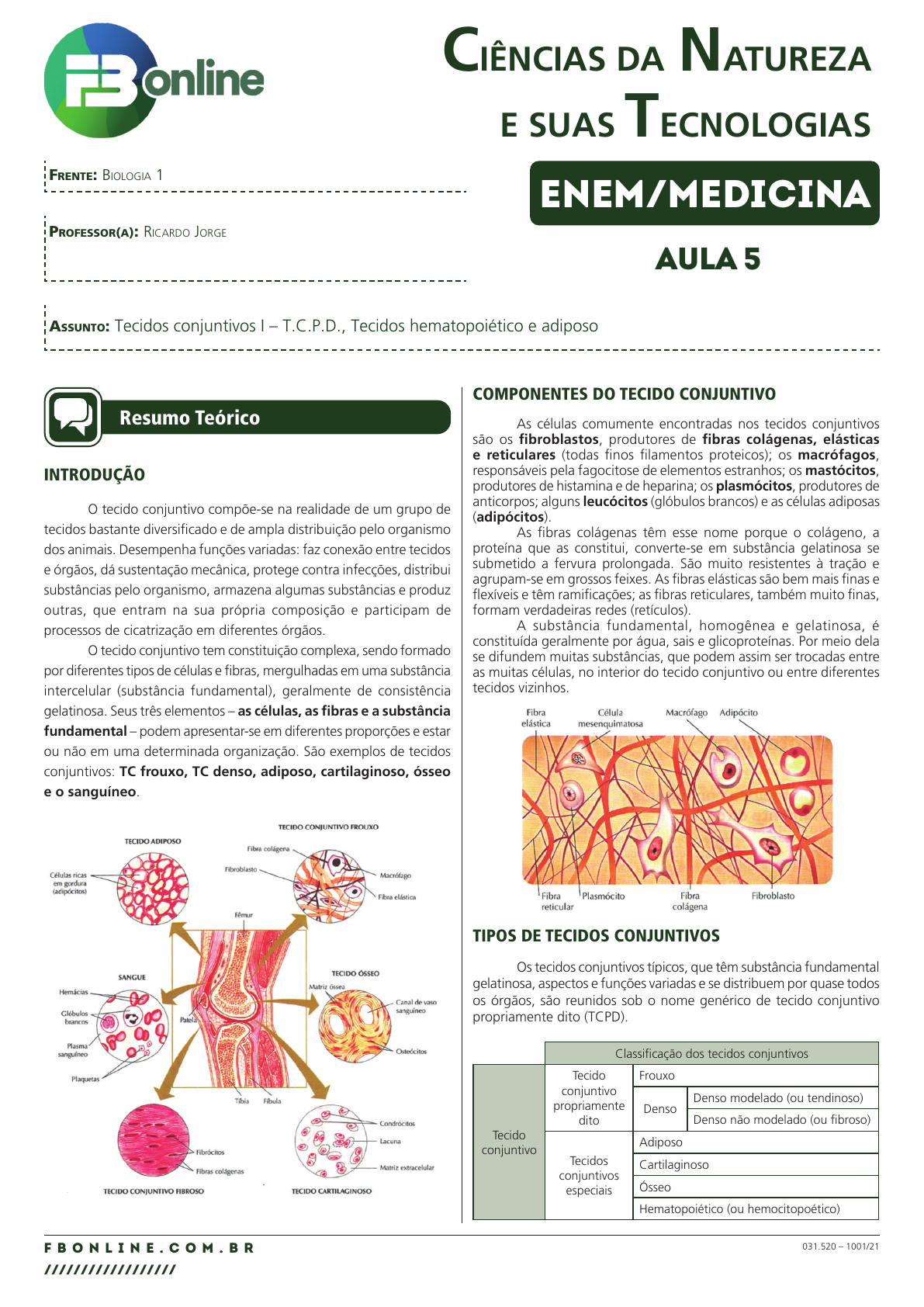 <p>CIÊNCIAS DA NATUREZA</p><p>E SUAS TECNOLOGIAS</p><p>F B O N L I N E . C O M . B R</p><p>//////////////////</p><p>Professor(a): RicaRdo JoRge</p><p>assunto: Tecidos conjuntivos I – T.C.P.D., Tecidos hematopoiético e adiposo</p><p>frente: Biologia 1</p><p>031.520 – 1001/21</p><p>AULA 5</p><p>ENEM/MEDICINA</p><p>Resumo Teórico</p><p>INTRODUÇÃO</p><p>O tecido conjuntivo compõe-se na realidade de um grupo de</p><p>tecidos bastante diversificado e de ampla distribuição pelo organismo</p><p>dos animais. Desempenha funções variadas: faz conexão entre tecidos</p><p>e órgãos, dá sustentação mecânica, protege contra infecções, distribui</p><p>substâncias pelo organismo, armazena algumas substâncias e produz</p><p>outras, que entram na sua própria composição e participam de</p><p>processos de cicatrização em diferentes órgãos.</p><p>O tecido conjuntivo tem constituição complexa, sendo formado</p><p>por diferentes tipos de células e fibras, mergulhadas em uma substância</p><p>intercelular (substância fundamental), geralmente de consistência</p><p>gelatinosa. Seus três elementos – as células, as fibras e a substância</p><p>fundamental – podem apresentar-se em diferentes proporções e estar</p><p>ou não em uma determinada organização. São exemplos de tecidos</p><p>conjuntivos: TC frouxo, TC denso, adiposo, cartilaginoso, ósseo</p><p>e o sanguíneo.</p><p>COMPONENTES DO TECIDO CONJUNTIVO</p><p>As células comumente encontradas nos tecidos conjuntivos</p><p>são os fibroblastos, produtores de fibras colágenas, elásticas</p><p>e reticulares (todas finos filamentos proteicos); os macrófagos,</p><p>responsáveis pela fagocitose de elementos estranhos; os mastócitos,</p><p>produtores de histamina e de heparina; os plasmócitos, produtores de</p><p>anticorpos; alguns leucócitos (glóbulos brancos) e as células adiposas</p><p>(adipócitos).</p><p>As fibras colágenas têm esse nome porque o colágeno, a</p><p>proteína que as constitui, converte-se em substância gelatinosa se</p><p>submetido a fervura prolongada. São muito resistentes à tração e</p><p>agrupam-se em grossos feixes. As fibras elásticas são bem mais finas e</p><p>flexíveis e têm ramificações; as fibras reticulares, também muito finas,</p><p>formam verdadeiras redes (retículos).</p><p>A substância fundamental, homogênea e gelatinosa, é</p><p>constituída geralmente por água, sais e glicoproteínas. Por meio dela</p><p>se difundem muitas substâncias, que podem assim ser trocadas entre</p><p>as muitas células, no interior do tecido conjuntivo ou entre diferentes</p><p>tecidos vizinhos.</p><p>TIPOS DE TECIDOS CONJUNTIVOS</p><p>Os tecidos conjuntivos típicos, que têm substância fundamental</p><p>gelatinosa, aspectos e funções variadas e se distribuem por quase todos</p><p>os órgãos, são reunidos sob o nome genérico de tecido conjuntivo</p><p>propriamente dito (TCPD).</p><p>Classificação dos tecidos conjuntivos</p><p>Tecido</p><p>conjuntivo</p><p>Tecido</p><p>conjuntivo</p><p>propriamente</p><p>dito</p><p>Frouxo</p><p>Denso</p><p>Denso modelado (ou tendinoso)</p><p>Denso não modelado (ou fibroso)</p><p>Tecidos</p><p>conjuntivos</p><p>especiais</p><p>Adiposo</p><p>Cartilaginoso</p><p>Ósseo</p><p>Hematopoiético (ou hemocitopoético)</p><p>2F B O N L I N E . C O M . B R</p><p>//////////////////</p><p>Módulo de estudo</p><p>031.520 – 1001/21</p><p>Dependendo da proporção entre seus três elementos, da</p><p>organização das fibras e da função, o TCPD pode ser assim</p><p>classificado:</p><p>1. Tecido conjuntivo frouxo é um tecido moldável, macio, que</p><p>normalmente preenche espaços entre feixes musculares, em</p><p>meio a vários órgãos viscerais e ainda na derme.</p><p>2. Tecido conjuntivo denso não modelado (fibroso) é muito</p><p>resistente a trações e, em geral, forma grossas cápsulas que</p><p>envolvem e protegem vários órgãos, como rins, testículos, baço</p><p>e fígado. Ocorre ainda na derme, e são seus grossos feixes de</p><p>fibras colágenas, dispostos sem orientação, que nos fornecem</p><p>o couro quando a pele dos animais é curtida.</p><p>3. Tecido conjuntivo denso modelado (tendinoso) tem ampla</p><p>predominância de feixes de fibras colágenas, organizadas em</p><p>uma única direção, ficando bem visíveis entre elas os grandes</p><p>núcleos dos fibrócitos (fibroblastos). Constituem os tendões</p><p>os feixes que ligam as extremidades dos músculos aos ossos</p><p>e os ligamentos, cordões que “amarram” os ossos unindo-os</p><p>firmemente na região das articulações.</p><p>4. Tecido conjuntivo hemocitopoético dá origem às células</p><p>sanguíneas. Contém duas linhagens de células, a linfoide,</p><p>que origina os linfócitos, e a mieloide, que origina os demais</p><p>leucócitos e também as hemácias (glóbulos vermelhos).</p><p>5. Tecido conjuntivo adiposo tem em predominância grandes</p><p>células (adipócitos) arredondadas, que armazenam uma gota de</p><p>lipídios na região central, situando-se o núcleo e uma pequena</p><p>camada de citoplasma junto à membrana celular.</p><p>6. Tecido conjuntivo ósseo é formado por células denominadas</p><p>osteoblastos e osteoclastos, responsáveis pelo processo de</p><p>mineralização e desmineralização óssea.</p><p>7. Tecido conjuntivo cartilaginoso que, embora faça parte do</p><p>conjuntivo, tem ausência de vascularização.</p><p>Exercícios</p><p>01. (CPS) A pele é o maior órgão do corpo humano, revestindo</p><p>toda a superfície corporal. Funciona como uma barreira</p><p>protetora contra as radiações solares, particularmente os raios</p><p>ultravioleta, lembrando que a exposição excessiva ao sol aumenta</p><p>drasticamente o risco de câncer de pele.</p><p>A pele atua também na proteção contra agentes mecânicos</p><p>(atrito e pressões), químicos (substâncias prejudiciais) e biológicos</p><p>(microrganismos patogênicos). Além 