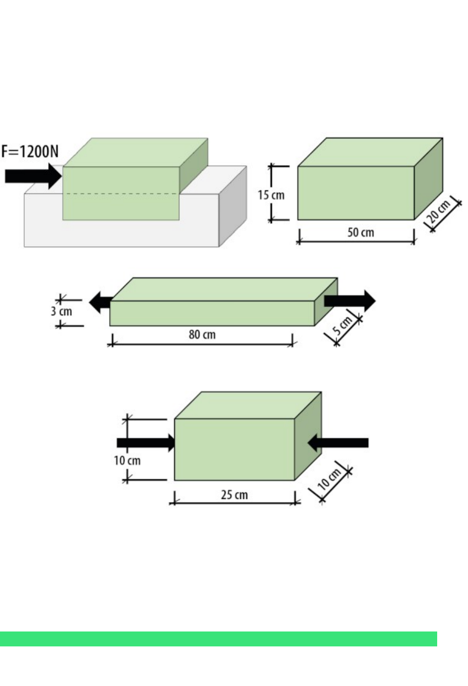 <p>AS 3</p><p>Suponha um plástico fictício que está sendo estudado em laboratório para futuramente ser utilizado como material de construção civil. São realizados testes de vários tipos para avaliar o desempenho do material. Os valores de resistência são diferentes para cada tipo de esforço, conforme apontado a seguir. Analise, de acordo com as figuras, os ensaios de laboratório e aponte a alternativa que descreve corretamente o que acontecerá ao material nas condições apontadas.</p><p>Cisalhamento máximo suportado: 8000 Pa</p><p>Tração máxima suportada: 150000 Pa</p><p>Compressão máxima suportada: 60000 Pa</p><p>RESPOSTA:</p><p>Pergunta 2</p><p>0,25/0,25</p><p>Assinale a alternativa que contém uma afirmativa INCORRETA em relação à aplicação prática do estudo dos esforços internos solicitantes.</p><p>Mostrar opções de resposta</p><p>Em pilares, quanto maior a carga aplicada, maior precisa ser a área de contato para que se mantenha o valor de tensão de compressão, considerando-se que não seja alterado o material.</p><p>O desenvolvimento de materiais cada vez mais resistentes tem nos permitido construir elementos estruturais cada vez mais esbeltos.</p><p>A forma mais eficiente de se reduzir uma carga aplicada em um material é reduzir a sua área de contato.</p><p>Reduzir a área de um cabo de aço tracionado aumenta a tensão de tração, mesmo que a carga não seja alterada.</p><p>Um dos motivos pelo qual estruturas antigas têm em geral pilares maiores é devido ao fato que os materiais mais antigos eram menos resistentes.</p><p>Pergunta 3</p><p>0,25/0,25</p><p>No seu projeto você precisa garantir, além da estética, a funcionalidade dos pilares. Considere uma construção fictícia, onde você deverá escolher entre três modelos de pilar, cada modelo tem uma seção transversal com formato e medidas diferentes e receberá um peso diferente também. Aponte qual (ou quais) pilares terá(ão) a menor tensão de compressão, que serão, portanto, as melhores escolhas.</p><p>O matéria</p><p>l resiste aos três ensaios diferentes.</p><p>Pilar 2, apenas.</p><p>Pilares 1 e 3, apenas.</p><p>Pilares 1 e 2, apenas.</p><p>Pilar 1, apenas.</p><p>Pilares 2 e 3, apenas.</p><p>Considerando o estudo dos esforços internos solicitantes em um material (tração, compressão e cisalhamento), assinale a alternativa CORRETA dentre as opções abaixo:</p><p>Mostrar opções de resposta</p><p>O esforço de tração está relacionado ao efeito de fatiamento de um material em duas ou mais faces.</p><p>A intensidade da força aplicada em um material não influencia no cálculo de tensão, uma vez que este cálculo depende apenas da área de aplicação da força e do tipo de esforço, se compressão, tração ou cisalhamento.</p><p>A compressão é o esforço que pode ser descrito com a tendência de aproximação de duas faces de um material, dada a aplicação de uma força.</p><p>A principal diferença entre os esforços de tração e cisalhamento está relacionada ao material que está sofrendo o esforço.</p><p>Dada a forma de cálculo de tensão dos materiais, quanto maior a área de aplicação de uma força, por consequência, maior será a tensão resultante.</p><p>Pergunta 1</p><p>0,25/0,25</p><p>Durante um breve momento em uma competição de salto com vara, o peso do atleta é totalmente suportado pela vara que, nas primeiras competições realizadas, era feita de bambu. Calcule qual a tensão e o tipo de esforço ao qual uma barra de salto está sendo submetida em um momento semelhante ao da imagem a seguir. Considere um atleta de 65kg e a vara com uma seção circular não vaada, com diâmetro de 5cm.</p><p>Tração de 331042,3 N/m²</p><p>Cisalhamento de 650 N</p><p>Compressão de 331042,3 N/m²</p><p>Tração de 22478,12 N/m2</p><p>Compressão de 650 N/m²</p><p>Pergunta 2</p><p>0,25/0,25</p><p>No seu projeto você precisa garantir, além da estética, a funcionalidade dos pilares. Considere uma construção fictícia, onde você deverá escolher entre três modelos de pilar, cada modelo tem uma seção transversal com formato e medidas diferentes e receberá um peso diferente também. Aponte qual (ou quais) pilares terá(ão) a menor tensão de compressão, que serão, portanto, as melhores escolhas.</p><p>Pilares 2 e 3, apenas.</p><p>Pilar 2, apenas.</p><p>Pilares 1 e 3, apenas.</p><p>Pilar 1, apenas.</p><p>Pilares 1 e 2, apenas.</p><p>Pergunta 3</p><p>0,25/0,25</p><p>Lustres são alguns dos elementos numa edificação que combinam a funcionalidade da iluminação com a função decorativa que trazem ao ambiente. Os modelos variam dos mais simples, pequenos e com poucos detalhes, aos mais rebuscados, que são grandes obras artísticas e chegam a pesar vários quilos. Considerando um lustre de 300 kg pendurado no teto por apenas uma barra quadrada de aço, lado de 2cm, calcule o tipo e o valor do esforço ao qual ele está sendo submetido.</p><p>Tração de 7 500 000 Pa</p><p>Compressão de 7 500 000 Pa</p><p>Tração de 750 Pa</p><p>Cislhamento de 750 Pa</p><p>Compressão de 75 N</p><p>Pergunta 4</p><p>0,25/0,25</p><p>Observe a situação em questão. Uma tábua de madeira (amarela) está presa a uma base de concreto (verde) através de um pino de aço (azul) que atravessa as duas peças. É aplicada uma força na tábua com o sentido e direção conforme indicado na figura. Considerando o que foi apresentado sobre esforços internos, assinale a alternativa incorreta:</p><p>O pino de aço sofre uma tensão de cisalhamento na região onde há o contato entre a madeira e a base.</p><p>Se o sentido da força fosse invertido (indo da direita para a esquerda), o pino sofreria o mesmo tipo de esforço que o da situação atual.</p><p>A tábua de madeira sofre um esforço de tração enquanto houver a aplicação da força apresentada.</p><p>Alterar o comprimento da tábua não afeta a tensão aplicada na madeira.</p><p>O fato de o pino estar atravessando tanto a