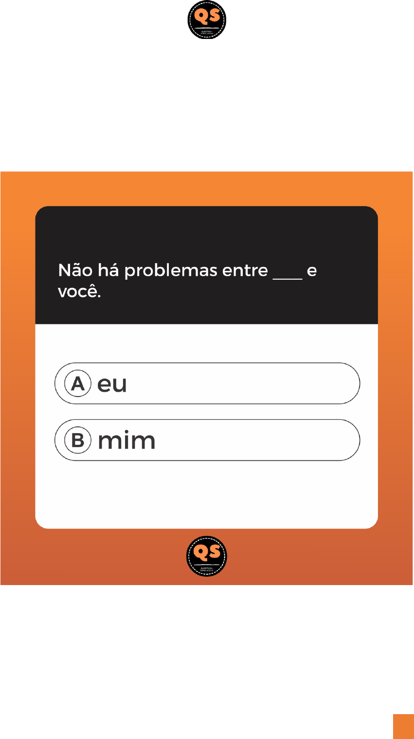 <p>Siga nosso Instagram @questaoesimulado 1</p><p>Caderno de Questões</p><p>Português</p><p>Desafio do dia</p><p>Gabarito B</p><p>Quando houver uma preposição essencial, usaremos o pronome oblíquo (mim).</p><p>A menos que ele seja o sujeito do verbo.</p><p>Siga nosso Instagram @questaoesimulado 2</p><p>1) ___ - se apartamentos.</p><p>a) Aluga</p><p>b) Alugam</p><p>Comentário</p><p>A presença da partícula apassivadora "SE" faz a frase ser passiva, ou seja, o sujeito é quem sofre a ação</p><p>do verbo(= apartamentos), e não quem pratica a ação de alugar. É o mesmo que eu dissesse que</p><p>"apartamentos são alugados".</p><p>Gabarito. B</p><p>2) O papa fez um gesto para ___ os fiéis.</p><p>a) comprimentar</p><p>b) cumprimentar</p><p>Comentário</p><p>Usa-se comprimento no sentido de extensão, tamanho, dimensão. Usa-se cumprimento no</p><p>sentido de saudar alguém, também quando deriva do verbo “cumprir” (executar).</p><p>Gabarito. B</p><p>03 Bruno____ em Salvador.</p><p>Comentário</p><p>O verbo "assistir" quando estiver acompanhado da preposição "em" significa "morar". Portanto,</p><p>as duas opções estão corretas</p><p>Gabarito. C</p><p>04) Pintou-se as paredes de verde.</p><p>Siga nosso Instagram @questaoesimulado 3</p><p>( ) certo ( ) Errado</p><p>Comentário</p><p>O verbo deve concordar com o sujeito quando a partícula "se" é apassivadora.</p><p>Correção: Pintaram-se as paredes de verde.</p><p>Gabarito. Errado</p><p>05) Muitos de nós lutam pela alfabetização dos povos.</p><p>( ) Certo ( ) Errado</p><p>Comentário</p><p>O correto é</p><p>Muitos de nós lutamos pela alfabetização dos povos.</p><p>Gabarito. Errado</p>