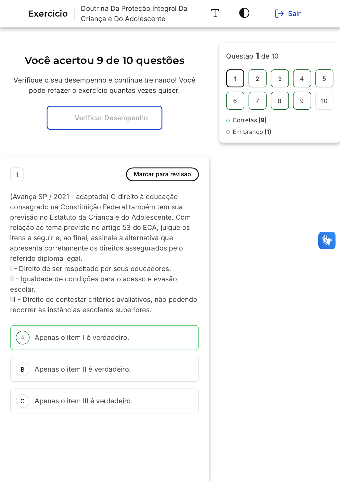 <p>Você acertou 9 de 10 questões</p><p>Verifique o seu desempenho e continue treinando! Você</p><p>pode refazer o exercício quantas vezes quiser.</p><p>Verificar Desempenho</p><p>A</p><p>B</p><p>C</p><p>1 Marcar para revisão</p><p>�Avança SP / 2021 - adaptada) O direito à educação</p><p>consagrado na Constituição Federal também tem sua</p><p>previsão no Estatuto da Criança e do Adolescente. Com</p><p>relação ao tema previsto no artigo 53 do ECA, julgue os</p><p>itens a seguir e, ao final, assinale a alternativa que</p><p>apresenta corretamente os direitos assegurados pelo</p><p>referido diploma legal.</p><p>I � Direito de ser respeitado por seus educadores.</p><p>II � Igualdade de condições para o acesso e evasão</p><p>escolar.</p><p>III � Direito de contestar critérios avaliativos, não podendo</p><p>recorrer às instâncias escolares superiores.</p><p>Apenas o item I é verdadeiro.</p><p>Apenas o item II é verdadeiro.</p><p>Apenas o item III é verdadeiro.</p><p>Questão 1 de 10</p><p>Corretas �9�</p><p>Em branco �1�</p><p>1 2 3 4 5</p><p>6 7 8 9 10</p><p>Exercicio</p><p>Doutrina Da Proteção Integral Da</p><p>Criança e Do Adolescente</p><p>Sair</p><p>D</p><p>E</p><p>Apenas os itens II e III são verdadeiros.</p><p>Apenas os itens II e III são verdadeiros.</p><p>Resposta correta</p><p>Parabéns, você selecionou a alternativa</p><p>correta. Confira o gabarito comentado!</p><p>Gabarito Comentado</p><p>O artigo 53 do Estatuto da Criança e do Adolescente</p><p>�ECA) estabelece que a criança e o adolescente têm</p><p>direito à educação, visando ao pleno</p><p>desenvolvimento de sua pessoa, preparo para o</p><p>exercício da cidadania e qualificação para o trabalho.</p><p>Nesse sentido, assegura-se a eles: I - igualdade de</p><p>condições para o acesso e permanência na escola; II</p><p>- direito de ser respeitado por seus educadores; III -</p><p>direito de contestar critérios avaliativos, podendo</p><p>recorrer às instâncias escolares superiores; IV -</p><p>direito de organização e participação em entidades</p><p>estudantis; V - acesso à escola pública e gratuita</p><p>próxima de sua residência. Portanto, a alternativa</p><p>correta é a "A", pois apenas o item I está correto. O</p><p>item II está incorreto, pois o ECA assegura a</p><p>igualdade de condições para o acesso e</p><p>permanência na escola, e não para a evasão escolar.</p><p>O item III também está incorreto, pois o ECA garante</p><p>o direito de contestar critérios avaliativos, podendo</p><p>sim recorrer às instâncias escolares superiores.</p><p>2 Marcar para revisão</p><p>�Avança SP / 2021 - adaptada) O direito à liberdade</p><p>consagrado na Constituição Federal também tem sua</p><p>previsão no Estatuto da Criança e do Adolescente. No</p><p>que se refere ao tema previsto no Estatuto da Criança e</p><p>do Adolescente, analise os itens a seguir e, ao final,</p><p>A</p><p>B</p><p>C</p><p>D</p><p>E</p><p>assinale a alternativa que apresenta corretamente os</p><p>aspectos abrangidos pelo direito à liberdade.</p><p>I � Crença e culto religioso.</p><p>II � Opinião e expressão.</p><p>III � Participar da vida política, sem nenhuma restrição.</p><p>Apenas o item I é verdadeiro.</p><p>Apenas o item II é verdadeiro.</p><p>Apenas o item III é verdadeiro.</p><p>Apenas os itens I e II são verdadeiros.</p><p>Apenas o item II e III são verdadeiros.</p><p>Resposta correta</p><p>Parabéns, você selecionou a alternativa</p><p>correta. Confira o gabarito comentado!</p><p>Gabarito Comentado</p><p>O direito à liberdade, conforme estabelecido no</p><p>Estatuto da Criança e do Adolescente �ECA�, abrange</p><p>diversos aspectos. Entre eles, estão a liberdade de</p><p>crença e culto religioso (item I) e a liberdade de</p><p>opinião e expressão (item II�. No entanto, a</p><p>participação na vida política (item III) não é um direito</p><p>absoluto e irrestrito para crianças e adolescentes,</p><p>estando sujeita a determinadas restrições legais.</p><p>Portanto, apenas os itens I e II estão corretos, o que</p><p>faz da alternativa D a resposta correta para esta</p><p>questão. O artigo 16 do ECA detalha esses e outros</p><p>aspectos do direito à liberdade, incluindo o direito de</p><p>ir, vir e estar em locais públicos e espaços</p><p>comunitários, o direito de brincar, praticar esportes e</p><p>se divertir, o direito de participar da vida familiar e</p><p>comunitária sem discriminação, o direito de</p><p>A</p><p>B</p><p>C</p><p>D</p><p>E</p><p>participar da vida política conforme a lei e o direito</p><p>de buscar refúgio, auxílio e orientação.</p><p>3 Marcar para revisão</p><p>�IADES / 2019� A Lei n° 8.069/1990, também chamada</p><p>Estatuto da Criança e do Adolescente, dispõe de</p><p>mecanismos de proteção integral à criança e ao</p><p>adolescente. Considera-se criança, para efeito de</p><p>proteção da lei, a pessoa até:</p><p>Doze anos de idade incompletos.</p><p>Dez anos de idade incompletos.</p><p>Onze anos de idade incompletos.</p><p>Nove anos de idade incompletos.</p><p>Treze anos de idade incompletos.</p><p>Resposta correta</p><p>Parabéns, você selecionou a alternativa</p><p>correta. Confira o gabarito comentado!</p><p>Gabarito Comentado</p><p>Gabarito: Doze anos de idade incompletos.</p><p>Justificativa: A questão se refere ao conteúdo do</p><p>artigo 2º do Estatuto da Criança e do Adolescente</p><p>�ECA�. De acordo com essa lei, é considerada</p><p>criança a pessoa que tem até doze anos de idade</p><p>incompletos. A partir dos doze anos e até os dezoito,</p><p>a pessoa é considerada adolescente. Portanto, a</p><p>alternativa correta é a que afirma que, para efeitos</p><p>A</p><p>B</p><p>C</p><p>D</p><p>E</p><p>de proteção da lei, uma criança é uma pessoa com</p><p>até doze anos de idade incompletos.</p><p>4 Marcar para revisão</p><p>Dentre os direitos previstos e protegid