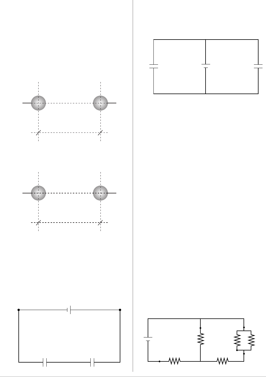<p>88</p><p>e) Se a distância entre as placas for reduzida à metade, a capa-</p><p>citância do capacitor irá duplicar.</p><p>f) Este capacitor pode ser usado como um elemento para arma-</p><p>zenar energia.</p><p>620. (FGV-SP) Tomemos três esferas metálicas idênticas, A, B e C, a</p><p>primeira delas carregada com carga elétrica q e as outras duas</p><p>neutras. Separada e sucessivamente A é colocada em contato</p><p>com B, depois com C. Posteriormente, A e B e A e C são posi-</p><p>cionadas conforme as figuras 1 e 2:</p><p>Observação: O raio das esferas é desprezível em relação às</p><p>distâncias d e 2d.</p><p>A relação F1 é igual a:—</p><p>F2</p><p>a) 2. b) 4. c) 1 . d) 1. e) 1 .— —2 4</p><p>621. (UEPB) Dois capacitores de capacidades C1 = 12 µF e C2 = 6 µF</p><p>estão associados em série. Aplicamos aos extremos da associa-</p><p>ção de capacitores uma diferença de potencial de 12 V, confor-</p><p>me mostra a figura abaixo:</p><p>A ddp nos terminais do capacitor de 12 µF em volts vale:</p><p>a) 2. b) 4. c) 6. d) 8. e) 10.</p><p>622. (UEM-PR) Dois capacitores, de capacitâncias C1 e C2, são carre-</p><p>gados quando ligados a uma fonte de diferença de potencial V,</p><p>conforme a figura:</p><p>Nessas condições, assinale o que for correto:</p><p>a) Os capacitores ficam submetidos às diferenças de potenciais</p><p>V1 e V2, sendo V = V1 + V2.</p><p>b) Os capacitores adquirem cargas q1 e q2, proporcionais às suas</p><p>capacitâncias, sendo q = q1 + q2 a carga total do sistema.</p><p>c) Introduzindo-se um dielétrico, de constante dielétrica K, entre</p><p>as placas do capacitor C2, q2 aumenta e q1 diminui, pois a car-</p><p>ga total do sistema permanece constante.</p><p>d) Introduzindo-se um metal entre as placas do capacitor C1, de</p><p>tal forma que o espaço entre elas fique totalmente preenchi-</p><p>do, q1 = 0 e q2 não se altera.</p><p>e) Retirando-se o capacitor C2 (carregado) e ligando-o a outro</p><p>capacitor, C3 (descarregado), na ausência de qualquer diferen-</p><p>ça de potencial externa, a carga e a diferença de potencial do</p><p>capacitor C2 diminuem.</p><p>623. (UFRRJ) As afirmações abaixo referem-se à corrente elétrica.</p><p>I) Corrente elétrica é o movimento ordenado de elétrons em um</p><p>condutor.</p><p>II) Corrente elétrica é o movimento de íons em uma solução ele-</p><p>trolítica.</p><p>III) Corrente elétrica, em um resistor ôhmico, é inversamente</p><p>proporcional à ddp aplicada e diretamente proporcional à</p><p>resistência elétrica do resistor.</p><p>Sobre as afirmativas acima, pode-se concluir que apenas:</p><p>a) a I está correta.</p><p>b) a II está correta.</p><p>c) a III está correta.</p><p>d) a I e a II estão corretas.</p><p>e) a I e a III estão corretas.</p><p>As questões de números 624 e 625 referem-se ao circuito elétrico</p><p>representado na figura abaixo, no qual todos os resistores têm a</p><p>mesma resistência elétrica R.</p><p>�</p><p>�A</p><p>F1</p><p>F1</p><p>B</p><p>2d</p><p>figura 1</p><p>�</p><p>�A</p><p>F2</p><p>F2</p><p>C</p><p>d</p><p>figura 2</p><p>A – + B</p><p>C1 C2</p><p>q1 q2</p><p>ε</p><p>A</p><p>B C</p><p>D</p><p>E</p><p>R4 R5</p><p>R1 R2</p><p>R3ε</p><p>–</p><p>+</p><p>–</p><p>+</p><p>–</p><p>+</p><p>C1 C2</p><p>V</p><p>89</p><p>624. (UFRGS-RS) Em qual dos pontos assinalados na figura a corrente</p><p>elétrica é mais intensa?</p><p>a) A b) B c) C d) D e) E</p><p>625. (UFRGS-RS) Qual dos resistores está submetido à maior difer-</p><p>ença de potencial?</p><p>a) R1 b) R2 c) R3 d) R4 e) R5</p><p>626. (UFRN) A figura abaixo representa parte do circuito elétrico ideal</p><p>de uma residência, com alguns dos componentes eletrodomésti-</p><p>cos identificados. Na corrente alternada das residências (cha-</p><p>mada de monofásica), os dois fios recebem os nomes de “fase”</p><p>(F) e “neutro” (N) ou “terra” (e não “positivo” e “negativo”, como</p><p>em corrente contínua). O fio fase tem um potencial elétrico de</p><p>aproximadamente 220 V em relação ao neutro ou em relação a</p><p>nós mesmos (também somos condutores de eletricidade), se</p><p>estivermos descalços e em contato com o chão.</p><p>Das quatro afirmativas abaixo, apenas uma está errada. Assinale-a.</p><p>a) Quando todos os equipamentos estão funcionando, a resistên-</p><p>cia elétrica equivalente da residência aumenta, aumentando,</p><p>também, a corrente, e, por conseguinte, o consumo de energia.</p><p>b) Todos os equipamentos de dentro da residência estão em</p><p>paralelo entre si, pois cada um deles pode funcionar, indepen-</p><p>dentemente de os outros estarem funcionando ou não.</p><p>c) O disjuntor J deve ser colocado no fio fase (F) e não no neutro</p><p>(N), pois, quando o desligarmos, para, por exemplo, fazermos</p><p>um determinado serviço elétrico, a casa ficará completamente</p><p>sem energia, eliminando-se qualquer possibilidade de risco de</p><p>um choque elétrico.</p><p>d) O fusível ou disjuntor J está ligado em série com o conjunto</p><p>dos equipamentos existentes na casa, pois, se o desligarmos,</p><p>todos os outros componentes eletroeletrônicos ficarão sem</p><p>poder funcionar.</p><p>627. (ITA-SP) Certos resistores quando expostos à luz variam sua</p><p>resistência. Tais resistores são chamados LDR (do inglês: Light</p><p>Dependent Resistor). Considere um típico resistor LDR feito de</p><p>sulfeto de cádmio, o qual adquire uma resistência de aproxima-</p><p>damente 100 quando exposto à luz intensa, e de 1 M quan-</p><p>do na mais completa escuridão. Utilizando este LDR e um resis-</p><p>tor de resistência fixa R para construir um divisor de tensão,</p><p>como mostrado na figura, é possível converter a variação da</p><p>resistência em variação de tensão sobre o LDR, com o objetivo</p><p>de operar o circuito como um interruptor de corrente (circuito de</p><p>chaveamento). Para esse fim, 