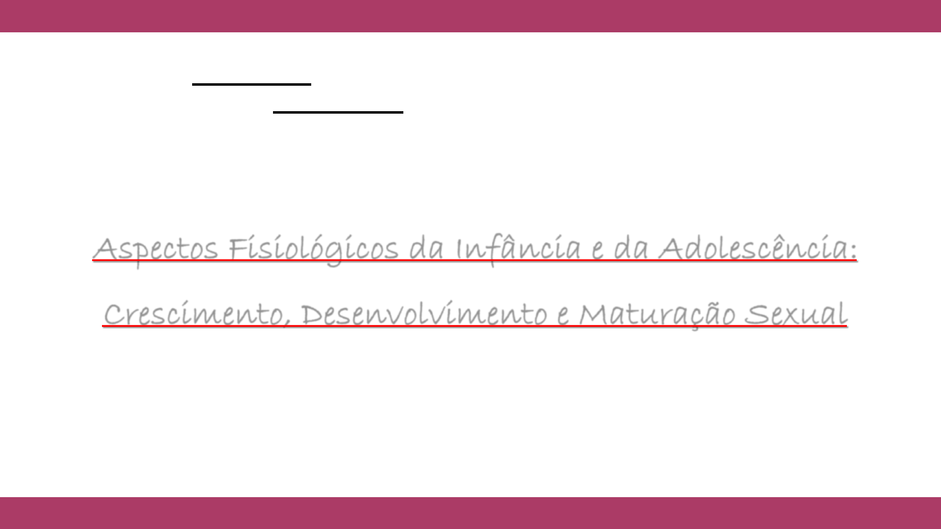 <p>Aspectos Fisiológicos da Infância e da Adolescência:</p><p>Crescimento, Desenvolvimento e Maturação Sexual</p><p>CENTRO UNIVERSITÁRIO SALESIANO</p><p>Disciplina: Nutrição Clínica – Infância e Adolescência</p><p>Professora: Mayara Freitas Monteiro</p><p>Adolescência</p><p>ADOLESCÊNCIA</p><p>Início:</p><p>PUBERDADE</p><p>Término:</p><p>Consolidação do crescimento</p><p>e personalidade</p><p>▪ Impulsos do desenvolvimento</p><p>físico, mental, emocional,</p><p>sexual e social</p><p>▪ Esforços do indivíduo em</p><p>alcançar os objetivos</p><p>relacionados às expectativas</p><p>culturais da sociedade</p><p>em que vive</p><p>• O Ministério da Saúde e a Organização Mundial da Saúde, definem a adolescência como a segunda</p><p>década da vida (10 a 19 anos).</p><p>• A adolescência é um período fundamental do desenvolvimento humano e deve ser considerada a</p><p>partir de aspectos biológicos, psicológicos, sociais e jurídicos.</p><p>Os Limites Cronológicos da Adolescência</p><p>“Os jovens de hoje gostam do luxo.</p><p>São mal comportados, desprezam a autoridade.</p><p>Não têm respeito pelos mais velhos e passam o tempo</p><p>a falar em vez de trabalhar.</p><p>Não se levantam quando um adulto chega.</p><p>Contradizem os pais, apresentam-se em sociedade</p><p>com enfeites estranhos”</p><p>[Sócrates (470 – 399 a.C.)]</p><p>OMS: 10 a 19 anos</p><p>Adolescência</p><p>Adolescência</p><p>Puberdade</p><p>• A puberdade caracteriza-se pelas transformações anatômicas e fisiológicas, que incluem o</p><p>crescimento, o desenvolvimento e a maturação sexual.</p><p>OS EVENTOS DA PUBERDADE INCLUEM:</p><p>• O desenvolvimento dos caracteres sexuais primários e secundários</p><p>• Desenvolvimento das gônadas (testículos e ovários)</p><p>• As modificações na composição corporal (decorrentes das ações hormonais): quantidade e</p><p>distribuição de gordura, crescimento esquelético e ganho de massa muscular</p><p>• Desenvolvimento dos sistemas respiratório e circulatório</p><p>• As alterações metabólicas</p><p>• Aceleração do crescimento estatural (crescimento ósseo) >>> fase do “estirão puberal” que dura</p><p>cerca de 3 a 4 anos e representa ganho de aproximadamente 50% do peso e 20-25% da estatura.</p><p>• Aceleração e posterior desaceleração do crescimento (estirão da puberdade)</p><p>Puberdade</p><p>Puberdade e Maturação Sexual</p><p>Durante a puberdade os adolescentes ganham 20% de sua estatura adulta</p><p>e 50% de seu peso corporal e massa óssea</p><p>▪ Oferta energética é maior pelo rápido crescimento tecidual</p><p>▪ Crescimento ósseo</p><p>▪ Desenvolvimento cerebral</p><p>Puberdade</p><p>• ADRENARCA: Aumento da secreção dos andrógenos</p><p>suprerenais</p><p>• GnRH: Liberação de FSH e LH</p><p>• GONADARCA: Aumento dos esteroides sexuais</p><p>MATURAÇÃO SEXUAL:</p><p>• Está diretamente ligada à nutrição e crescimento</p><p>• Ocorre quando o organismo adquire nutrientes suficientes</p><p>para ser reprodutivo</p><p>• Deficiência nutricional: fase de crescimento abaixo do</p><p>esperado >> retardo da maturação sexual pra compensar o</p><p>crescimento lento</p><p>• Excesso nutricional: acelera a puberdade</p><p>Revolução Hormonal</p><p>Fase caracterizada por desejo de</p><p>resultado rápido e</p><p>sem preocupação com as</p><p>consequências futuras</p><p>▪ São movidos pela revolução hormonal</p><p>▪ Comportamento alimentar impulsivo</p><p>▪ Escolhas próprias quanto à eleição dos alimentos, no</p><p>ritmo e na maneira de nutrir</p><p>▪ Aceitação física, aparência e percepção de</p><p>invencibilidade</p><p>▪ Prática de dietas revolucionárias e radicais</p><p>Controle Hormonal</p><p>• O Sistema Nervoso Central recebe</p><p>informações de muitos sensores internos e</p><p>externos e rege a produção de sinais hormonais</p><p>apropriados pelos vários tecidos endócrinos</p><p>• O hipotálamo é o centro de coordenação do</p><p>sistema endócrino >>>> recebe e integra</p><p>mensagens do sistema nervoso central</p><p>• Hipotálamo >>> envia hormônios para a</p><p>pituitária >>> estimula ou inibe a liberação de</p><p>hormônios tróficos (produzidos pela hipófise)</p><p>• Hormônios da pituitária anterior estimulam</p><p>outras glândulas endócrinas a secretarem seus</p><p>hormônios</p><p>Controle</p><p>Hormonal</p><p>Sistema</p><p>Endócrino</p><p>• Efeitos sistêmicos</p><p>• Múltiplas ações</p><p>• Desequilíbrios</p><p>• Dependência de ação</p><p>• Equilíbrio nas respostas</p><p>Puberdade</p><p>• Excesso de Proteínas animais >> relacionado a puberdade precoce</p><p>••• Excesso de produção e liberação de fatores de crescimento</p><p>••• Proteínas de sinalização anabólica</p><p>• Tipos de carboidratos e gorduras não parecem influenciar diretamente a puberdade</p><p>• Micronutrientes >>> poucos estudos</p><p>• Deficiência de vitamina D >>> parece estar associada à puberdade precoce em meninas</p><p>A obesidade e os fatores ambientais parecem ter uma relação maior e mais direta</p><p>com a puberdade precoce, sobretudo em meninas.</p><p>A alimentação e a nutrição adequadas são requisitos essenciais para o crescimento e desenvolvimento</p><p>de crianças e adolescentes, sendo que a condição nutricional na adolescência</p><p>depende do preenchimento, adequado ou inadequado, das necessidades nutricionais na infância.</p><p>Estatura Corporal</p><p>TAXA DE CRESCIMENTO:</p><p>• Balanço energético positivo</p><p>• Relação hormonal: tireóide, adrenal, pâncreas e gônadas</p><p>Estimativa de Velocidade de Crescimento</p><p>Velocidade de Crescimento</p><p>• Gráficos de Tanner e Whitehouse</p><p>• Predição por fatores genéticos</p><p>Escala de Tanner</p><p>• A maturação óssea e a maturação sexual refletem melhor a idade biológica do adolescente 