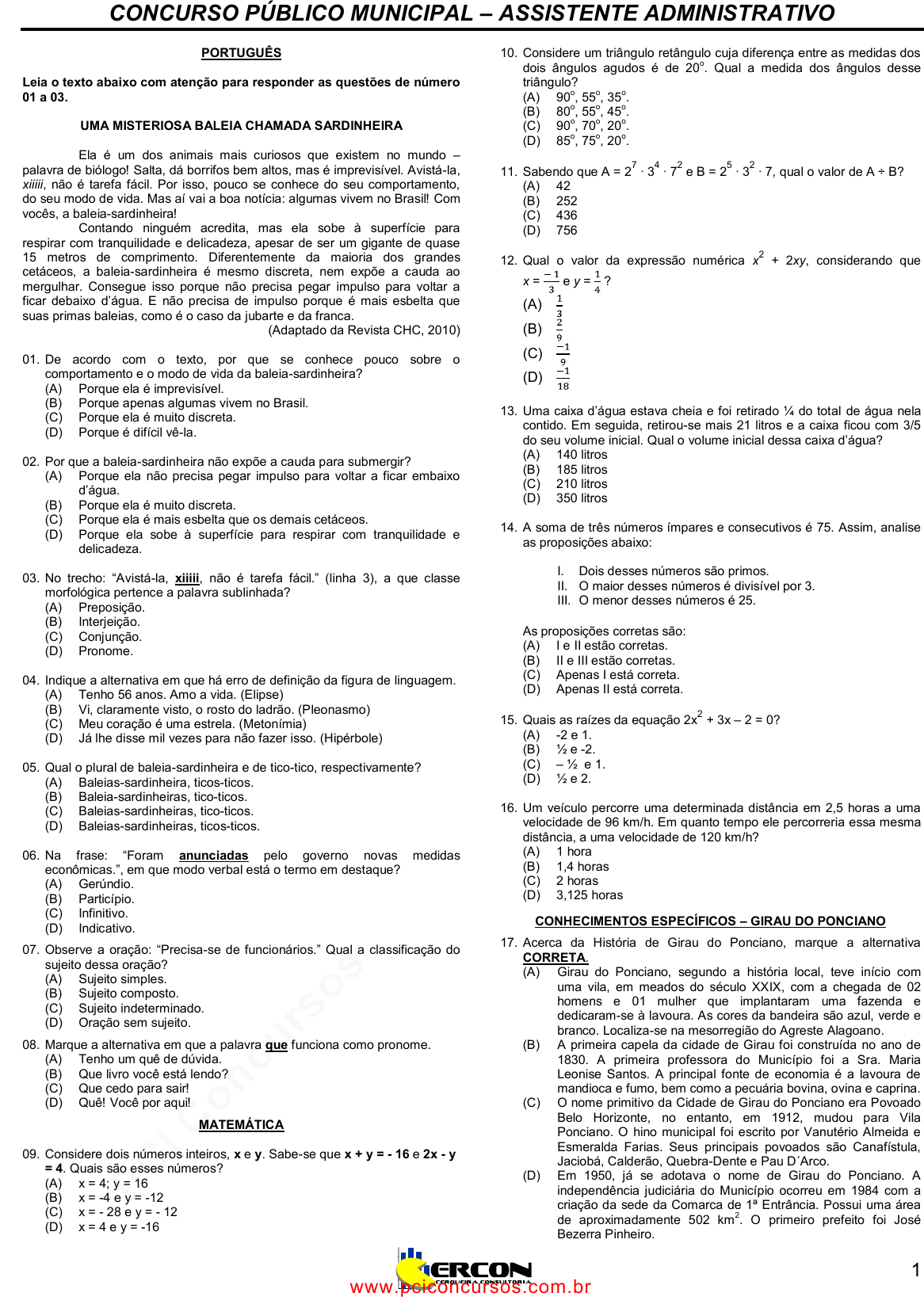 <p>pcimarkpci MDAwMDowMDAwOjAwMDA6MDAwMDowMDAwOmZmZmY6YjEzMzo0OWQ1:VGh1LCAxNyBPY3QgMjAyNCAxMDo1NTo0NSAtMDMwMA==</p><p>www.pciconcursos.com.br</p><p>CONCURSO PÚBLICO MUNICIPAL – ASSISTENTE ADMINISTRATIVO</p><p>1</p><p>PORTUGUÊS</p><p>Leia o texto abaixo com atenção para responder as questões de número</p><p>01 a 03.</p><p>UMA MISTERIOSA BALEIA CHAMADA SARDINHEIRA</p><p>Ela é um dos animais mais curiosos que existem no mundo –</p><p>palavra de biólogo! Salta, dá borrifos bem altos, mas é imprevisível. Avistá-la,</p><p>xiiiii, não é tarefa fácil. Por isso, pouco se conhece do seu comportamento,</p><p>do seu modo de vida. Mas aí vai a boa notícia: algumas vivem no Brasil! Com</p><p>vocês, a baleia-sardinheira!</p><p>Contando ninguém acredita, mas ela sobe à superfície para</p><p>respirar com tranquilidade e delicadeza, apesar de ser um gigante de quase</p><p>15 metros de comprimento. Diferentemente da maioria dos grandes</p><p>cetáceos, a baleia-sardinheira é mesmo discreta, nem expõe a cauda ao</p><p>mergulhar. Consegue isso porque não precisa pegar impulso para voltar a</p><p>ficar debaixo d’água. E não precisa de impulso porque é mais esbelta que</p><p>suas primas baleias, como é o caso da jubarte e da franca.</p><p>(Adaptado da Revista CHC, 2010)</p><p>01. De acordo com o texto, por que se conhece pouco sobre o</p><p>comportamento e o modo de vida da baleia-sardinheira?</p><p>(A) Porque ela é imprevisível.</p><p>(B) Porque apenas algumas vivem no Brasil.</p><p>(C) Porque ela é muito discreta.</p><p>(D) Porque é difícil vê-la.</p><p>02. Por que a baleia-sardinheira não expõe a cauda para submergir?</p><p>(A) Porque ela não precisa pegar impulso para voltar a ficar embaixo</p><p>d’água.</p><p>(B) Porque ela é muito discreta.</p><p>(C) Porque ela é mais esbelta que os demais cetáceos.</p><p>(D) Porque ela sobe à superfície para respirar com tranquilidade e</p><p>delicadeza.</p><p>03. No trecho: “Avistá-la, xiiiii, não é tarefa fácil.” (linha 3), a que classe</p><p>morfológica pertence a palavra sublinhada?</p><p>(A) Preposição.</p><p>(B) Interjeição.</p><p>(C) Conjunção.</p><p>(D) Pronome.</p><p>04. Indique a alternativa em que há erro de definição da figura de linguagem.</p><p>(A) Tenho 56 anos. Amo a vida. (Elipse)</p><p>(B) Vi, claramente visto, o rosto do ladrão. (Pleonasmo)</p><p>(C) Meu coração é uma estrela. (Metonímia)</p><p>(D) Já lhe disse mil vezes para não fazer isso. (Hipérbole)</p><p>05. Qual o plural de baleia-sardinheira e de tico-tico, respectivamente?</p><p>(A) Baleias-sardinheira, ticos-ticos.</p><p>(B) Baleia-sardinheiras, tico-ticos.</p><p>(C) Baleias-sardinheiras, tico-ticos.</p><p>(D) Baleias-sardinheiras, ticos-ticos.</p><p>06. Na frase: “Foram anunciadas pelo governo novas medidas</p><p>econômicas.”, em que modo verbal está o termo em destaque?</p><p>(A) Gerúndio.</p><p>(B) Particípio.</p><p>(C) Infinitivo.</p><p>(D) Indicativo.</p><p>07. Observe a oração: “Precisa-se de funcionários.” Qual a classificação do</p><p>sujeito dessa oração?</p><p>(A) Sujeito simples.</p><p>(B) Sujeito composto.</p><p>(C) Sujeito indeterminado.</p><p>(D) Oração sem sujeito.</p><p>08. Marque a alternativa em que a palavra que funciona como pronome.</p><p>(A) Tenho um quê de dúvida.</p><p>(B) Que livro você está lendo?</p><p>(C) Que cedo para sair!</p><p>(D) Quê! Você por aqui!</p><p>MATEMÁTICA</p><p>09. Considere dois números inteiros, x e y. Sabe-se que x + y = - 16 e 2x - y</p><p>= 4. Quais são esses números?</p><p>(A) x = 4; y = 16</p><p>(B) x = -4 e y = -12</p><p>(C) x = - 28 e y = - 12</p><p>(D) x = 4 e y = -16</p><p>10. Considere um triângulo retângulo cuja diferença entre as medidas dos</p><p>dois ângulos agudos é de 20</p><p>o</p><p>. Qual a medida dos ângulos desse</p><p>triângulo?</p><p>(A) 90</p><p>o</p><p>, 55</p><p>o</p><p>, 35</p><p>o</p><p>.</p><p>(B) 80</p><p>o</p><p>, 55</p><p>o</p><p>, 45</p><p>o</p><p>.</p><p>(C) 90</p><p>o</p><p>, 70</p><p>o</p><p>, 20</p><p>o</p><p>.</p><p>(D) 85</p><p>o</p><p>, 75</p><p>o</p><p>, 20</p><p>o</p><p>.</p><p>11. Sabendo que A = 2</p><p>7</p><p>∙ 3</p><p>4</p><p>∙ 7</p><p>2</p><p>e B = 2</p><p>5</p><p>∙ 3</p><p>2</p><p>∙ 7, qual o valor de A ÷ B?</p><p>(A) 42</p><p>(B) 252</p><p>(C) 436</p><p>(D) 756</p><p>12. Qual o valor da expressão numérica x</p><p>2</p><p>+ 2xy, considerando que</p><p>x = e y = ?</p><p>(A)</p><p>(B)</p><p>(C)</p><p>(D)</p><p>13. Uma caixa d’água estava cheia e foi retirado ¼ do total de água nela</p><p>contido. Em seguida, retirou-se mais 21 litros e a caixa ficou com 3/5</p><p>do seu volume inicial. Qual o volume inicial dessa caixa d’água?</p><p>(A) 140 litros</p><p>(B) 185 litros</p><p>(C) 210 litros</p><p>(D) 350 litros</p><p>14. A soma de três números ímpares e consecutivos é 75. Assim, analise</p><p>as proposições abaixo:</p><p>I. Dois desses números são primos.</p><p>II. O maior desses números é divisível por 3.</p><p>III. O menor desses números é 25.</p><p>As proposições corretas são:</p><p>(A) I e II estão corretas.</p><p>(B) II e III estão corretas.</p><p>(C) Apenas I está correta.</p><p>(D) Apenas II está correta.</p><p>15. Quais as raízes da equação 2x</p><p>2</p><p>+ 3x – 2 = 0?</p><p>(A) -2 e 1.</p><p>(B) ½ e -2.</p><p>(C) – ½ e 1.</p><p>(D) ½ e 2.</p><p>16. Um veículo percorre uma determinada distância em 2,5 horas a uma</p><p>velocidade de 96 km/h. Em quanto tempo ele percorreria essa mesma</p><p>distância, a uma velocidade de 120 km/h?</p><p>(A) 1 hora</p><p>(B) 1,4 horas</p><p>(C) 2 horas</p><p>(D) 3,125 horas</p><p>CONHECIMENTOS ESPECÍFICOS – GIRAU DO PONCIANO</p><p>17. Acerca da História de Girau do Ponciano, marque a alternativa</p><p>CORRETA.</p><p>(A) Girau do Ponciano, segundo a história local, teve início com</p><p>uma vila, em meados do século XXIX, com a chegada de 02</p><p>homens e 01 mulher que implantaram uma fazend