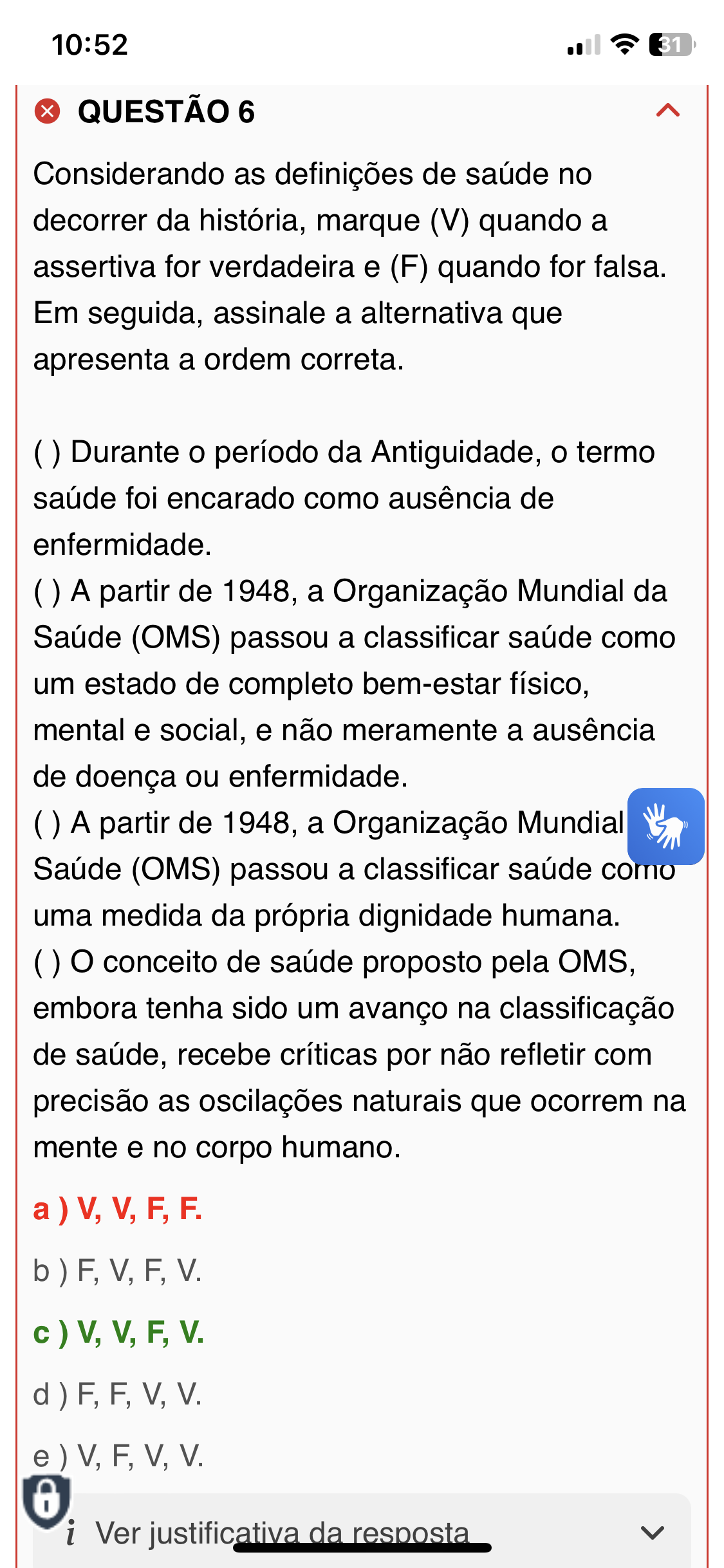 10:52 31 QUESTÃO 6 Considerando as definições de saúde no decorrer da história, marque (V) quando a assertiva for verdadeira e (F) quando for falsa. Em seguida, assinale a alternativa que apresenta a ordem correta. Durante o período da Antiguidade, o termo saúde foi encarado como ausência de enfermidade. A partir de 1948, a Organização Mundial da Saúde (OMS) passou a classificar saúde como um estado de completo bem-estar físico, mental e social, e não meramente a ausência de doença ou enfermidade. A partir de 1948, a Organização Mundial Saúde (OMS) passou a classificar saúde como uma medida da própria dignidade humana. O conceito de saúde proposto pela OMS, embora tenha sido um avanço na classificação de saúde, recebe críticas por não refletir com precisão as oscilações naturais que ocorrem na mente e no corpo humano. a) V, V, F, F. b) F, V, F, V. c) V, V, F, V. d) F, F, V, V. e) V, F, V, V. i Ver justificativa da resposta