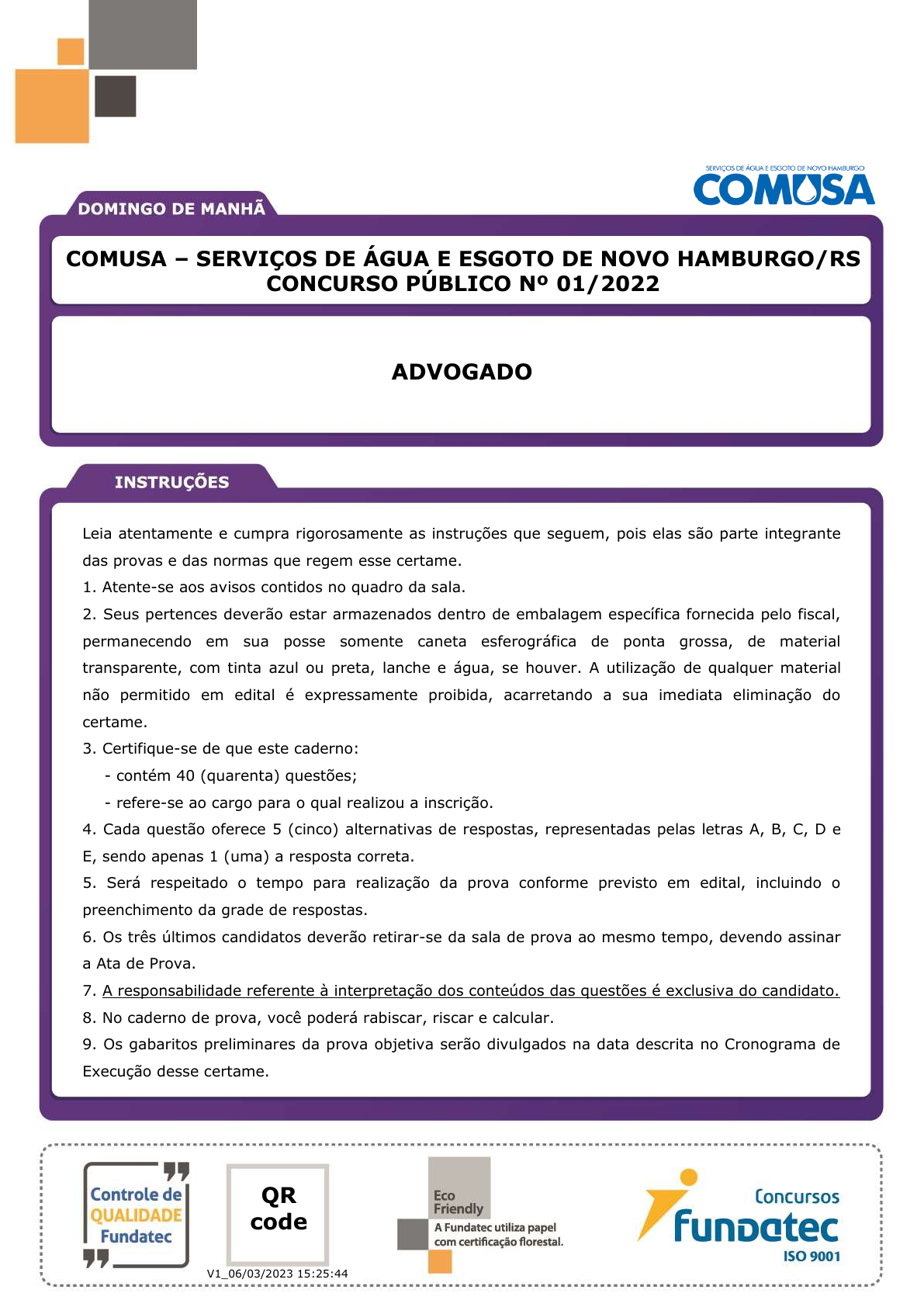 <p>pcimarkpci MDAwMDowMDAwOjAwMDA6MDAwMDowMDAwOmZmZmY6YzkxMDpjMzEx:VGh1LCAxNyBPY3QgMjAyNCAxMzoxMTo1OCAtMDMwMA==</p><p>www.pciconcursos.com.br</p><p>COMUSA – SERVIÇOS DE ÁGUA E ESGOTO DE NOVO HAMBURGO/RS</p><p>CONCURSO PÚBLICO Nº 01/2022</p><p>Leia atentamente e cumpra rigorosamente as instruções que seguem, pois elas são parte integrante</p><p>das provas e das normas que regem esse certame.</p><p>1. Atente-se aos avisos contidos no quadro da sala.</p><p>2. Seus pertences deverão estar armazenados dentro de embalagem específica fornecida pelo fiscal,</p><p>permanecendo em sua posse somente caneta esferográfica de ponta grossa, de material</p><p>transparente, com tinta azul ou preta, lanche e água, se houver. A utilização de qualquer material</p><p>não permitido em edital é expressamente proibida, acarretando a sua imediata eliminação do</p><p>certame.</p><p>3. Certifique-se de que este caderno:</p><p>- contém 40 (quarenta) questões;</p><p>- refere-se ao cargo para o qual realizou a inscrição.</p><p>4. Cada questão oferece 5 (cinco) alternativas de respostas, representadas pelas letras A, B, C, D e</p><p>E, sendo apenas 1 (uma) a resposta correta.</p><p>5. Será respeitado o tempo para realização da prova conforme previsto em edital, incluindo o</p><p>preenchimento da grade de respostas.</p><p>6. Os três últimos candidatos deverão retirar-se da sala de prova ao mesmo tempo, devendo assinar</p><p>a Ata de Prova.</p><p>7. A responsabilidade referente à interpretação dos conteúdos das questões é exclusiva do candidato.</p><p>8. No caderno de prova, você poderá rabiscar, riscar e calcular.</p><p>9. Os gabaritos preliminares da prova objetiva serão divulgados na data descrita no Cronograma de</p><p>Execução desse certame.</p><p>V1_06/03/2023 15:25:44</p><p>QR</p><p>code</p><p>ADVOGADO</p><p>pcimarkpci MDAwMDowMDAwOjAwMDA6MDAwMDowMDAwOmZmZmY6YzkxMDpjMzEx:VGh1LCAxNyBPY3QgMjAyNCAxMzoxMTo1OCAtMDMwMA==</p><p>www.pciconcursos.com.br</p><p>728_BASE_NS_DM</p><p>Execução: Fundatec</p><p>NÍVEL SUPERIOR</p><p>9/3/202316:36:44</p><p>LÍNGUA PORTUGUESA</p><p>Instrução: As questões de números 01 a 10 referem-se ao texto abaixo. Os destaques ao</p><p>longo do texto estão citados nas questões.</p><p>Formigas e Cigarras</p><p>Por Fabrício Carpinejar</p><p>01</p><p>02</p><p>03</p><p>04</p><p>05</p><p>06</p><p>07</p><p>08</p><p>09</p><p>10</p><p>11</p><p>12</p><p>13</p><p>14</p><p>15</p><p>16</p><p>17</p><p>18</p><p>19</p><p>20</p><p>21</p><p>22</p><p>23</p><p>24</p><p>25</p><p>26</p><p>27</p><p>28</p><p>29</p><p>30</p><p>31</p><p>32</p><p>Existe um hábito do interior que salva a economia doméstica: pagar todas as contas</p><p>assim que se recebe o salário. Não importa se os boletos vencem mais adiante. Caiu o dinheiro</p><p>do mês, todas as pendências são zeradas. Sobra pouco, mas o pouco é real e evita a mendicância</p><p>dos juros no negativo.</p><p>Essa atitude é uma prática de quem veio de pequenas cidades no interior do Rio Grande</p><p>do Sul. Minha mãe é assim, e ela é de Guaporé. A esposa de meu melhor amigo, Carol, é assim,</p><p>e ela é de Arvorezinha. Meu grande comparsa de ZH, Mário Corso, é assim, e ele é de Passo</p><p>Fundo. São formiguinhas que seguram a folha dos honorários na cabeça, que não gastam mais</p><p>do que recebem. E ainda criam uma poupança ou um investimento para guardar parte da sua</p><p>remuneração. Dessa forma, você se previne dos arroubos consumistas, de sair torrando o que</p><p>não pode e depois carecer de recursos para cobrir os custos obrigatórios da sua vida.</p><p>Pode parecer loucura pagar tudo antecipadamente. Alguns até pensam que é burrice, o</p><p>equivalente ... oferecer grana antes da hora para os bancos e credores. A questão delicada é</p><p>que todo empregado se vê com poder aquisitivo no princípio do mês, porém isso é uma</p><p>autoridade impostora, uma _________ de duas semanas, porque ainda não liquidou as faturas</p><p>da luz, da água, do condomínio, do cartão de crédito, entre tantas responsabilidades. Elas não</p><p>irão desaparecer ou caducar. Não serão anistiadas.</p><p>Você adoece por um falso positivo, contraindo dívidas e cobrindo rombos do _________</p><p>especial com empréstimos. Pode perder o sono por desgosto e preocupação. Um mês errado</p><p>significa um ano inteiro correndo atrás da máquina. Não dá para se valer do vencimento. É uma</p><p>referência, não uma imposição.</p><p>No time oposto das formigas, vemos as cigarras, que respeitam as datas das contas, mas</p><p>não o próprio saldo bancário. Quitam os seus códigos de barra nos dias 10 e 15, quando o</p><p>depósito salarial já não é mais suficiente para honrar os compromissos.</p><p>As cigarras são acostumadas ... cantorias da ostentação, ... pedaladas da ilusão, ... euforia</p><p>imediatista, aos adiamentos da capital. Certamente, ao obterem os créditos do dia 5, oferecerão</p><p>churrasco com bebida liberada aos colegas, farão viagens pela Serra, desfilarão em seus</p><p>restaurantes favoritos. São milionárias por alguns minutos, inconsequentes, adeptas de curtir</p><p>intensamente cada momento da existência. Acreditam que encontrarão um _________ redentor</p><p>para recompor as finanças, que haverá um milagre econômico, ou uma Bolsa Picanha, ou um</p><p>sorteio na Mega-Sena, ou um fundo perdido de restituição do governo.</p><p>A dolorosa verdade é que vivem pedindo ajuda infinita aos pais formiguinhas.</p><p>(Disponível em: https://gauchazh.clicrbs.com.br/colunistas/carpinejar/noticia/2023/01/formigas-e-cigarras-</p><p>cld0o97pi00000181v02w6ue6.html – texto adaptado especialmente para esta prova).</p><p>QUESTÃO 01 – De acordo com o texto, analise as assertivas abaixo, assinalando V, se verdadeiras,</p><p>ou F, se falsas.</p><p>( ) O autor compara com formiguinhas as pessoas que pagam suas contas assim que recebem o</p><p>salário.</p><p>( ) Ao com