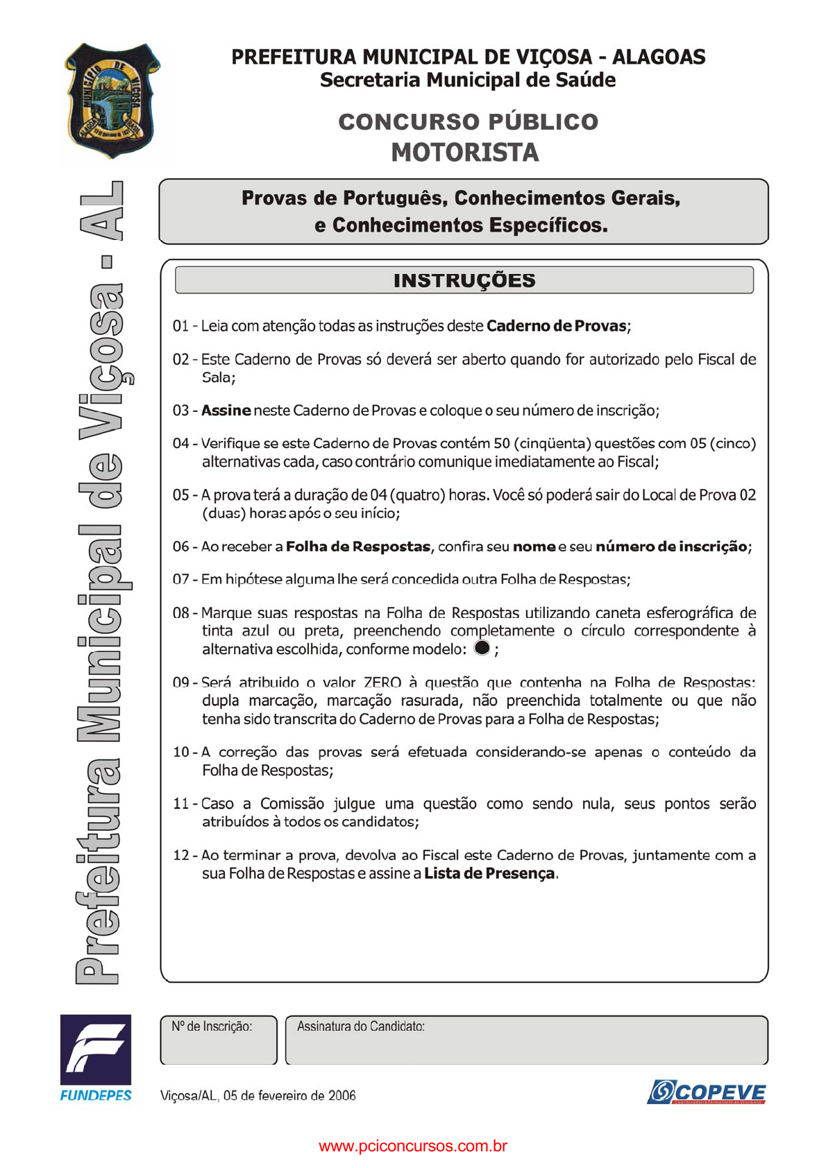 <p>pcimarkpci MDAwMDowMDAwOjAwMDA6MDAwMDowMDAwOmZmZmY6YjEzMzo0OWQ1:VGh1LCAxNyBPY3QgMjAyNCAxMzozMDo1NSAtMDMwMA==</p><p>www.pciconcursos.com.br</p><p>19/06/2005</p><p>Vestibular CESAMA 2005/2 1</p><p>www.pciconcursos.com.br</p><p>pcimarkpci MDAwMDowMDAwOjAwMDA6MDAwMDowMDAwOmZmZmY6YjEzMzo0OWQ1:VGh1LCAxNyBPY3QgMjAyNCAxMzozMDo1NSAtMDMwMA==</p><p>www.pciconcursos.com.br</p><p>05/02/2006</p><p>Concurso PMV-2006 – Motorista 2</p><p>PORTUGUÊS</p><p>Detalhes</p><p>O velho porteiro do palácio chega em casa, trêmulo.</p><p>Como sempre que tem baile no palácio, sua mulher o espera</p><p>com café da manhã reforçado. Mas desta vez ele nem olha para</p><p>a xícara fumegante, o bolo, a manteiga, as geléias. Vai direto à</p><p>aguardente. Atira-se na sua poltrona perto do fogão e toma um</p><p>longo gole de bebida, pelo gargalo.</p><p>– Helmuth, o que foi?</p><p>– Espera, Helga. Deixe eu me controlar primeiro.</p><p>Toma outro gole de aguardente.</p><p>– Conta, homem! O que houve com você? Aconteceu</p><p>alguma coisa no baile?</p><p>– Co-começou tudo bem. As pessoas chegando, todo</p><p>mundo de gala, todos com convite, tudo direitinho. Sempre tem,</p><p>é claro, o filhinho-de-papai sem convite que quer me levar na</p><p>conversa, mas já estou acostumado. Comigo não tem conversa.</p><p>De repente, chega a maior carruagem que eu já vi. Enorme. E</p><p>toda de ouro. Puxada por três parelhas de cavalos brancos.</p><p>Cavalões! Elefantes! De dentro da carruagem salta uma dona.</p><p>Sozinha. Uma beleza. Eu me preparo para barrar a entrada dela</p><p>porque mulher desacompanhada não entra em baile do palácio.</p><p>Mas essa dona é tão bonita, tão, sei lá, radiante, que eu não</p><p>digo nada e deixo ela entrar.</p><p>– Bom, Helmuth. Até aí...</p><p>– Espera. O baile continua. Tudo normal. Às vezes rola</p><p>um bêbedo pela escadaria, mas nada de mais. E então bate a</p><p>meia-noite. Há um rebuliço na porta do palácio. Olho para trás e</p><p>vejo uma mulher maltrapilha que desce pela escadaria,</p><p>correndo. Ela perde um sapato. E um príncipe atrás dela.</p><p>– E o príncipe?</p><p>– Ele mesmo. E gritando para mim segurar a</p><p>esfarrapada. “Segura! Segura!” Me preparo para segurá-la</p><p>quando ouço uma espécie de “vum” acompanhado de um clarão.</p><p>Me viro e...</p><p>– E o quê, meu Deus?</p><p>O porteiro esvazia a garrafa com um último gole.</p><p>– Você não vai acreditar.</p><p>– Conta!</p><p>– A tal carruagem. A de ouro. Tinha se transformado</p><p>numa abóbora.</p><p>– Numa o quê?!</p><p>– Eu disse que você não ia acreditar.</p><p>– Uma abóbora?</p><p>– E os cavalos em ratos.</p><p>– Helmuth...</p><p>– Não tem mais aguardente?</p><p>– Acho que você já bebeu demais por hoje.</p><p>– Juro que não bebi nada!</p><p>– Esse trabalho no palácio está acabando com você,</p><p>Helmuth. Pede para ser transferido para o almoxarifado.</p><p>In ‘Domingo’, revista do Jornal do Brasil, n. 117.</p><p>As questões de 01 a 03 correspondem à compreensão</p><p>do texto dado. Assinale a alternativa correta.</p><p>01. As personagens presentes no primeiro segmento do conto</p><p>são</p><p>A) o velho, o porteiro e a mulher Helga.</p><p>B) o velho, o porteiro, a esposa e Helga.</p><p>C) Helmuth, Helga e o velho.</p><p>D) o velho porteiro Helmuth e sua mulher Helga.</p><p>E) Helmuth, Helga e o velho.</p><p>02. Que outros elementos estranhos à nossa realidade são</p><p>dados ao leitor no segundo segmento do texto?</p><p>A) Os nomes das personagens tipicamente estrangeiros.</p><p>B) A estrutura diálogo foge à realidade.</p><p>C) O excessivo uso de interrogações.</p><p>D) O uso dos verbos no diálogo comum.</p><p>E) A presença do travessão no discurso.</p><p>03. O que o narrador quis mostrar ao leitor com a repetição da</p><p>sílaba inicial do verbo começar nas palavras do porteiro?</p><p>A) O narrador mostra o nervosismo do porteiro, mas que não</p><p>se percebia.</p><p>B) O narrador mostra a segurança e valentia do porteiro.</p><p>C) O narrador identifica o nível de controle e segurança do</p><p>porteiro.</p><p>D) O narrador mostra, dessa forma, o nervosismo do porteiro,</p><p>que gaguejava.</p><p>E) O narrador comprova o nível intelectual do porteiro.</p><p>04. Para isolar o vocativo, isolar qualquer elemento de valor</p><p>explicativo e para indicar a supressão de uma palavra,</p><p>emprega(m)-se, geralmente,</p><p>A) a vírgula e os dois pontos.</p><p>B) apenas a vírgula.</p><p>C) reticências e vírgula.</p><p>D) apenas o ponto.</p><p>E) a vírgula e o ponto-e-vírgula.</p><p>05. “....... dois meses que não vejo Paulo. Soube que ele esteve</p><p>....... beira de uma crise nervosa ....... menos de cinco dias</p><p>do vestibular.” A alternativa que preenche corretamente as</p><p>lacunas é</p><p>A) Há, a, a.</p><p>B) Há, à, a.</p><p>C) Há, à, à.</p><p>D) A, a, à.</p><p>E) A, à, a.</p><p>www.pciconcursos.com.br</p><p>pcimarkpci MDAwMDowMDAwOjAwMDA6MDAwMDowMDAwOmZmZmY6YjEzMzo0OWQ1:VGh1LCAxNyBPY3QgMjAyNCAxMzozMDo1NSAtMDMwMA==</p><p>www.pciconcursos.com.br</p><p>05/02/2006</p><p>Concurso PMV-2006 – Motorista 3</p><p>06. Assinale a alternativa em que somente há hiatos.</p><p>A) quase, céu, rua</p><p>B) país, saída, amendoim</p><p>C) ruim, iguais, suor</p><p>D) preguiça, maquinaria, secundário</p><p>E) saúde, saudade, herói</p><p>07. Indique a alternativa em que há o mesmo encontro vocálico</p><p>da palavra Paraguai.</p><p>A) silêncio</p><p>B) saguão</p><p>C) caía</p><p>D) redargüiu</p><p>E) sangue</p><p>08. Assinale a alternativa correta.</p><p>A) O tritongo é formado de uma vogal entre duas consoantes.</p><p>B) O hiato é o encontro de duas vogais.</p><p>C) O ditongo é o encontro de duas vogais na mesma sílaba.</p><p>D) O hiato é formado por duas vogais na mesma sílaba.</p><p>E) O encontro consonantal é o encontro de duas vogais em</p><p>sílabas diferentes.<