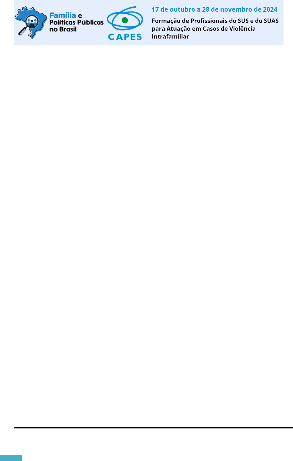 <p>TÍTULO DO ARTIGO RESUMIDO (até 5 palavras)</p><p>Último sobrenome dos autores (não incluir na submissão)</p><p>Formação de Profissionais do SUS e do SUAS para Atuação em Casos de Violência Intrafamiliar</p><p>17 de outubro a 28 de novembro de 2024</p><p>CONCEITUALIZAÇÃO E IDENTIFICAÇÃO DA VIOLÊNCIA INTRAFAMILIAR</p><p>Luísa Habigzang</p><p>Pontifícia Universidade Católica do Rio Grande do Sul (PUCRS)</p><p>Priscila Lawrenz</p><p>Universidade do Vale do Rio dos Sinos (Unisinos)</p><p>Thaís Arnoud</p><p>Pontifícia Universidade Católica do Rio Grande do Sul (PUCRS)</p><p>Introdução</p><p>A prevenção e o enfrentamento à violência intrafamiliar estão atrelados ao</p><p>conhecimento sobre esse fenômeno complexo. Conhecer as diferentes formas de violência</p><p>contribui para que profissionais da saúde e da assistência social identifiquem essas situações e,</p><p>a partir daí, tomem decisões sobre estratégias de acolhimento, notificação e encaminhamento</p><p>de acordo com as demandas apresentadas. Dessa forma, este capítulo tem como objetivo</p><p>apresentar o fenômeno da violência nos contextos familiar, doméstico e nas relações íntimas</p><p>com base no Modelo Ecológico e na Teoria da Interseccionalidade, que permitem compreender</p><p>processos de vulnerabilização. Além disso, serão apresentadas as tipologias de violência e as</p><p>consequências dessas experiências para indivíduos, famílias, comunidades e sociedades.</p><p>O que é violência?</p><p>A violência é um problema de saúde pública e uma grave violação de direitos humanos,</p><p>definida como o uso intencional da força física ou do poder, por meio de prática ou ameaça,</p><p>contra si mesmo, outra pessoa, grupo ou comunidade. Trata-se de uma ação que resulta ou tem</p><p>possibilidade de resultar em lesões, danos psicológicos, dificuldades de desenvolvimento ou</p><p>TÍTULO DO ARTIGO RESUMIDO (até 5 palavras)</p><p>Último sobrenome dos autores (não incluir na submissão)</p><p>Formação de Profissionais do SUS e do SUAS para Atuação em Casos de Violência Intrafamiliar</p><p>17 de outubro a 28 de novembro de 2024</p><p>morte. O fenômeno da violência é compreendido a partir de três categorias: 1) Violência</p><p>autoprovocada: subdividida em comportamento suicida e autolesão; 2) Violência interpessoal:</p><p>subdividida em violência intrafamiliar, violência por parceiro íntimo e violência na</p><p>comunidade; 3) Violência coletiva: subdividida em violência social, política e econômica que</p><p>podem ser cometidas por grupos ou pelo Estado (World Health Organization [WHO], 2002).</p><p>A violência intrafamiliar é caracterizada por toda ação ou omissão que afeta um ou mais</p><p>membros da família, prejudicando o direito ao pleno desenvolvimento, o bem-estar, a</p><p>integridade física e psicológica. Pode ser cometida por qualquer integrante da família, com ou</p><p>sem laço de consanguinidade (Day et al., 2003). Já a violência nas relações íntimas refere-se a</p><p>expressões de violência física, psicológica, sexual, moral ou patrimonial que ocorrem entre</p><p>pessoas que estão ou estiveram em um relacionamento íntimo afetivo-sexual. É perpetrada por</p><p>parcerias ou ex-parcerias íntimas, independente da existência de laços formais de união ou</p><p>coabitação (Brasil, 2020). Por fim, a violência doméstica é caracterizada por violências que</p><p>ocorrem entre pessoas que habitam a mesma residência, com ou sem laços familiares e/ou</p><p>consanguíneos (Miura et al., 2018). A maior parte das violências intrafamiliares e nas relações</p><p>íntimas caracteriza-se como violência doméstica.</p><p>Modelo Ecológico da Violência</p><p>A violência é um fenômeno multicausal que deve ser compreendido a partir de quatro</p><p>níveis de fatores: individual, relacional, comunitário e macrossocial. Tais níveis são relevantes</p><p>para compreender fatores de risco e de proteção para experienciar violência, bem como seus</p><p>efeitos para a saúde e o desenvolvimento psicossocial. Não devem ser considerados ou</p><p>analisados de forma isolada, pois estão inter-relacionados e são interdependentes, ou seja, o que</p><p>ocorre em um nível gera efeitos nos demais (Dahlberg & Krug, 2006; WHO, 2024). Na Figura</p><p>1, o Modelo Ecológico é apresentado graficamente.</p><p>TÍTULO DO ARTIGO RESUMIDO (até 5 palavras)</p><p>Último sobrenome dos autores (não incluir na submissão)</p><p>Formação de Profissionais do SUS e do SUAS para Atuação em Casos de Violência Intrafamiliar</p><p>17 de outubro a 28 de novembro de 2024</p><p>Figura 1. Modelo Ecológico</p><p>O nível individual refere-se às características biopsicossociais que podem estar</p><p>associadas à maior ou menor vulnerabilidade à violência. Características como gênero, raça,</p><p>idade, deficiência, identidade sexual, escolaridade, renda, temperamento, saúde prévia,</p><p>estratégias de enfrentamento e habilidades socioemocionais são fatores que atuam aumentando</p><p>ou reduzindo as chances de experienciar violência (Dahlberg & Krug, 2006; WHO, 2024).</p><p>O nível relacional diz respeito aos aspectos da dinâmica familiar ou da relação íntima.</p><p>O vínculo entre o autor da violência e a vítima, as habilidades de comunicação, o histórico</p><p>transgeracional de violência, a adesão da família a papéis estereotipados de gênero e o</p><p>isolamento familiar de redes mais amplas de suporte social são alguns fatores que devem ser</p><p>considerados na análise da situação (Dahlberg & Krug, 2006; WHO, 2024).</p><p>O nível comunitário compreende os elos entre redes formais e informais. Diz respeito à</p><p>atuação em termos de suporte da família, amigos, vizinhos, escola, contexto de trabalho,</p><p>serviços de saúde, assistência social, justiça e segurança. Em nível informal, a credibilid