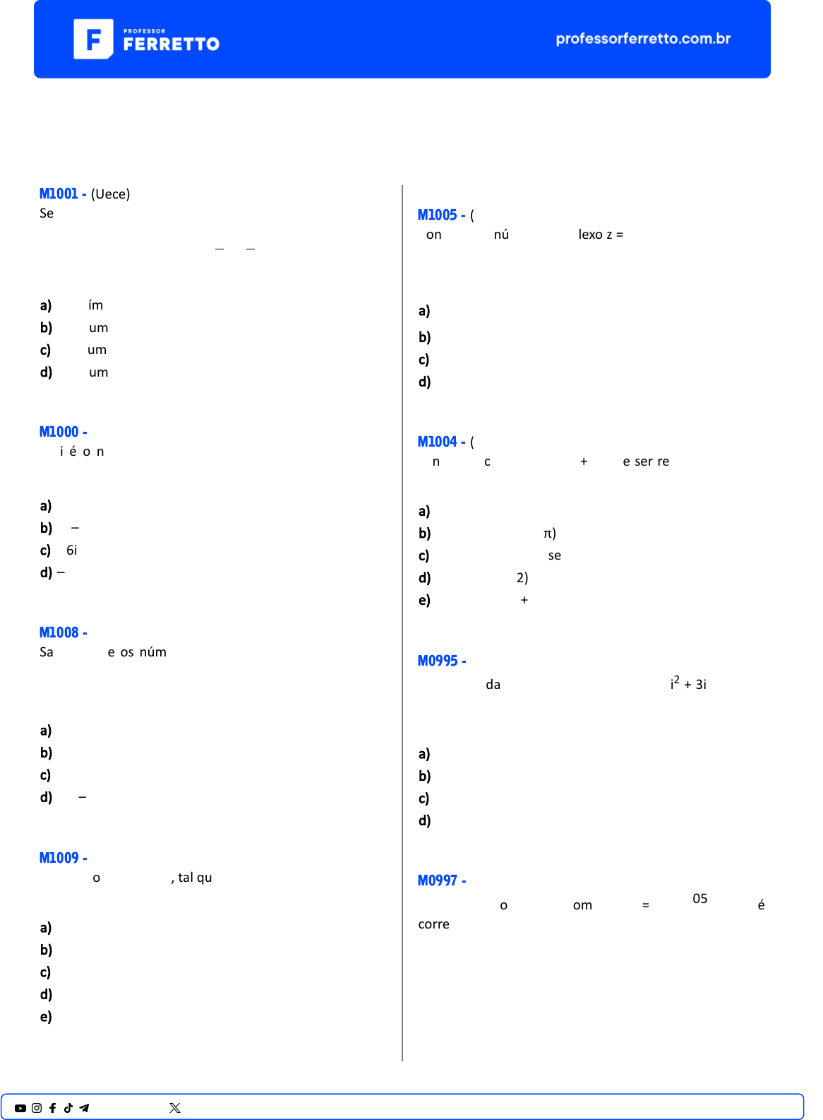<p>Não respondidas</p><p>Números complexos</p><p>M1001 - (Uece)</p><p>Se i é o número complexo cujo quadrado é igual a –1, e n</p><p>é um número natural maior do que 2, então, pode-se</p><p>afirmar corretamente que (√2 + √2𝑖)</p><p>𝑛</p><p>é um número real</p><p>sempre que</p><p>a) n for ímpar.</p><p>b) n for um múl�plo de 4.</p><p>c) n for um múl�plo de 3.</p><p>d) n for um múl�plo de 5.</p><p>M1000 - (Uece)</p><p>Se i é o número complexo cujo quadrado é igual a -1,</p><p>então, o valor de 5i227 + i6 – i13 é igual a</p><p>a) i + 1.</p><p>b) 4i – 1.</p><p>c) – 6i – 1.</p><p>d) – 6i.</p><p>M1008 - (Eear)</p><p>Sabe-se que os números complexos Z1 = [2m(3 + m)] +</p><p>(3n + 5)i e Z2 = (2m2 + 12) + [4(n + 1)]i são iguais. Então,</p><p>os valores de m e n são, respec�vamente</p><p>a) 3 e 1</p><p>b) 2 e 1</p><p>c) 2 e – 1</p><p>d) 3 e – 1</p><p>M1009 - (Upf)</p><p>O número complexo z, tal que 5z + z* = 12 + 16i é igual a:</p><p>Considere z* como o conjugado de z.</p><p>a) –2 + 2i</p><p>b) 2 – 3i</p><p>c) 3 + i</p><p>d) 2 + 4i</p><p>e) 1 + 2i</p><p>M1005 - (Unicamp)</p><p>Considere o número complexo z = (1 + ai)/(a – i) onde a é</p><p>um número real e i é a unidade imaginária, isto é, i2 = –1.</p><p>O valor de z2016 é igual a</p><p>a) a2016.</p><p>b) 1.</p><p>c) 1 + 2016i.</p><p>d) i.</p><p>M1004 - (Feevale)</p><p>O número complexo z = 1 + i pode ser representado, em</p><p>sua forma trigonométrica, por</p><p>a) z = 2(cos(π) + i.sen(π))</p><p>b) z = (cos(π) + i.sen(π))</p><p>c) z = √2 (cos(π/4) + i.sen(π/4))</p><p>d) z = √2 (cos(π/2) + i.sen(π/2))</p><p>e) z = 2(cos(π/4) + i.sen(π/4))</p><p>M0995 - (Eear)</p><p>Se i é a unidade imaginária, então 2i3 + 3i2 + 3i + 2 é um</p><p>número complexo que pode ser representado no plano</p><p>de Argand-Gauss no __________ quadrante.</p><p>a) primeiro</p><p>b) segundo</p><p>c) terceiro</p><p>d) quarto</p><p>M0997 - (Pucsp)</p><p>Em relação ao número complexo z = i87.(i105 + √3) é</p><p>correto afirmar que</p><p>1@professorferretto @prof_ferretto</p><p>a) sua imagem pertence ao 3º quadrante do plano</p><p>complexo.</p><p>b) é imaginário puro.</p><p>c) o módulo de z é igual a 4.</p><p>d) seu argumento é igual ao argumento do número</p><p>complexo v = (1/2) – (√3)i/2.</p><p>M0996 - (Mackenzie)</p><p>Se (2 + i)/(𝛽 + 2i) tem parte imaginária igual a zero, então</p><p>o número real 𝛽 é igual a</p><p>a) 4</p><p>b) 2</p><p>c) 1</p><p>d) -2</p><p>e) -4</p><p>M1007 - (Uece)</p><p>No sistema de coordenadas cartesianas usual com</p><p>origem no ponto O, considere os números complexos, na</p><p>forma trigonométrica, dados por z = 2(cos60˚ + i.sen60˚)</p><p>e w = 2(cos30˚ + i.sen30˚). Os pontos do plano que</p><p>representam estes números e a origem O são vér�ces de</p><p>um triângulo cuja medida da área é</p><p>a) 1,0 u.a.</p><p>b) 0,5 u.a.</p><p>c) 2,0 u.a.</p><p>d) 1,5 u.a.</p><p>M1003 - (Fac. Albert Einstein)</p><p>Sejam os números complexos u = 2√2 (cos315˚ +</p><p>i.sen315˚) e w = u2. Se P e Q são as respec�vas imagens</p><p>de u e w, no plano complexo, então a equação da reta</p><p>perpendicular a PQ, traçada pelo seu ponto médio, é</p><p>a) 3x + y + 2 = 0</p><p>b) 3x – y + 2 = 0</p><p>c) x + 3y + 14 = 0</p><p>d) x – 3y + 14 = 0</p><p>M0998 - (Pucsp)</p><p>Considere os números complexos z1 = –1 – i, z2 = k +</p><p>i, com k um número real posi�vo e z3 = z1 . z2.</p><p>Sabendo que |z3| = √10 é correto afirmar que</p><p>a) |z1 + z2| = √7</p><p>b) (z2 / z3) = (–1 + i) / 2</p><p>c) O argumento de z2 é 225˚.</p><p>d) z3 . z2 = –1 + 2i</p><p>M1002 - (Fuvest)</p><p>O polinômio P(x) = x3 – 3x2 + 7x – 5 possui uma raiz</p><p>complexa 𝜆 cuja parte imaginária é posi�va. A parte real</p><p>de 𝜆3 é igual a</p><p>a) – 11</p><p>b) – 7</p><p>c) 9</p><p>d) 10</p><p>e) 12</p><p>M1006 - (Pucrs)</p><p>Uma das criações na Matemá�ca que revolucionou o</p><p>conceito de número foi a dos números complexos. O</p><p>matemá�co italiano Rafael Bombelli (1526-1572) foi o</p><p>primeiro a escrever as regras de adição e mul�plicação</p><p>para esses números, o que facilitou o estudo das raízes</p><p>de um polinômio. Esse fato veio a contribuir para a</p><p>resolução de problemas como o que segue.</p><p>Os pontos do plano complexo que são raízes de um</p><p>polinômio de grau 4 com coeficientes reais são unidos</p><p>por segmentos de reta paralelos aos eixos coordenados.</p><p>Se duas dessas raízes são 2 + 3i e –1 + 3i, então a figura</p><p>ob�da será um</p><p>a) triângulo.</p><p>b) quadrado.</p><p>c) retângulo.</p><p>d) trapézio.</p><p>e) losango.</p><p>M0999 - (Unicamp)</p><p>Sejam a e b números reais não nulos. Se o número</p><p>complexo z = a + bi é uma raiz da equação quadrá�ca x2 +</p><p>bx + a = 0, então</p><p>a) |z| = 1/√3</p><p>b) |z| = 1/√5</p><p>c) |z| = √3</p><p>d) |z| = √5</p><p>2@professorferretto @prof_ferretto</p>
