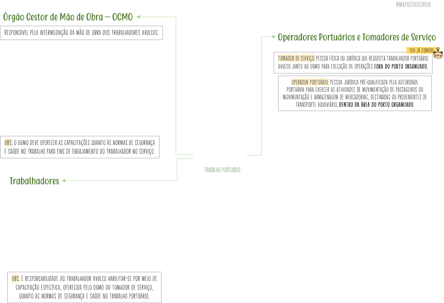 <p>NR 29</p><p>Atribuições</p><p>Devem:</p><p> Cumprir e fazer cumprir a NR 29 e as demais disposições</p><p>legais de segurança e saúde aplicáveis ao trabalho</p><p>portuário;</p><p> Assegurar que as operações ocorram após a</p><p>implementação das medidas de prevenção, conforme</p><p>previsto na NR 01;</p><p> Realizar operação portuária com os trabalhadores utilizando</p><p>corretamente os equipamentos de proteção individual,</p><p>devendo atender à NR 06.</p><p> Participar, com os operadores portuários e tomadores de</p><p>serviço, da definição das medidas de prevenção;</p><p> Proporcionar a todos os trabalhadores formação sobre</p><p>segurança e saúde no trabalho portuário;</p><p> Escalar trabalhadores capacitados, conforme os riscos</p><p>informados pelo operador portuário ou tomador de serviço;</p><p> Atender à NR 06 em relação ao EPI;</p><p> Elaborar e implementar o PCMSO;</p><p> Notificar o operador portuário ou tomador de serviço na</p><p>eventualidade de descumprimento desta NR ou demais</p><p>disposições legais de segurança e saúde dos trabalhadores</p><p> Cumprir as disposições desta NR, bem como as demais</p><p>disposições legais de segurança e saúde no trabalho, no</p><p>que lhe couber;</p><p> Informar ao responsável pela operação, as avarias ou</p><p>deficiências observadas que possam constituir risco para</p><p>o trabalhador ou para operação;</p><p> Utilizar corretamente os dispositivos de segurança, EPI</p><p>e EPCs, que lhes sejam fornecidos, bem como as</p><p>instalações que lhes forem destinadas.</p><p>NR 29</p><p>Campo de Aplicação</p><p>Local situado em baía, angra, enseada, foz ou margens</p><p>de rios, que ofereça:</p><p> Proteção natural ou artificial contra ventos, marés,</p><p>ondas e correntes;</p><p> Instalações para atracação e amarração de</p><p>embarcações;</p><p> Áreas de armazenagem e equipamentos de</p><p>movimentação de carga, que possibilite o embarque</p><p>e desembarque de mercadorias, cargas diversas e</p><p>passageiros.</p><p> Instalação localizada dentro ou fora da área do</p><p>porto organizado;</p><p> Utilizada em:</p><p>o Movimentação de passageiros;</p><p>o Movimentação ou armazenagem de</p><p>mercadorias e cargas diversas destinadas</p><p>ou provenientes de transporte aquaviário.</p><p> Bem público;</p><p> Construído e aparelhado para atender a</p><p>necessidades de navegação, de movimentação de</p><p>passageiros ou de movimentação e armazenagem</p><p>de mercadorias;</p><p> Tráfego e operações portuárias estejam sob</p><p>jurisdição de autoridade portuária.</p><p> Situado próximo a um porto organizado ou a uma</p><p>instalação portuária;</p><p> Compreendida no perímetro de cinco quilômetros dos</p><p>limites da zona primária, com área demarcada pela</p><p>autoridade aduaneira local;</p><p> Onde são executados os serviços de operação, sob</p><p>controle aduaneiro, com carga de importação e</p><p>exportação, embarcadas em contêiner, reboque ou</p><p>semirreboque.</p><p>NR 29</p><p>PGR</p><p>OPERADOR PORTUÁRIO,</p><p>TOMADOR DE SERVIÇO</p><p>E O EMPREGADOR</p><p>Nos termos da NR 1, na</p><p>instalação portuária em</p><p>que atuem.</p><p>ADMINISTRAÇÃO</p><p>PORTUÁRIA</p><p>Nos termos da NR 1, levando em</p><p>consideração as informações dos</p><p>riscos ocupacionais que possam</p><p>impactar nas operações portuárias</p><p>fornecidas pelos operadores</p><p>portuários, tomadores de serviço,</p><p>empregadores e OGMO.</p><p>OGMO</p><p>Levando em consideração as</p><p>informações dos riscos</p><p>ocupacionais fornecidas pelos</p><p>operadores portuários,</p><p>tomadores de serviço e</p><p>administração portuária</p><p>O operador portuário, o tomador de serviço e o</p><p>empregador devem elaborar e manter de forma acessível</p><p>aos trabalhadores os seguintes procedimentos:</p><p> Acesso seguro a embarcações;</p><p> Transporte, movimentação, armazenamento e</p><p>manuseio seguro de cargas;</p><p> Segurança do trabalho portuário executado nos</p><p>porões das embarcações;</p><p> Segurança do trabalho portuário executado em</p><p>espaço confinado, nos termos da NR 33;</p><p> Segurança para a execução do trabalho portuário em</p><p>condições climáticas e ambientais adversas e</p><p>interrupção das atividades nessas situações, quando</p><p>comprometerem a segurança dos trabalhadores;</p><p> Segurança para as operações com cargas perigosas.</p><p> : dimensionamento</p><p>baseado no número estimado de trabalhadores avulsos a</p><p>serem tomados no ano;</p><p> > para cada grupo de 2000</p><p>trabalhadores ou fração acima de 500, haverá um</p><p>acréscimo de um profissional especializado por função,</p><p>exceto no caso do técnico de segurança do trabalho, no</p><p>qual haverá um acréscimo de 3 profissionais.</p><p>NR 29</p><p>SESSTP</p><p> Constituída pelo OGMO;</p><p> Atende trabalhadores avulsos.</p><p> SESSTP possui as mesmas atribuições do SESMT e</p><p>realiza a inspeção das condições de segurança nas</p><p>operações portuárias;</p><p>Deve ser previamente realizada na atracação e a bordo das</p><p>embarcações e quando houver alterações nas operações</p><p>portuárias, devendo atender aos seguintes requisitos:</p><p> Verificação das condições para realização das atividades,</p><p>adotando as medidas necessárias de acordo com</p><p>procedimentos de segurança estabelecidos;</p><p> Identificação de condições impeditivas, devendo a</p><p>permissão para a execução ou retomada dos trabalhos</p><p>ocorrer após a adoção de medidas de prevenção;</p><p> Verificação da necessidade de sinalização de segurança</p><p>em razão de olhais, escadas, tubulações, aberturas e</p><p>cantos vivos e execução das medidas, quando for o caso.</p><p>Deve-se:</p><p>o Imediatamente adotar medidas de prevenção</p><p>específicas;</p><p>o Se os riscos n