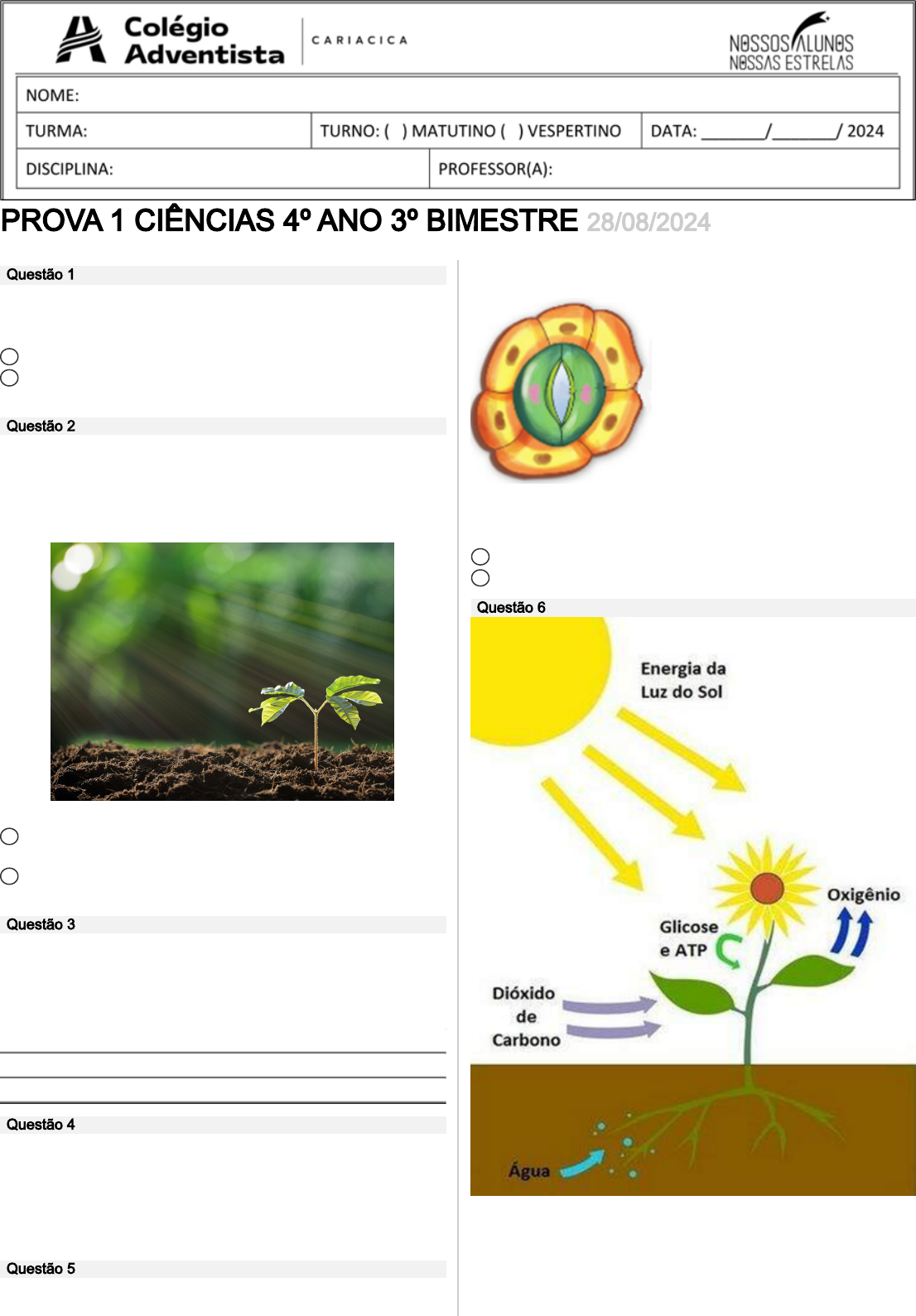 <p>PROVA 1 CIÊNCIAS 4º ANO 3º BIMESTRE 28/08/2024</p><p>Questão 1</p><p>Sabemos que a planta, como um ser vivo, necessita respirar.</p><p>Marque a alternativa que descreve esse processo. (VALOR: 1.5)</p><p>a A respiração das plantas ocorre 24h através do gás carbônico.</p><p>b Assim como os seres humanos, as plantas necessitam do gás</p><p>oxigênio para sua respiração. Esse processo ocorre 24h por dia.</p><p>Questão 2</p><p>A fotossíntese é um processo muito importante para as plantas.</p><p>Por meio dela, as plantas obtêm seu alimento.</p><p>Marque a alternativa correta sobre os elementos que as plantas</p><p>utilizam para realizar a fotossíntese. (VALOR: 1.5)</p><p>a As plantas utilizam o gás carbônico, a água e a luz para</p><p>realizar a fotossíntese.</p><p>b As plantas utilizam o gás oxigênio, o gás carbônico, a água e</p><p>os nutrientes do solo para realizar a fotossíntese.</p><p>Questão 3</p><p>De acordo com o que estudamos, quando falamos de nutrição das</p><p>plantas, não podemos esquecer dos três elementos principais que</p><p>elas utilizam para fabricar o próprio alimento.</p><p>Quais são eles? (VALOR: 0.9 - 0.3 CADA)</p><p>Questão 4</p><p>Qual é a função dos vasos condutores?</p><p>Marque a resposta correta. (VALOR: 1.5)</p><p>( ) Transportar água ao longo do caule da planta.</p><p>( ) Irrigar a planta dos galhos até as folhas e frutos.</p><p>Questão 5</p><p>Vimos que a planta respira, faz fotossíntese e realiza</p><p>a transpiração através de pequenas aberturas.</p><p>Observe a imagem:</p><p>Qual é o nome dessa estrutura: (VALOR: 1.5)</p><p>a Folha.</p><p>b Estômatos.</p><p>Questão 6</p><p>Vimos que todas as plantas produzem o próprio alimento por meio</p><p>desse processo. Esse alimento é aproveitado por ela mesma e</p><p>indiretamente por outros animais.</p><p>Marque a alternativa que contém o nome do processo que foi</p><p>mencionado. (VALOR: 1.5)</p><p>a Fotocópia.</p><p>b Nutrição.</p><p>c Fotossíntese.</p><p>Questão 7</p><p>Os animais são classificados em quatro grupos, de acordo com a</p><p>cadeia alimentar.</p><p>Enumere cada animal ao seu grupo certo na</p><p>cadeia alimentar. (VALOR: 1.0 - 0.25 CADA)</p><p>1- Alimentam-se de vegetais (capim, folhas, frutos e etc.). São os</p><p>animais herbívoros.</p><p>2- Consomem tanto carne quanto vegetais (folhas, raízes, mel e</p><p>etc.). São os animais onívoros.</p><p>3- Comem principalmente carne. A maioria caça e são chamados</p><p>de predadores. São os animais carnívoros.</p><p>4- Alimentam-se de outros animais mortos. São os</p><p>animais sapróvoros.</p><p>( ) Leão</p><p>( ) Boi</p><p>( ) Urubu</p><p>( ) Urso</p><p>Questão 8</p><p>As plantas precisam da luz solar para sobreviver. Existem alguns</p><p>lugares que não há plantas, pois falta essa energia.</p><p>Cite dois lugares em que as plantas não nascem. (VALOR: 1.0 -</p><p>0.5 CADA)</p><p>Questão 9</p><p>Uma plantinha foi colocada dentro de uma caixa escura, na qual</p><p>havia um pequeno orifício. Depois de alguns dias, o vegetal</p><p>encontrou essa abertura e começou a crescer para fora da caixa.</p><p>A planta não sobreviveria em um ambiente escuro.</p><p>Como ela encontrou a abertura na caixa?</p><p>Marque a alternativa correta. (VALOR: 1.5)</p><p>a Ela usou uma ferramenta para abrir a caixa.</p><p>b Ela seguiu a luz pelo pequeno orifício.</p><p>Questão 10</p><p>Considerando os hábitos alimentares humanos,como nossa</p><p>espécie poderia se classificada? Porque? (VALOR: 1.0)</p>