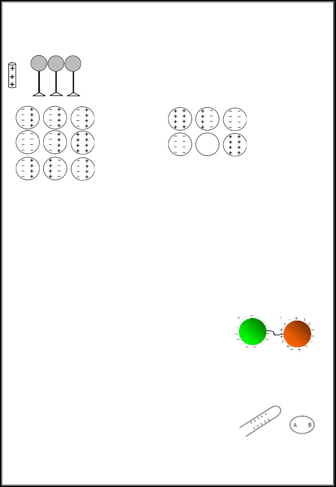 <p>Atividade de Física 2° ciclo</p><p>3° ano</p><p>1. Três esferas metálicas, apoiadas em suportes isolantes, são colocadas próximas, como no desenho</p><p>abaixo, porém sem se tocarem. Um bastão carregado positivamente é aproximado da primeira esfera.</p><p>Assinale o diagrama que melhor representa a distribuição de cargas nas esferas.</p><p>a)</p><p>b)</p><p>c)</p><p>d)</p><p>e)</p><p>2. Considere as seguintes afirmações a respeito dos processos de eletrização:</p><p>I. Na eletrização por indução, os corpos ficam eletrizados com cargas de mesmo sinal.</p><p>II. Na eletrização por atrito, os dois corpos ficam com cargas de sinais contrários.</p><p>III. No processo de eletrização por contato, o corpo induzido se eletrizará sempre com cargas de sinal</p><p>contrário às do indutor.</p><p>Com a relação as três afirmativas acima, podemos dizer que:</p><p>a) Somente II e III são verdadeiras.</p><p>b) Somente I é verdadeira.</p><p>c) Somente I e III são verdadeiras.</p><p>d) I, II e III são verdadeiras.</p><p>e) Somente II é verdadeira.</p><p>3. A figura abaixo mostra dois corpos metálicos carregados com cargas de sinais contrários e interligados</p><p>por um fio condutor.</p><p>Enquanto não houver equilíbrio eletrostático entre os corpos, através</p><p>do fio deslocam-se:</p><p>a) prótons de B para A.</p><p>b) elétrons de B para A.</p><p>c) prótons de A para B.</p><p>d) elétrons de A para B.</p><p>e) elétrons de A para B e prótons de B para A.</p><p>4. Uma barra eletrizada negativamente é colocada próxima de um corpo metálico AB (não eletrizado).</p><p>Podemos afirmar que</p><p>a) não haverá movimento de elétrons livres no corpo AB.</p><p>b) os elétrons livres do corpo AB deslocam-se para a extremidade A.</p><p>c) o sinal da carga que aparece em B é positivo.</p><p>d) ocorreu no corpo metálico a indução eletrostática.</p><p>e) após a separação de cargas, a carga total do corpo é não nula.</p><p>5. Duas pequenas esferas metálicas idênticas, A e B, localizadas no vácuo, estão carregadas com cargas</p><p>Q2QA −= e Q2QB += . As esferas são postas em contato através de pinças isolantes ideais e, após atingirem</p><p>o equilíbrio eletrostático, são separadas. Após a separação, os valores de QA e QB são respectivamente</p><p>iguais a:</p><p>a) zero e zero. b) –2Q e +2Q. c) +2Q e −2Q d) –Q e +Q e) +Q e −Q</p><p>6. Atrita-se um bastão de vidro com um pano de lã inicialmente neutro. Pode-se afirmar que:</p><p>a) só a lã fica eletrizada.</p><p>b) só o bastão fica eletrizado.</p><p>c) o bastão e a lã se eletrizam com cargas de mesmo sinal.</p><p>d) o bastão e a lã se eletrizam com cargas de mesmo valor absoluto e sinais opostos.</p><p>e) n.d.a.</p><p>7. O princípio da conservação da carga elétrica estabelece que:</p><p>a) as cargas elétricas de mesmo sinal se repelem.</p><p>b) cargas elétricas de sinais opostos se atraem.</p><p>c) a soma das cargas elétricas é constante em um sistema eletricamente isolado.</p><p>d) a soma das cargas elétricas positivas e negativas é diferente de zero em um sistema</p><p>8. Duas esferas condutoras de iguais dimensões, A e B, estão eletricamente carregadas como indica a</p><p>figura, sendo unidas por um fio condutor no qual há uma chave C inicialmente aberta. Quando a chave é</p><p>fechada, passam elétrons...</p><p>a) de A para B e a nova carga de A é +2C</p><p>b) de A para B e a nova carga de B é -1C</p><p>c) de B para A e a nova carga de A é +1C</p><p>d) de B para A e a nova carga de B é -1C</p><p>e) de B para A e a nova carga de A é +2C</p><p>9. Um corpo inicialmente neutro recebe 10 milhões de elétrons (10 000 000). Considere (e = 1,6 . 10 –19C).</p><p>Este corpo adquire uma carga de:</p><p>a) 1,6 . 10 –12C</p><p>b) –1,6 . 10–12C</p><p>c) 16 . 10–10C</p><p>d) 16 . 10 7C</p><p>10. A figura representa um eletroscópio de lâminas metálicas carregado positivamente. Tocando o dedo</p><p>na esfera A observa-se que as suas lâminas:</p><p>a) fecham, pois o eletroscópio recebe elétrons.</p><p>b) fecham, pois o eletroscópio cede elétrons.</p><p>c) abrem mais, pois o eletroscópio recebe elétrons.</p><p>d) abrem mais, pois o eletroscópio cede elétrons.</p><p>e) permanecem inalteradas, pois trocam elétrons com o dedo.</p><p>11. Um corpo com 5⋅10 2 elétrons, sabendo que a carga elementar é 1,6⋅10−19 C.</p><p>Determine:</p><p>a) O sinal da carga elétrica desse corpo.</p><p>b) O valor da carga.</p>