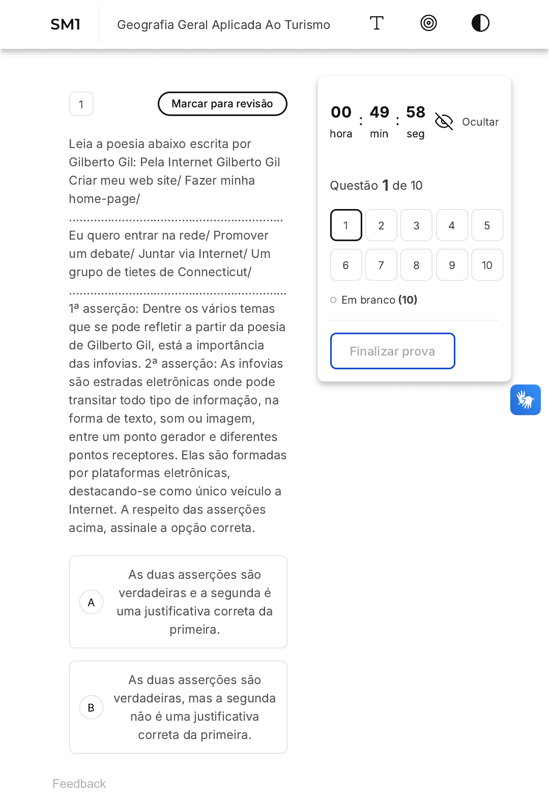 <p>A</p><p>B</p><p>1 Marcar para revisão</p><p>Leia a poesia abaixo escrita por</p><p>Gilberto Gil: Pela Internet Gilberto Gil</p><p>Criar meu web site/ Fazer minha</p><p>home-page/</p><p>.............................................................</p><p>Eu quero entrar na rede/ Promover</p><p>um debate/ Juntar via Internet/ Um</p><p>grupo de tietes de Connecticut/</p><p>..............................................................</p><p>1ª asserção: Dentre os vários temas</p><p>que se pode refletir a partir da poesia</p><p>de Gilberto Gil, está a importância</p><p>das infovias. 2ª asserção: As infovias</p><p>são estradas eletrônicas onde pode</p><p>transitar todo tipo de informação, na</p><p>forma de texto, som ou imagem,</p><p>entre um ponto gerador e diferentes</p><p>pontos receptores. Elas são formadas</p><p>por plataformas eletrônicas,</p><p>destacando-se como único veículo a</p><p>Internet. A respeito das asserções</p><p>acima, assinale a opção correta.</p><p>As duas asserções são</p><p>verdadeiras e a segunda é</p><p>uma justificativa correta da</p><p>primeira.</p><p>As duas asserções são</p><p>verdadeiras, mas a segunda</p><p>não é uma justificativa</p><p>correta da primeira.</p><p>00</p><p>hora</p><p>: 49</p><p>min</p><p>: 58</p><p>seg</p><p>Ocultar</p><p>Questão 1 de 10</p><p>Em branco �10�</p><p>Finalizar prova</p><p>1 2 3 4 5</p><p>6 7 8 9 10</p><p>Feedback</p><p>SM1 Geografia Geral Aplicada Ao Turismo</p><p>C</p><p>D</p><p>E</p><p>A primeira asserção é uma</p><p>proposição verdadeira, e a</p><p>segunda é uma proposição</p><p>falsa.</p><p>A primeira asserção é uma</p><p>proposição falsa, e a</p><p>segunda é uma proposição</p><p>verdadeira.</p><p>Tanto a primeira como a</p><p>segunda asserções são</p><p>falsas.</p><p>2 Marcar para revisão</p><p>O Índice de Desenvolvimento</p><p>Humano �IDH) é uma medida</p><p>comparativa que engloba três</p><p>dimensões: riqueza, educação e</p><p>expectativa de vida ao nascer. É uma</p><p>maneira padronizada de avaliar e</p><p>medir o bem-estar de uma</p><p>população. No ranking do IDH</p><p>mundial são considerados:</p><p>I. Exemplos de países com IDH muito</p><p>elevado: Suíça, Japão, França e</p><p>Chile.</p><p>II. Exemplos de países com IDH</p><p>elevado: China, Bolívia, Uruguai e</p><p>Brasil.</p><p>III. Exemplos Países com IDH médio:</p><p>China, Indonésia, África do Sul e</p><p>Índia.</p><p>IV. Exemplos de Países com IDH</p><p>baixo: Senegal, Ruanda, Etiópia e</p><p>Moçambique.</p><p>A</p><p>B</p><p>C</p><p>D</p><p>E</p><p>Estão corretas as alternativas:</p><p>I e IV</p><p>I e II</p><p>II e IIII</p><p>III e IV</p><p>Todas estão corretas</p><p>3 Marcar para revisão</p><p>O Tratado da Antáttica adota as</p><p>seguintes regras reguladoras das</p><p>atividades na região: Marque a</p><p>única INCORRETA.</p><p>A</p><p>B</p><p>C</p><p>Assegura a liberdade de</p><p>pesquisa, cujos resultados</p><p>devem ser permutados e</p><p>tornados livremente</p><p>utilizáveis, estando prevista</p><p>a presença de</p><p>observadores das Partes</p><p>Contratantes com acesso</p><p>irrestrito a qualquer tempo e</p><p>em qualquer lugar, aí</p><p>incluídas todas as estações,</p><p>instalações e equipamentos</p><p>existentes na Antártica;</p><p>Permite que equipamento</p><p>ou pessoal militar possa ser</p><p>introduzido na região,</p><p>desde que para pesquisa</p><p>científica ou para qualquer</p><p>outro propósito pacífico;</p><p>Admite a modificação ou</p><p>emenda do Tratado a</p><p>qualquer tempo, por acordo</p><p>unânime das Partes, ou</p><p>após decorridos trinta anos</p><p>de vigência, por solicitação</p><p>de qualquer uma das Partes</p><p>Contratantes;</p><p>D</p><p>E</p><p>Exortar as partes</p><p>contratantes a empregarem</p><p>esforços apropriados, de</p><p>conformidade com a Carta</p><p>da Organização Mundial do</p><p>Turismo, para que ninguém</p><p>exerça, na Antártica,</p><p>qualquer atividade contrária</p><p>aos princípios do Tratado.</p><p>Define a área de jurisdição</p><p>do Tratado como aquela</p><p>situada ao sul de sessenta</p><p>graus de latitude sul,</p><p>incluindo as plataformas de</p><p>gelo, ressalvando, contudo,</p><p>a preservação do direito</p><p>internacional aplicável ao</p><p>alto-mar;</p><p>4 Marcar para revisão</p><p>Entre os princípios que regem as</p><p>políticas de turismo nos níveis</p><p>nacional, estadual e municipal,</p><p>destacam-se. Assinale a alternativa</p><p>correta:</p><p>A</p><p>B</p><p>C</p><p>a. estruturar a atividade</p><p>turística; garantir a</p><p>manutenção e a usabilidade</p><p>dos direitos e deveres dos</p><p>visitantes e visitados;</p><p>preservar o patrimônio</p><p>material e imaterial, público</p><p>e privado dos destinos</p><p>visitados pelos fluxos</p><p>turísticos; combater</p><p>atividades ilegais que se</p><p>manifestem em associação</p><p>ao turismo ou por seu turno</p><p>e que atentem contra a</p><p>sociedade; e ainda buscar o</p><p>desenvolvimento do turismo</p><p>de forma sustentável,</p><p>proporcionando sua</p><p>continuidade e regularidade</p><p>em todo o território</p><p>nacional, entre outros que</p><p>podem ser enumerados.</p><p>b. concentrar-se apenas na</p><p>estrutura atividade turística.</p><p>c. o turismo tem sido</p><p>amplamente evitado nas</p><p>regiões litoraneas do</p><p>território brasileiro.</p><p>D</p><p>E</p><p>A</p><p>B</p><p>C</p><p>D</p><p>E</p><p>d. o estado brasileiro não</p><p>tem deveres com os</p><p>visitantes estrangeiros,</p><p>apenas com os visitados;</p><p>deve preservar o</p><p>patrimônio imateria e</p><p>privado dos destinos</p><p>visitados pelos fluxos</p><p>turísticos; entre outros que</p><p>podem ser enumerados.</p><p>Nenhuma das anteriores</p><p>está correta.</p><p>5 Marcar para revisão</p><p>É um espaço definido e</p><p>demarcado onde um indivíduo, ou</p><p>alguns indivíduos ou ainda uma</p><p>coletividade exe