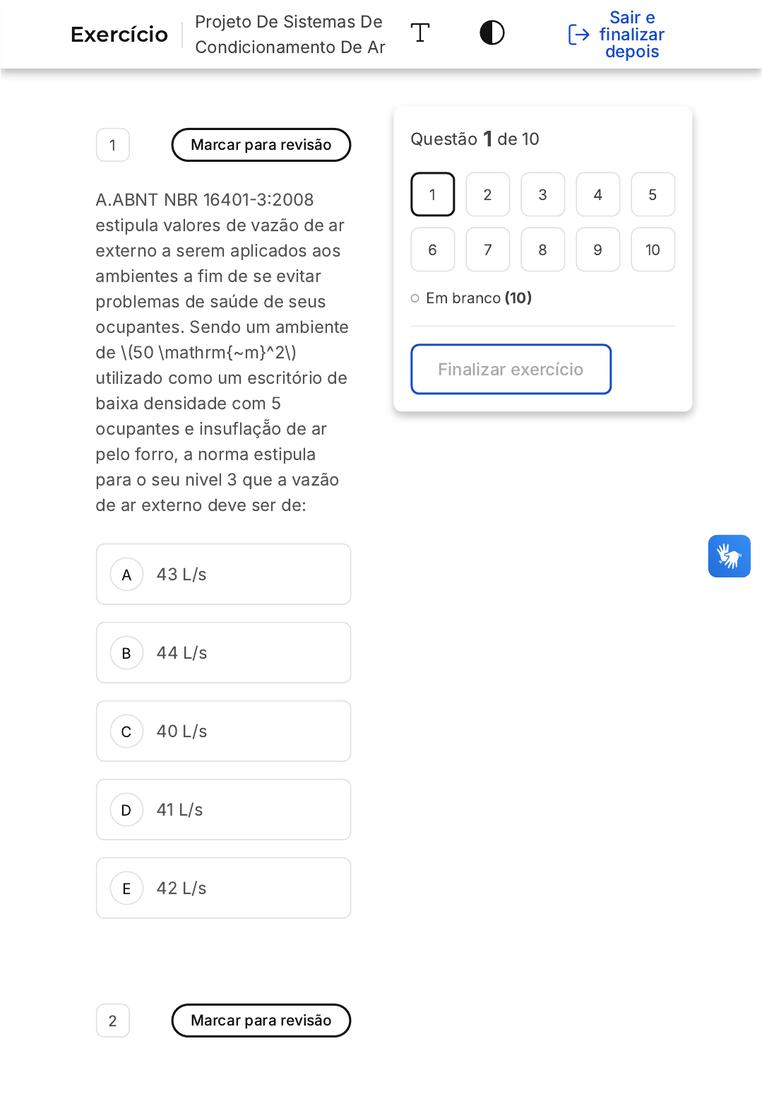 <p>A</p><p>B</p><p>C</p><p>D</p><p>E</p><p>1 Marcar para revisão</p><p>A.ABNT NBR 16401�3�2008</p><p>estipula valores de vazão de ar</p><p>externo a serem aplicados aos</p><p>ambientes a fim de se evitar</p><p>problemas de saúde de seus</p><p>ocupantes. Sendo um ambiente</p><p>de \�50 \mathrm{~m}^2\)</p><p>utilizado como um escritório de</p><p>baixa densidade com 5</p><p>ocupantes e insuflaçẵo de ar</p><p>pelo forro, a norma estipula</p><p>para o seu nivel 3 que a vazão</p><p>de ar externo deve ser de:</p><p>43 L/s</p><p>44 L/s</p><p>40 L/s</p><p>41 L/s</p><p>42 L/s</p><p>2 Marcar para revisão</p><p>Questão 1 de 10</p><p>Em branco �10�</p><p>Finalizar exercício</p><p>1 2 3 4 5</p><p>6 7 8 9 10</p><p>Exercício</p><p>Projeto De Sistemas De</p><p>Condicionamento De Ar</p><p>Sair e</p><p>finalizar</p><p>depois</p><p>A</p><p>B</p><p>C</p><p>D</p><p>E</p><p>Dentre os dados iniciais a</p><p>serem definidos antes do</p><p>cálculo de carga térmica estão</p><p>as condições externas a serem</p><p>adotadas. A.ABNT NBR 16401�</p><p>1�2008 traz valores para</p><p>algumas localidades para três</p><p>frequências anuais. Estas</p><p>frequências anuais significam:</p><p>A porcentagem de</p><p>horas no ano em que</p><p>as condições da</p><p>tabela poderão ser</p><p>ultrapassadas</p><p>A porcentagem de</p><p>horas do ano em que</p><p>as condições da</p><p>tabela serão</p><p>conseguidas</p><p>A porcentagem de</p><p>horas no ano em que</p><p>a condições da tabela</p><p>serão ultrapassadas</p><p>A porcentagem de</p><p>dias do ano em que as</p><p>condições da tabela</p><p>serão conseguidas</p><p>A porcentagem de</p><p>dias no ano em que as</p><p>condições da tabela</p><p>serão ultrapassadas</p><p>A</p><p>B</p><p>C</p><p>D</p><p>E</p><p>3 Marcar para revisão</p><p>Várias são as técnicas de</p><p>controle possíveis para</p><p>gerencias os equipamentos</p><p>existentes em uma instalação</p><p>de climatização. O fluxograma</p><p>abaixo é relativo a:</p><p>Controle liga-desliga</p><p>Um controle de</p><p>supervisão</p><p>Controle proporcional</p><p>Uma malha local</p><p>PID</p><p>4 Marcar para revisão</p><p>A vestimenta de uma pessoa é</p><p>uma condição importante para</p><p>A</p><p>B</p><p>C</p><p>D</p><p>E</p><p>A</p><p>B</p><p>C</p><p>que em determinado ambiente</p><p>a mesma tenha a sensação de</p><p>conforto térmico. A unidade de</p><p>medição da resistência térmica</p><p>de uma vestimenta utilizada</p><p>para o estudo do conforto é:</p><p>Clo</p><p>Tbs</p><p>Dpo</p><p>Tpo</p><p>Ur</p><p>5 Marcar para revisão</p><p>Dentre todas os ângulos que o</p><p>Sol faz com uma superfície de</p><p>referência, temos a altitude</p><p>solar. Esta ao meio dia depende</p><p>somente dos parâmetros de:</p><p>Solstício de equinócio</p><p>Latitude e declinação</p><p>Solstício e azimute de</p><p>parede</p><p>D</p><p>E</p><p>A</p><p>B</p><p>C</p><p>D</p><p>E</p><p>Azimute de parede e</p><p>declinação</p><p>Latitude e azimute de</p><p>parede</p><p>6 Marcar para revisão</p><p>Uma loja deve ser climatizada e</p><p>para isso é necessário saber</p><p>qual o tipo de iluminação</p><p>utilizada para o cálculo da</p><p>carga de iluminação. Após</p><p>questionamento, a informação</p><p>recebida é que o local utiliza</p><p>lâmpadas fluorescentes</p><p>compactas e que a loja tem</p><p>100 m . Sendo assim, a carga</p><p>de iluminação é de:</p><p>2</p><p>2300 W</p><p>2400 W</p><p>2500 W</p><p>2600 W</p><p>2700 W</p><p>A</p><p>B</p><p>C</p><p>D</p><p>E</p><p>7 Marcar para revisão</p><p>A diferença de temperatura</p><p>equivalente é um método de</p><p>cálculo para a determinação da</p><p>diferença de temperatura</p><p>externa e interna levando em</p><p>consideração o atraso térmico</p><p>devido ao tipo de material de</p><p>construção. Sendo uma parede</p><p>de cor clara com densidade</p><p>específica de 100 kg/m</p><p>voltado para o norte e tendo</p><p>como diferença de temperatura</p><p>entre as condições externas e</p><p>internas 10 °C a diferença de</p><p>temperatura equivalente para</p><p>uma variação diária de</p><p>temperatura de 10 °C as 9h</p><p>será de:</p><p>2</p><p>3,0 °C</p><p>2,9 °C</p><p>2,6 °C</p><p>2,8 °C</p><p>2,7 °C</p><p>8 Marcar para revisão</p><p>A</p><p>B</p><p>C</p><p>A termoacumulação tem como</p><p>premissa a produção de gelo</p><p>ou água gelada fora do horário</p><p>de ponta. O horário de ponta é</p><p>definido como sendo:</p><p>Período do dia onde o</p><p>custo da energia</p><p>elétrica é maior</p><p>devido ao alto</p><p>consumo por parte</p><p>dos consumidores e</p><p>este período é igual</p><p>para qualquer local</p><p>Período do dia onde o</p><p>custo da energia</p><p>elétrica é maior</p><p>devido ao alto</p><p>consumo por parte</p><p>dos consumidores e</p><p>este período depende</p><p>do local</p><p>Período do dia em que</p><p>o custo da energia</p><p>elétrica é maior por</p><p>determinação</p><p>exclusiva da</p><p>concessionária</p><p>D</p><p>E</p><p>Hora do dia onde o</p><p>custo da energia</p><p>elétrica é maior</p><p>devido ao alto</p><p>consumo por parte</p><p>dos consumidores e</p><p>este período depende</p><p>do local</p><p>Hora do dia onde o</p><p>custo da energia</p><p>elétrica é maior</p><p>devido ao alto</p><p>consumo por parte</p><p>dos consumidores e</p><p>este período é igual</p><p>para qualquer local</p><p>9 Marcar para revisão</p><p>Uma parede de \�10</p><p>\mathrm{~m} 2\) com</p><p>coeficiente global de</p><p>transferencia de calor igual a \</p><p>�5,0 \mathrm{~W} /</p><p>\mathrm{m}^2 \cdot</p><p>\mathrm{K�\) faz parte de um</p><p>ambiente a ser climatizado e é</p><p>adjacente a um corredor nẫo</p><p>climatizado. Sendo a</p><p>temperatura interna a</p><p>sermantida de \�24^{\circ}</p><p>\mathrm{C�\) e a temperatura</p><p>externa igual a \�32^{\circ}</p><p>\mathrm{C�\), a cargatérmica</p><p>devido a esta parede na hora</p><p>