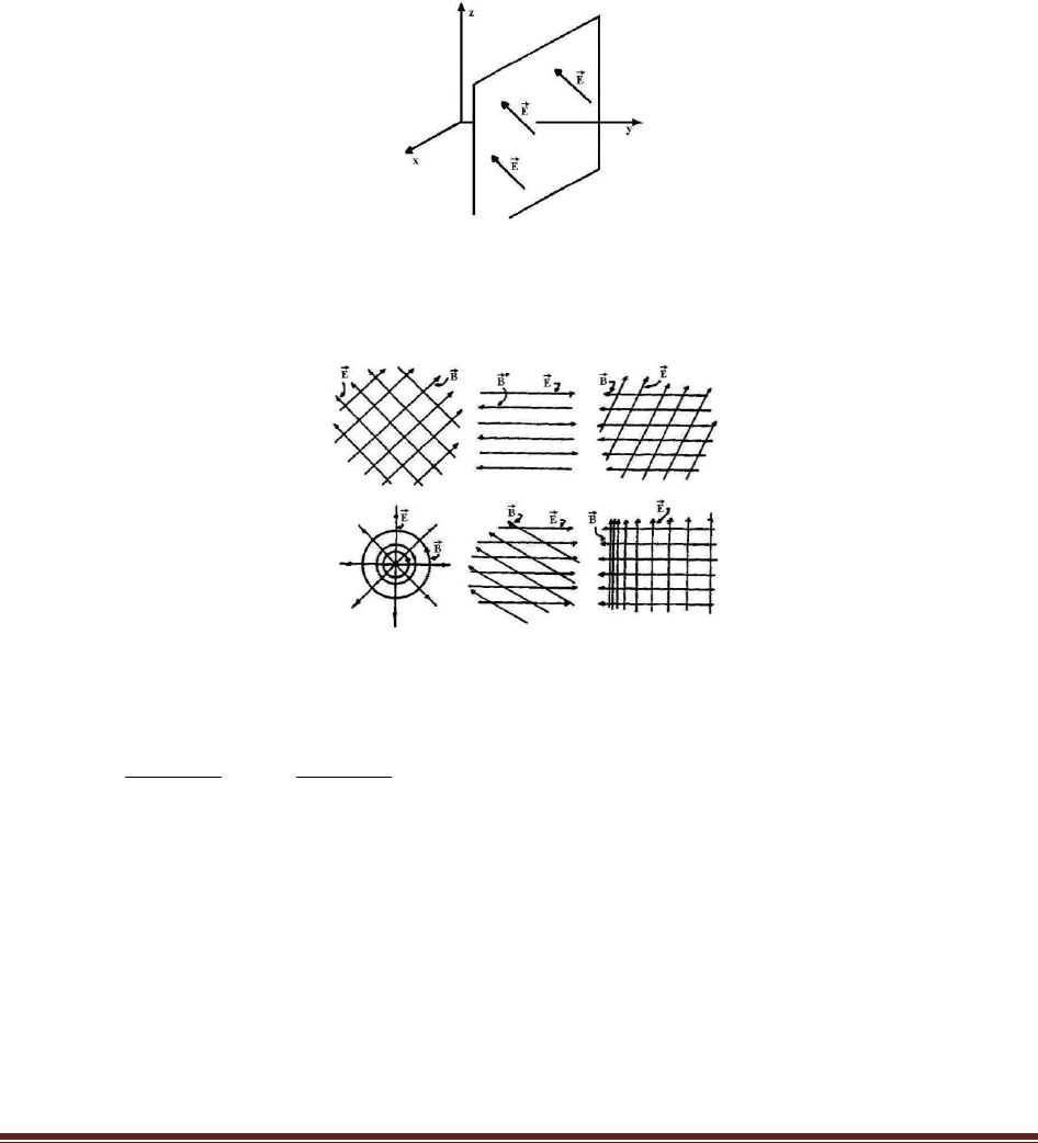 <p>Eletricidade e Magnetismo II - 2º. Semestre 2011</p><p>Lista 5 – Ondas eletromagnéticas 1</p><p>Lista de Exercícios 5 – Ondas eletromagnéticas</p><p>1. Escreva as equações de Maxwell nas formas integral e diferencial e indique como elas são modificadas para</p><p>descrever o campo elétrico e o campo magnético em uma região do espaço onde não existem cargas</p><p>elétricas nem correntes.</p><p>2. É possível haver ondas de campo elétrico sem que haja ondas de campo magnético? Justifique a sua</p><p>resposta.</p><p>3. As flechas da figura representam o vetor campo elétrico de uma onda plana monocromática que se propaga</p><p>para a direita na direção do eixo y. Desenhe, nesta figura, o vetor campo magnético dessa onda.</p><p>4. As figuras abaixo mostram as linhas de campo elétrico e magnético num dado plano. Quais das figuras</p><p>podem corresponder a ondas eletromagnéticas? Nestes casos, qual a direção de propagação da onda?</p><p>5. O campo elétrico de uma onda eletromagnética se propagando no vácuo é dado por E = E0 sen [k(x – ct)]j.</p><p>a) Mostre que esse campo é solução da equação da onda eletromagnética</p><p>2</p><p>2</p><p>002</p><p>2 ),(),(</p><p>t</p><p>txE</p><p>x</p><p>txE yy</p><p></p><p></p><p></p><p></p><p></p><p> .</p><p>b) Determine o comprimento de onda, a freqüência e a velocidade de propagação dessa onda.</p><p>c) Qual o tipo de polarização dessa onda?</p><p>d) Usando as equações de Maxwell obtenha a expressão para o campo magnético dessa onda.</p><p>e) Faça um gráfico dos campos elétrico e magnético dessa onda, em função de x, para o instante</p><p>t = T (período dos campos), e indique o comprimento de onda, a direção e o sentido</p><p>de propagação da onda.</p><p>f) Faça gráficos dos campos elétrico e magnético da onda em função do tempo, para x = λ</p><p>(comprimento de onda).</p><p>g) Qual é a potência média por unidade de área transportada pela onda? Qual á direção do fluxo de</p><p>energia?</p><p>h) Escreva a expressão do vetor de Pointyng dessa onda.</p><p>Eletricidade e Magnetismo II - 2º. Semestre 2011</p><p>Lista 5 – Ondas eletromagnéticas 2</p><p>6. Um feixe de luz não polarizada, com velocidade na direção do eixo y, incide sucessivamente sobre dois</p><p>polarizadores, paralelos ao plano xz, com eixos de polarização respectivamente ao longo de x e de z.</p><p>a) Qual a intensidade média da onda depois de atravessar o sistema?</p><p>b) Um terceiro polarizador, formando 30° com o eixo z, é intercalado entre os dois primeiros. Nessa situação,</p><p>qual a intensidade média da onda depois de atravessar o sistema?</p><p>7. Uma onda com campo elétrico dado por E = E0 sen [k(y – ct)]k incide sobre um polarizador disposto</p><p>perpendicularmente ao eixo y e cujo eixo de polarização é paralelo à direção do versor u = cos θ i + sen θ k</p><p>Determine:</p><p>a) o campo elétrico da onda que emerge do polarizador;</p><p>b) a fração da energia da onda que atravessa o polarizador.</p><p>8. Considere a onda resultante da superposição de duas outras cujos campos elétricos obedecem às equações:</p><p>E1 = E0 sen [k(y – ct)]i</p><p>E2 = E0 cos [k(y – ct)]k</p><p>a) Qual o tipo de polarização da onda resultante?</p><p>b) Qual o vetor de Pointyng da onda resultante?</p><p>c) Qual a intensidade média da onda resultante?</p><p>d) Escreva as expressões do campo elétrico e magnético da onda após atravessar um polarizador com</p><p>eixo de polarização na direção do eixo x.</p><p>e) Qual a intensidade média da onda após atravessar o polarizador?</p>