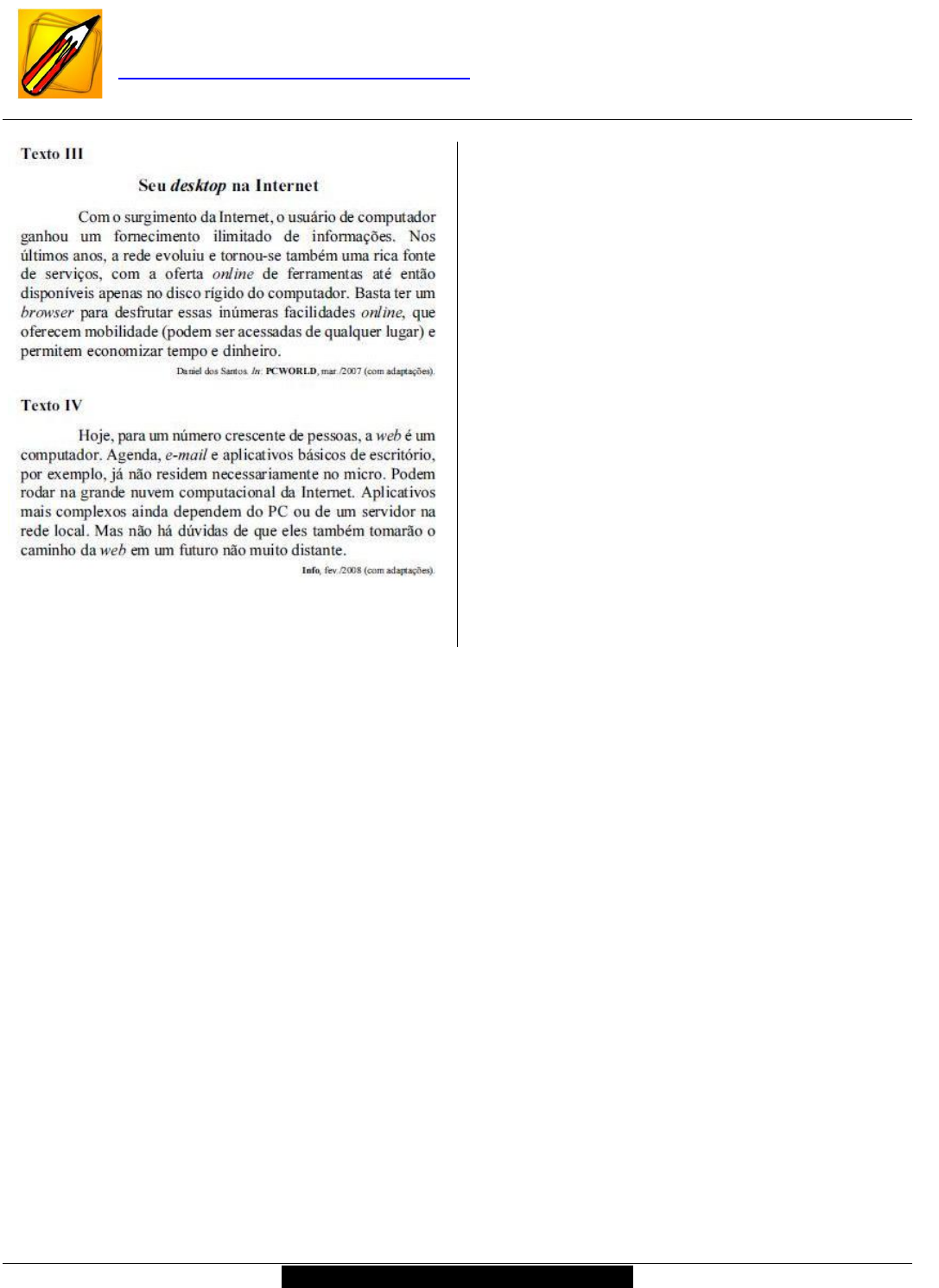 <p>103</p><p>www.1001questoesdeconcurso.com.br</p><p>Quer entrar para lista preferencial para receber mais 1001 QUESTÕES DE CONCURSO</p><p>de outras bancas ou matérias? Sim?! Então, cadastre o seu email no meu site</p><p>www.1001questoesdeconcurso.com.br para receber mais questões e outras surpresas.</p><p>Os textos de I a IV apresentados relatam</p><p>mudanças que vêm ocorrendo na rede</p><p>mundial de computadores, a Internet, e</p><p>anunciam outras que estão por vir nos</p><p>próximos anos. A partir</p><p>desses textos, julgue os itens de 79 a 88.</p><p>O número crescente de pessoas que consideram</p><p>que a "web é um computador", como referido no</p><p>texto IV, se traduz, também, no número</p><p>crescente de computadores denominados zumbis</p><p>conectados na grande rede. Um computador</p><p>zumbi pode ser utilizado para o envio de spam e</p><p>para o ataque a sistemas informatizados</p><p>acessíveis na web. Uma forma de reduzir os</p><p>riscos associados ao fato de o computador do</p><p>usuário estar conectado na Internet é pelo uso de</p><p>software antivírus, como o McAfee e o Avast!, por</p><p>exemplo. O emprego de um firewall, para o</p><p>controle do que entra e do que sai do computador</p><p>em conexões com a web, é outra forma de</p><p>reduzir tais riscos.</p><p>( ) Certo ( ) Errado</p><p>530 - CESPE - 2008 - BANCO DO BRASIL - ESCRITURÁRIO</p><p>104</p><p>www.1001questoesdeconcurso.com.br</p><p>Quer entrar para lista preferencial para receber mais 1001 QUESTÕES DE CONCURSO</p><p>de outras bancas ou matérias? Sim?! Então, cadastre o seu email no meu site</p><p>www.1001questoesdeconcurso.com.br para receber mais questões e outras surpresas.</p><p>A figura acima ilustra uma janela do BrOffice.org Writer, que está sendo usado para a elaboração</p><p>de um documento com algumas informações acerca de aplicativos e dispositivos de informática.</p><p>Considerando essa janela e o texto nela contido, julgue os itens de 71 a 78.</p><p>Considere a seguinte situação hipotética. Para que um cliente acesse os seus dados bancários por meio</p><p>da Internet, o Banco do Brasil, para aumentar a segurança nesse acesso, passou a exigir o cadastramento</p><p>do número MAC da interface de rede do computador utilizado pelo cliente no acesso ao sítio do banco.</p><p>Nessa situação, é correto concluir que, para cada provedor de acesso que o cliente utilize para acessar o</p><p>sítio do banco, novo cadastro deverá ser efetuado, pois, para cada provedor, haverá um número MAC</p><p>específico.</p><p>( ) Certo ( ) Errado</p>