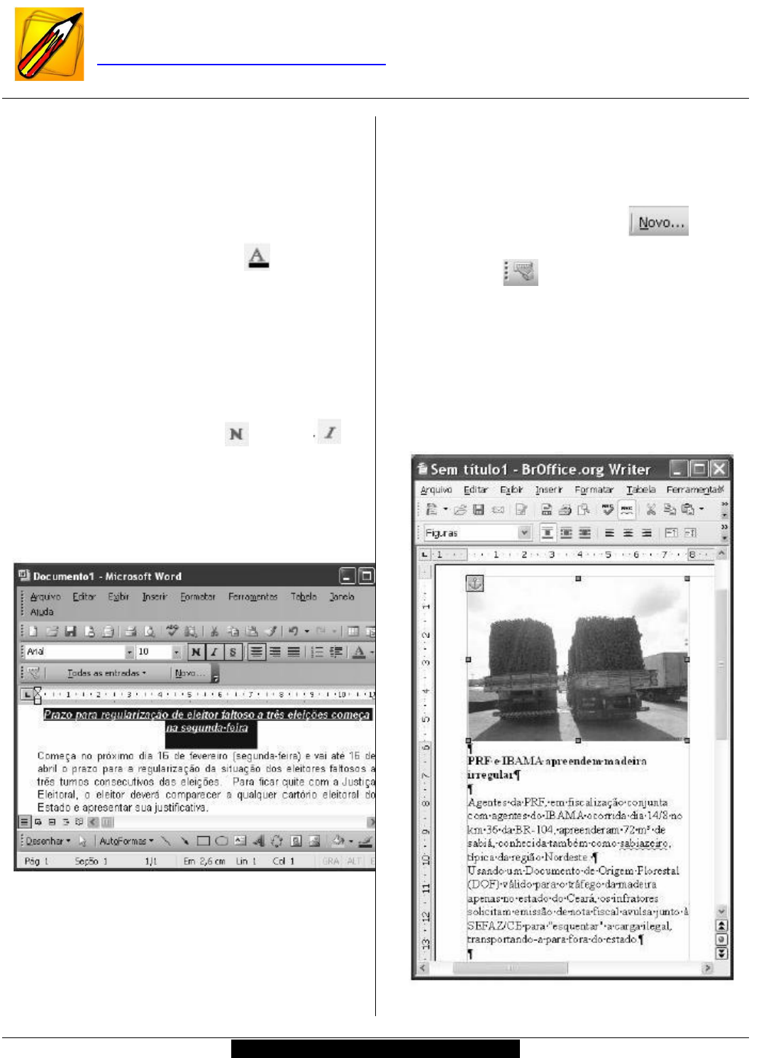 <p>165</p><p>www.1001questoesdeconcurso.com.br</p><p>Quer entrar para lista preferencial para receber mais 1001 QUESTÕES DE CONCURSO</p><p>de outras bancas ou matérias? Sim?! Então, cadastre o seu email no meu site</p><p>www.1001questoesdeconcurso.com.br para receber mais questões e outras surpresas.</p><p>amazônia (...) agência." compõe um único</p><p>parágrafo alinhado à esquerda.</p><p>( ) Certo ( ) Errado</p><p>756 - CESPE - 2004 - BANCO DA AMAZÔNIA -</p><p>TÉCNICO BANCÁRIO</p><p>Ao se selecionar o trecho "Banco da</p><p>Amazônia" e, a seguir, se clicar , todas as</p><p>letras desse trecho serão alteradas para letras</p><p>maiúsculas.</p><p>( ) Certo ( ) Errado</p><p>757 - CESPE - 2004 - BANCO DA AMAZÔNIA -</p><p>TÉCNICO BANCÁRIO</p><p>Considerando que o trecho "01 a 30 de abril</p><p>de 2004" esteja formatado como negrito, ao se</p><p>selecionar esse trecho, clicar e clicar a</p><p>formatação em negrito será retirada e o trecho</p><p>ficará com o estilo de fonte itálico.</p><p>( ) Certo ( ) Errado</p><p>758 - CESPE - 2009 - TRE-MG - TÉCNICO</p><p>JUDICIÁRIO - ÁREA ADMINISTRATIVA</p><p>Considerando a janela do Word 2003 ilustrada</p><p>acima, que contém um documento em</p><p>processo de edição no qual o título está</p><p>selecionado, assinale a opção correta.</p><p>a) O parágrafo que se inicia com a palavra</p><p>"Começa" está formatado com alinhamento à</p><p>esquerda.</p><p>b) O documento em edição possui duas páginas</p><p>e está formatado para uma única coluna.</p><p>c) O título do texto está formatado com fonte</p><p>Arial, tamanho 10, em negrito e itálico, e está</p><p>sublinhado e centralizado.</p><p>d) Ao se clicar a ferramenta , será</p><p>aberta uma nova página em branco.</p><p>e) ferramenta , quando clicada, permite</p><p>ativar a opção de letra maiúscula e minúscula.</p><p>759 - CESPE - 2008 - PRF - POLICIAL</p><p>RODOVIÁRIO FEDERAL</p><p>A figura a seguir ilustra uma janela do aplicativo</p><p>BrOffice.org</p><p>Writer 2.4, que está sendo usado para a</p><p>elaboração de um documento</p><p>166</p><p>www.1001questoesdeconcurso.com.br</p><p>Quer entrar para lista preferencial para receber mais 1001 QUESTÕES DE CONCURSO</p><p>de outras bancas ou matérias? Sim?! Então, cadastre o seu email no meu site</p><p>www.1001questoesdeconcurso.com.br para receber mais questões e outras surpresas.</p><p>Com relação à janela do BrOffice.org Writer</p><p>2.4 mostrada no texto, assinale a opção</p><p>correta.</p><p>a) A função de distribuição automática de texto</p><p>está ativada, fazendo que a figura inserida no</p><p>documento fique posicionada no início da página.</p><p>b) Ao se clicar sucessivamente a palavra</p><p>"sabiazeiro" e o botão , será mostrada uma</p><p>lista de opções, tal como a ilustrada abaixo.</p><p>c) Há informações suficientes na janela mostrada</p><p>para se concluir corretamente que a página na</p><p>qual o documento está sendo editado está</p><p>configurada para largura de aproximadamente 8</p><p>cm.</p><p>d) No menu , encontra-se opção que</p><p>permite configurar a página para duas colunas, e</p><p>essa opção pode ter sido usada no documento</p><p>em edição.</p><p>e) Por meio do conjunto de botões , é</p><p>possível alterar o espaçamento entre as linhas de</p><p>um parágrafo do documento em edição que</p><p>estiverem selecionadas.</p><p>760 - CESPE - 2008 - BANCO DO BRASIL -</p><p>ESCRITURÁRIO</p><p>No que se refere a conceitos de informática,</p><p>hardware e software de processamento de texto,</p><p>julgue os itens a seguir.</p><p>Considere que, na realização de determinado</p><p>procedimento, a janela a seguir tenha sido</p><p>disponibilizada. Nessa situação, é correto</p><p>inferir que ocorreu uma tentativa frustrada de</p><p>se acessar um arquivo de extensão .doc</p><p>contido em A:.</p><p>( ) Certo ( ) Errado</p><p>761 - CESPE - 2008 - BANCO DO BRASIL -</p><p>ESCRITURÁRIO</p><p>No que se refere a conceitos de informática,</p><p>hardware e software de processamento de</p><p>texto, julgue os itens a seguir.</p><p>O tempo destinado à formatação de um</p><p>documento pode ser reduzido, tanto no Word</p><p>quanto no BrOffice.Org Writer, com o uso de</p><p>estilos, que consistem em uma lista de</p><p>configurações de formatos utilizados no</p><p>documento. Nessa lista, define-se a aparência</p><p>dos diferentes tipos de parágrafos, tais como os</p><p>associados, por exemplo, a título, subtítulo e</p><p>texto.</p><p>( ) Certo ( ) Errado</p><p>762 - CESPE - 2008 - BANCO DO BRASIL -</p><p>ESCRITURÁRIO</p><p>O BrOffice.Org Writer é um programa usado</p><p>para a edição de textos, que permite a</p><p>aplicação de diferentes formatos no</p><p>documento em edição, tais como tipo e</p><p>tamanho de letras, impressão em colunas,</p><p>alinhamento automático, entre outros. Esse</p><p>aplicativo também permite a utilização de</p><p>figuras, gráficos e símbolos no documento em</p><p>elaboração.</p><p>( ) Certo ( ) Errado</p><p>763 - CESPE - 2008 - BANCO DO BRASIL -</p><p>ESCRITURÁRIO</p>